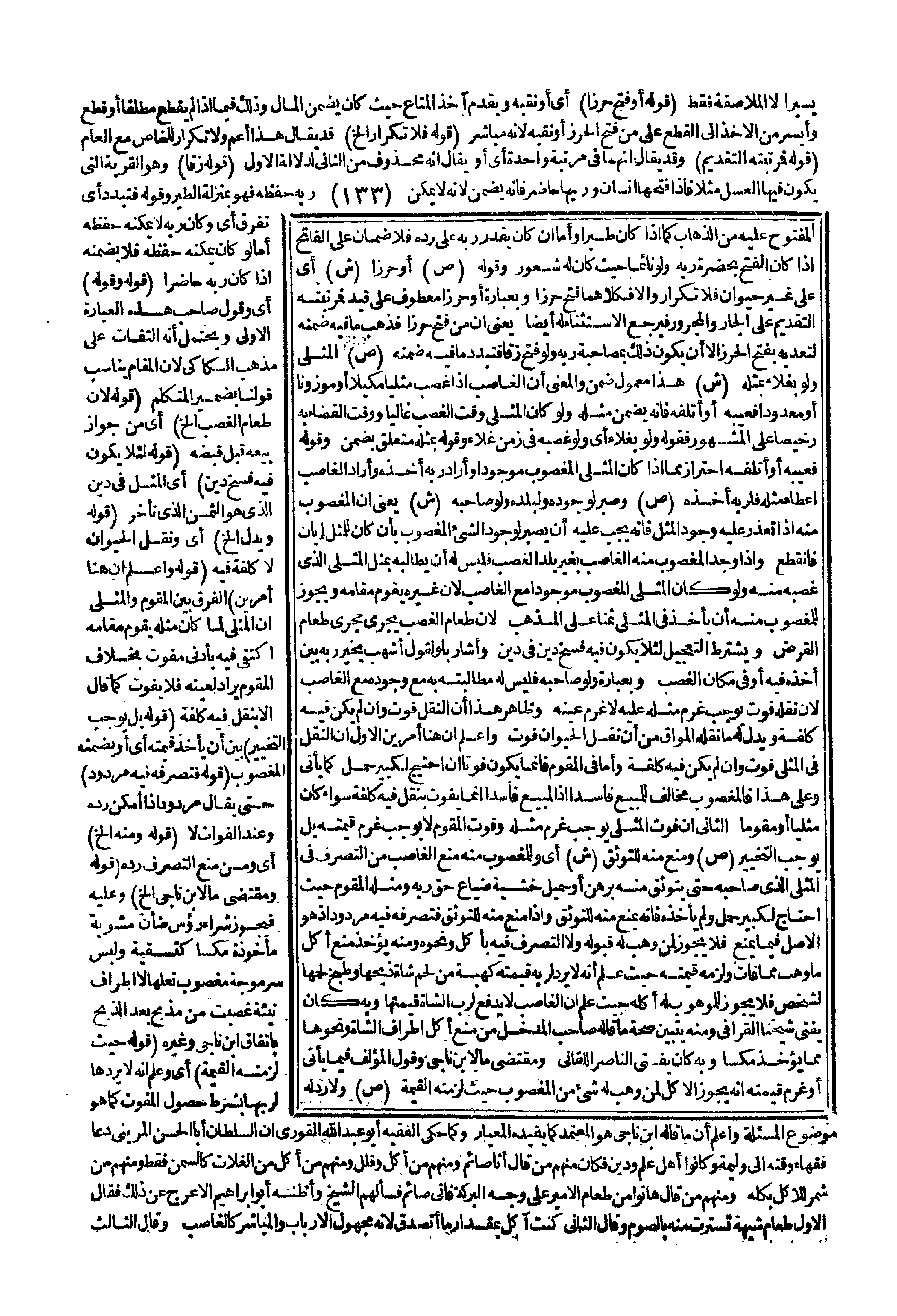 (قَوْلُهُ فَتَصَرُّفُهُ فِيهِ مَرْدُودٌ) حَتَّى يُقَالَ مَرْدُودٌ إذَا أَمْكَنَ رَدُّهُ وَعِنْدَ الْفَوَاتِ لَا (قَوْلُهُ وَمِنْهُ إلَخْ) أَيْ وَمِنْ مَنْعِ التَّصَرُّفِ رَدُّهُ (قَوْلُهُ وَمُقْتَضَى مَا لِابْنِ نَاجِي إلَخْ) وَعَلَيْهِ فَيَجُوزُ شِرَاءُ رُءُوسِ ضَأْنٍ مَشْوِيَّةً مَأْخُوذَةً مَكْسًا كَتَسْقِيَةٍ وَلُبْسِ سُرْمُوجَةٍ مَغْصُوبٍ نَعْلُهَا لَا أَطْرَافٍ نِيئَةٍ غُصِبَتْ مِنْ مَذْبَحٍ بَعْدَ الذَّبْحِ بِاتِّفَاقٍ ابْنُ نَاجِي وَغَيْرُهُ (قَوْلُهُ حَيْثُ لَزِمَتْهُ الْقِيمَةُ) أَيْ وَعَلِمَ أَنَّهُ لَا يَرُدُّهَا لِرَبِّهَا بِشَرْطِ حُصُولِ الْمُفَوِّتِ كَمَا هُوَ مَوْضُوعُ الْمَسْأَلَةِ وَاعْلَمْ أَنَّ مَا قَالَهُ ابْنُ نَاجِي هُوَ الْمُعْتَمَدُ كَمَا يُفِيدُهُ الْمِعْيَارُ وَكَمَا حَكَى الْفَقِيهُ أَبُو عَبْدِ اللَّهِ الْقُورِيُّ أَنَّ السُّلْطَانَ أَبَا الْحَسَنِ الْمَرِينِيَّ دَعَا فُقَهَاءَ وَقْتِهِ إلَى وَلِيمَةٍ وَكَانُوا أَهْلَ عِلْمٍ وَدِينٍ فَكَانَ مِنْهُمْ مَنْ قَالَ أَنَا صَائِمٌ وَمِنْهُمْ مَنْ أَكَلَ وَقَلَّلَ وَمِنْهُمْ مَنْ أَكَلَ مِنْ الْغَلَّاتِ كَالسَّمْنِ فَقَطْ وَمِنْهُمْ مَنْ شَمَّرَ لِلْأَكْلِ بِكُلِّهِ وَمِنْهُمْ مَنْ قَالَ هَاتُوا مِنْ طَعَامِ الْأَمِيرِ عَلَى وَجْهِ الْبَرَكَةِ فَإِنِّي صَائِمٌ فَسَأَلَهُمْ الشَّيْخُ وَأَظُنُّهُ أَبُو إبْرَاهِيمَ الْأَعْرَجُ عَنْ ذَلِكَ فَقَالَ الْأَوَّلُ: طَعَامُ شُبْهَةٍ تَسَتَّرْتُ مِنْهُ بِالصَّوْمِ وَقَالَ الثَّانِي: كُنْتُ آكُلُ بِمِقْدَارِ مَا أَتَصَدَّقُ لِأَنَّهُ مَجْهُولُ الْأَرْبَابِ وَالْمُبَاشِرُ كَالْغَاصِبِ وَقَالَ الثَّالِثُ: