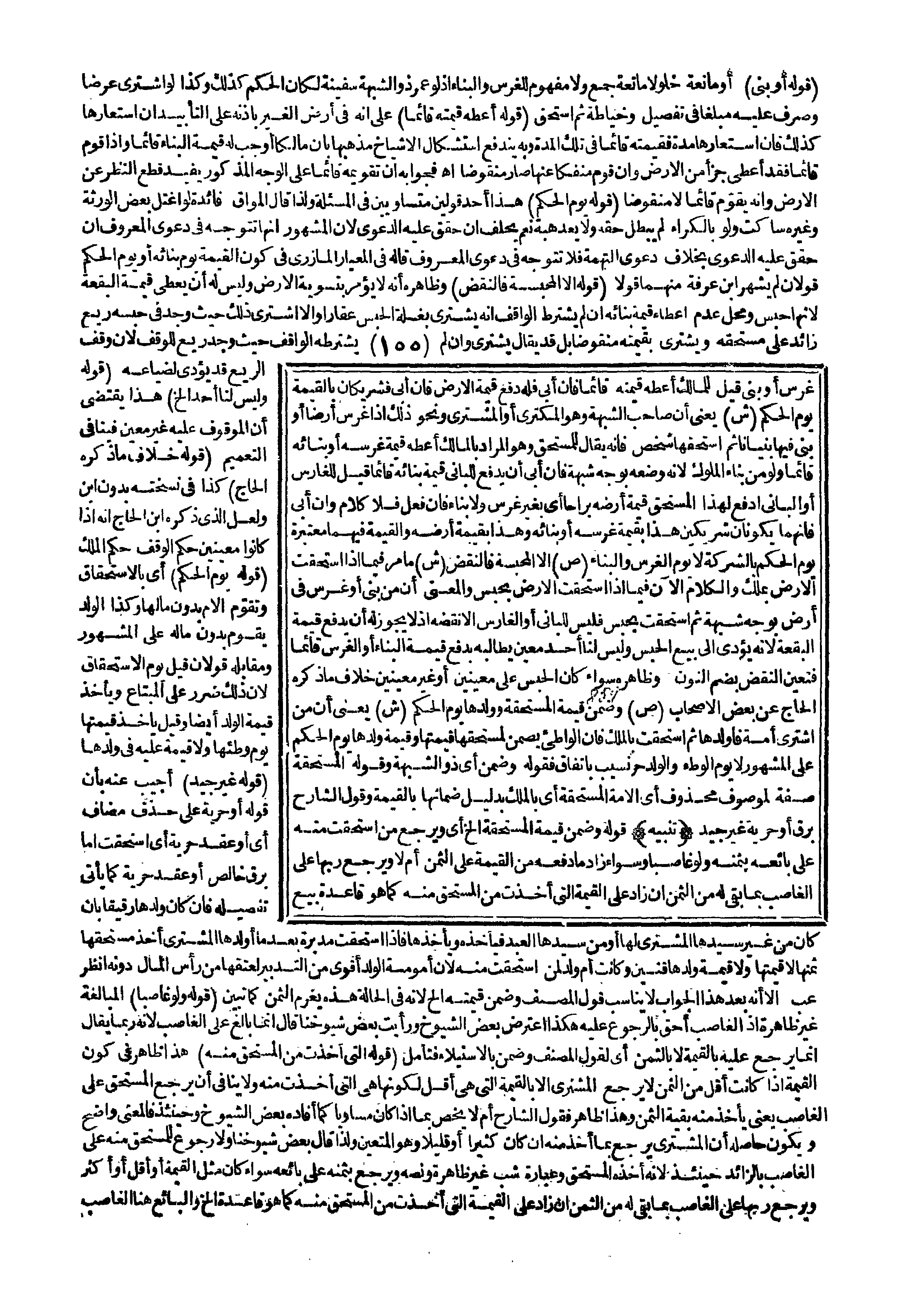ـــــــــــــــــــــــــــــQقَوْلُهُ أَوْ بَنَى) أَوْ مَانِعَةُ خُلُوٍّ لَا مَانِعَةُ جَمْعٍ وَلَا مَفْهُومَ لِلْغَرْسِ وَالْبِنَاءِ إذْ لَوْ عَمَّرَ ذُو الشُّبْهَةِ سَفِينَةً لَكَانَ الْحُكْمُ كَذَلِكَ وَكَذَا لَوْ اشْتَرَى عَرْضًا وَصَرَفَ عَلَيْهِ مَبْلَغًا فِي تَفْصِيلٍ وَخِيَاطَةٍ ثُمَّ اُسْتُحِقَّ (قَوْلُهُ أَعْطِهِ قِيمَتَهُ قَائِمًا) عَلَى أَنَّهُ فِي أَرْضِ الْغَيْرِ بِإِذْنِهِ عَلَى التَّأْبِيدِ إنْ اسْتَعَارَهَا كَذَلِكَ فَإِنْ اسْتَعَارَهَا مُدَّةً فَقِيمَتُهُ قَائِمًا فِي تِلْكَ الْمُدَّةِ، وَبِهِ يَنْدَفِعُ اسْتِشْكَالُ الْأَشْيَاخِ مَذْهَبَهَا بِأَنَّ مَالِكًا أَوْجَبَ لَهُ قِيمَةَ الْبِنَاءِ قَائِمًا وَإِذَا قُوِّمَ قَائِمًا فَقَدْ أَعْطَى جُزْءًا مِنْ الْأَرْضِ وَإِنْ قُوِّمَ مُنْفَكًّا عَنْهَا صَارَ مَنْقُوضًا اهـ. فَجَوَابُهُ أَنَّ تَقْوِيمَهُ قَائِمًا عَلَى الْوَجْهِ الْمَذْكُورِ يُفِيدُ قَطْعَ النَّظَرِ عَنْ الْأَرْضِ وَأَنَّهُ يُقَوَّمُ قَائِمًا لَا مَنْقُوضًا (قَوْلُهُ يَوْمَ الْحُكْمِ) هَذَا أَحَدُ قَوْلَيْنِ مُتَسَاوِيَيْنِ فِي الْمَسْأَلَةِ وَلِذَا قَالَ الْمَوَّاقُ فَائِدَةٌ لَوْ اغْتَلَّ بَعْضُ الْوَرَثَةِ وَغَيْرُهُ سَاكِتٌ وَلَوْ بِالْكِرَاءِ لَمْ يَبْطُلْ حَقُّهُ وَلَا يُعَدُّ هِبَةً نَعَمْ يَحْلِفُ إنْ حَقَّقَ عَلَيْهِ الدَّعْوَى لِأَنَّ الْمَشْهُورَ أَنَّهَا تَتَوَجَّهُ فِي دَعْوَى الْمَعْرُوفِ إنْ حَقَّقَ عَلَيْهِ الدَّعْوَى بِخِلَافِ دَعْوَى التُّهْمَةِ فَلَا تَتَوَجَّهُ فِي دَعْوَى الْمَعْرُوفِ قَالَهُ فِي الْمِعْيَارِ الْمَازِرِيُّ فِي كَوْنِ الْقِيمَةِ يَوْمَ بِنَائِهِ أَوْ يَوْمَ الْحُكْمِ قَوْلَانِ لَمْ يُشْهِرْ ابْنُ عَرَفَةَ مِنْهُمَا قَوْلًا