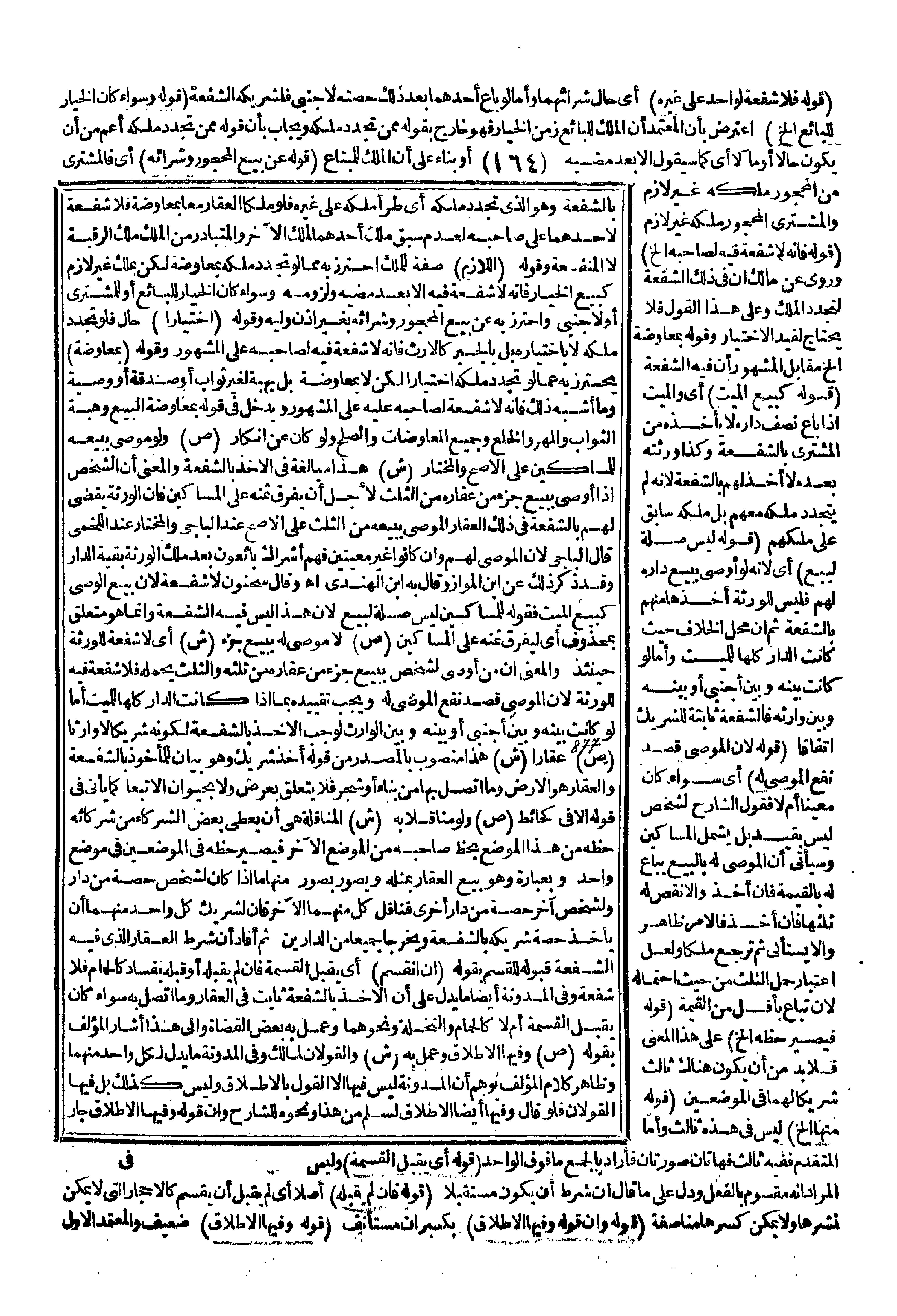 بِالشُّفْعَةِ وَهُوَ الَّذِي تَجَدَّدَ مِلْكُهُ أَيْ طَرَأَ مِلْكُهُ عَلَى غَيْرِهِ فَلَوْ مَلَكَا الْعَقَارَ مَعًا بِمُعَارَضَةٍ فَلَا شُفْعَةَ لِأَحَدِهِمَا عَلَى صَاحِبِهِ لِعَدَمِ سَبْقِ مِلْكِ أَحَدِهِمَا لِمِلْكِ الْآخَرِ وَالْمُتَبَادَرُ مِنْ الْمِلْكِ مِلْكُ الرَّقَبَةِ لَا الْمَنْفَعَةِ وَقَوْلُهُ (اللَّازِمُ) صِفَةٌ لِلْمِلْكِ اُحْتُرِزَ بِهِ مِمَّا لَوْ تَجَدَّدَ بِمُعَاوَضَةٍ لَكِنْ يُمْلَكُ غَيْرُ لَازِمٍ كَبَيْعِ الْخِيَارِ فَإِنَّهُ لَا شُفْعَةَ فِيهِ إلَّا بَعْدَ مُضِيِّهِ وَلُزُومِهِ وَسَوَاءٌ كَانَ الْخِيَارُ لِلْبَائِعِ أَوْ لِلْمُشْتَرِي أَوْ لِأَجْنَبِيٍّ وَاحْتُرِزَ بِهِ عَنْ بَيْعِ الْمَحْجُورِ وَشِرَائِهِ بِغَيْرِ إذْنِ وَلِيِّهِ وَقَوْلُهُ (اخْتِيَارًا) حَالٌ فَلَوْ تَجَدَّدَ مِلْكُهُ لَا بِاخْتِيَارِهِ بَلْ بِالْجَبْرِ كَالْإِرْثِ فَإِنَّهُ لَا شُفْعَةَ فِيهِ لِصَاحِبِهِ عَلَى الْمَشْهُورِ وَقَوْلُهُ (بِمُعَارَضَةٍ) يُحْتَرَزُ بِهِ عَمَّا لَوْ تَجَدَّدَ مِلْكُهُ اخْتِيَارًا لَكِنْ لَا بِمُعَاوَضَةٍ بَلْ بِهِبَةٍ لِغَيْرِ ثَوَابٍ أَوْ صَدَقَةٍ أَوْ وَصِيَّةٍ وَمَا أَشْبَهَ ذَلِكَ فَإِنَّهُ لَا شُفْعَةَ لِصَاحِبِهِ عَلَيْهِ عَلَى الْمَشْهُورِ وَيَدْخُلُ فِي قَوْلِهِ بِمُعَاوَضَةٍ الْبَيْعُ وَهِبَةُ الثَّوَابِ وَالْمَهْرُ وَالْخُلْعُ وَجَمِيعُ الْمُعَاوَضَاتِ وَالصُّلْحُ وَلَوْ كَانَ عَنْ إنْكَارٍ.