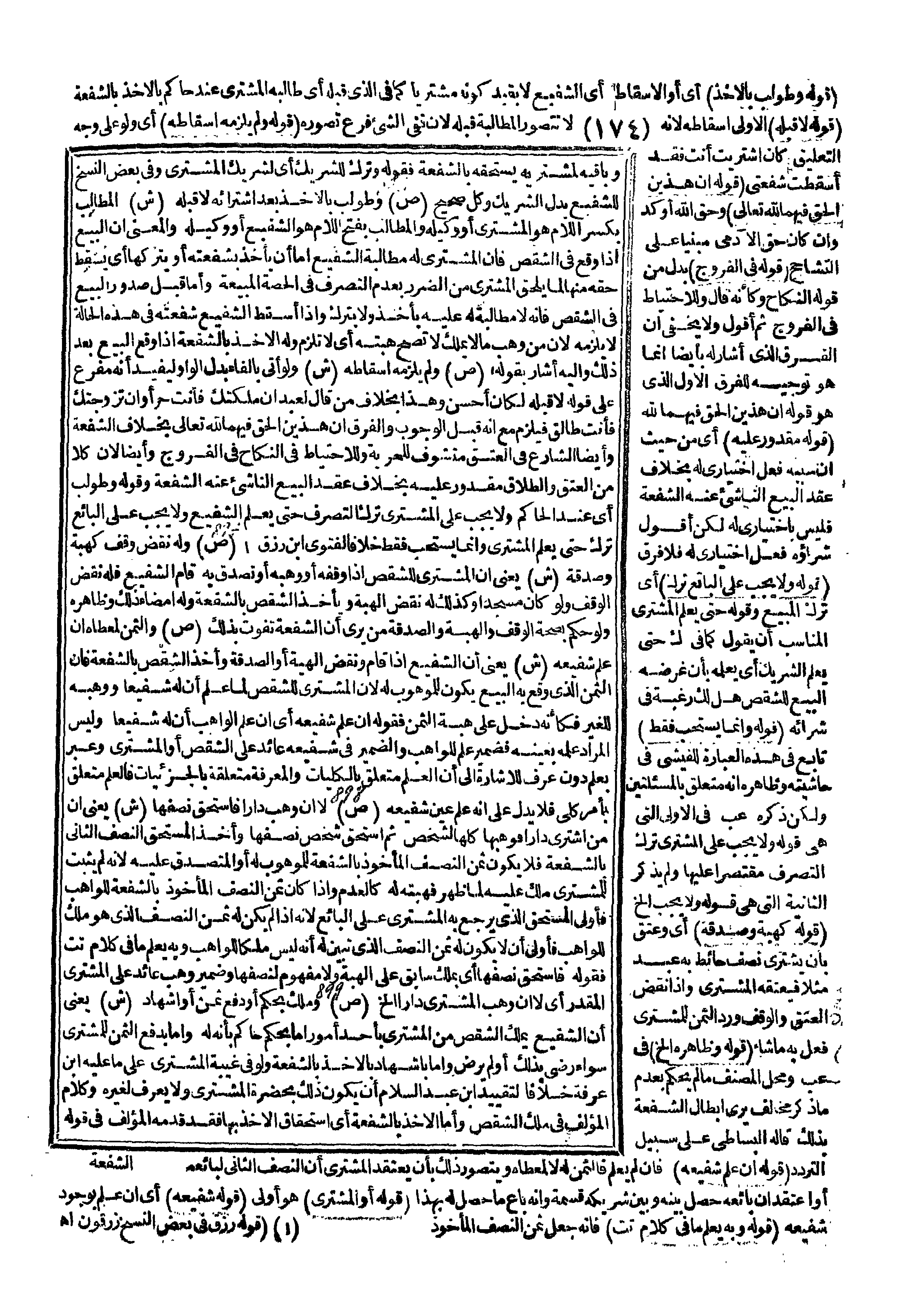 ـــــــــــــــــــــــــــــQ (قَوْلُهُ وَطُولِبَ بِالْأَخْذِ) أَيْ أَوْ الْإِسْقَاطِ أَيْ الشَّفِيعُ لَا يُفِيدُ كَوْنَهُ مُشْتَرِيًا كَمَا فِي الَّذِي قَبْلَهُ أَيْ طَالَبَهُ الْمُشْتَرِي عِنْدَ حَاكِمٍ بِالْأَخْذِ بِالشُّفْعَةِ (قَوْلُهُ لَا قَبْلَهُ) الْأَوْلَى إسْقَاطُهُ لِأَنَّهُ لَا تُتَصَوَّرُ الْمُطَالَبَةُ قَبْلَهُ لِأَنَّ نَفْيَ الشَّيْءِ فَرْعُ تَصَوُّرِهِ (قَوْلُهُ وَلَمْ يَلْزَمْهُ إسْقَاطُهُ) أَيْ وَلَوْ عَلَى وَجْهِ التَّعْلِيقِ كَإِنْ اشْتَرَيْت أَنْتَ فَقَدْ أَسْقَطْت شُفْعَتِي (قَوْلُهُ إنَّ هَذَيْنِ الْحَقُّ فِيهِمَا لِلَّهِ تَعَالَى) وَحَقُّ اللَّهِ أَوْكَدُ وَإِنْ كَانَ حَقُّ الْآدَمِيِّ مَبْنِيًّا عَلَى التَّشَاحُحِ (قَوْلُهُ فِي الْفُرُوجِ) بَدَلٌ مِنْ قَوْلِهِ " النِّكَاحِ " وَكَأَنَّهُ قَالَ وَلِلِاحْتِيَاطِ فِي الْفُرُوجِ ثُمَّ أَقُولُ وَلَا يَخْفَى أَنَّ الْفَرْقَ الَّذِي أَشَارَ بِأَيْضًا إنَّمَا هُوَ تَوْجِيهٌ لِلْفَرْقِ الْأَوَّلِ الَّذِي هُوَ قَوْلُهُ إنَّ هَذَيْنِ الْحَقُّ فِيهِمَا لِلَّهِ (قَوْلُهُ مَقْدُورٌ عَلَيْهِ) أَيْ مِنْ حَيْثُ إنَّ سَبَبَهُ فِعْلٌ اخْتِيَارِيٌّ لَهُ بِخِلَافِ عَقْدِ الْبَيْعِ النَّاشِئِ عَنْهُ الشُّفْعَةُ فَلَيْسَ بِاخْتِيَارِيٍّ لَهُ لَكِنْ أَقُولُ شِرَاؤُهُ فِعْلٌ اخْتِيَارِيٌّ لَهُ فَلَا فَرْقَ (قَوْلُهُ وَلَا يَجِبُ عَلَى الْبَائِعِ تَرْكُ) أَيْ تَرْكُ الْمَبِيعِ وَقَوْلُهُ حَتَّى يُعْلِمَ الْمُشْتَرِيَ الْمُنَاسِبُ أَنْ يَقُولَ كَمَا فِي ك حَتَّى يُعْلِمَ الشَّرِيكَ أَيْ يُعْلِمُهُ بِأَنَّ غَرَضَهُ الْبَيْعُ لِلشِّقْصِ هَلْ لَك رَغْبَةٌ فِي شِرَائِهِ (قَوْلُهُ وَإِنَّمَا يُسْتَحَبُّ فَقَطْ) تَابِعٌ فِي هَذِهِ الْعِبَارَةِ لِلْفِيشِيِّ فِي حَاشِيَتِهِ وَظَاهِرُهُ أَنَّهُ مُتَعَلِّقٌ بِالْمَسْأَلَتَيْنِ وَلَكِنْ ذَكَرَهُ عب فِي الْأُولَى الَّتِي هِيَ قَوْلُهُ وَلَا يَجِبُ عَلَى الْمُشْتَرِي تَرْكُ التَّصَرُّفِ مُقْتَصِرًا عَلَيْهَا وَلَمْ يَذْكُرْ الثَّانِيَةَ الَّتِي هِيَ قَوْلُهُ وَلَا يَجِبُ إلَخْ