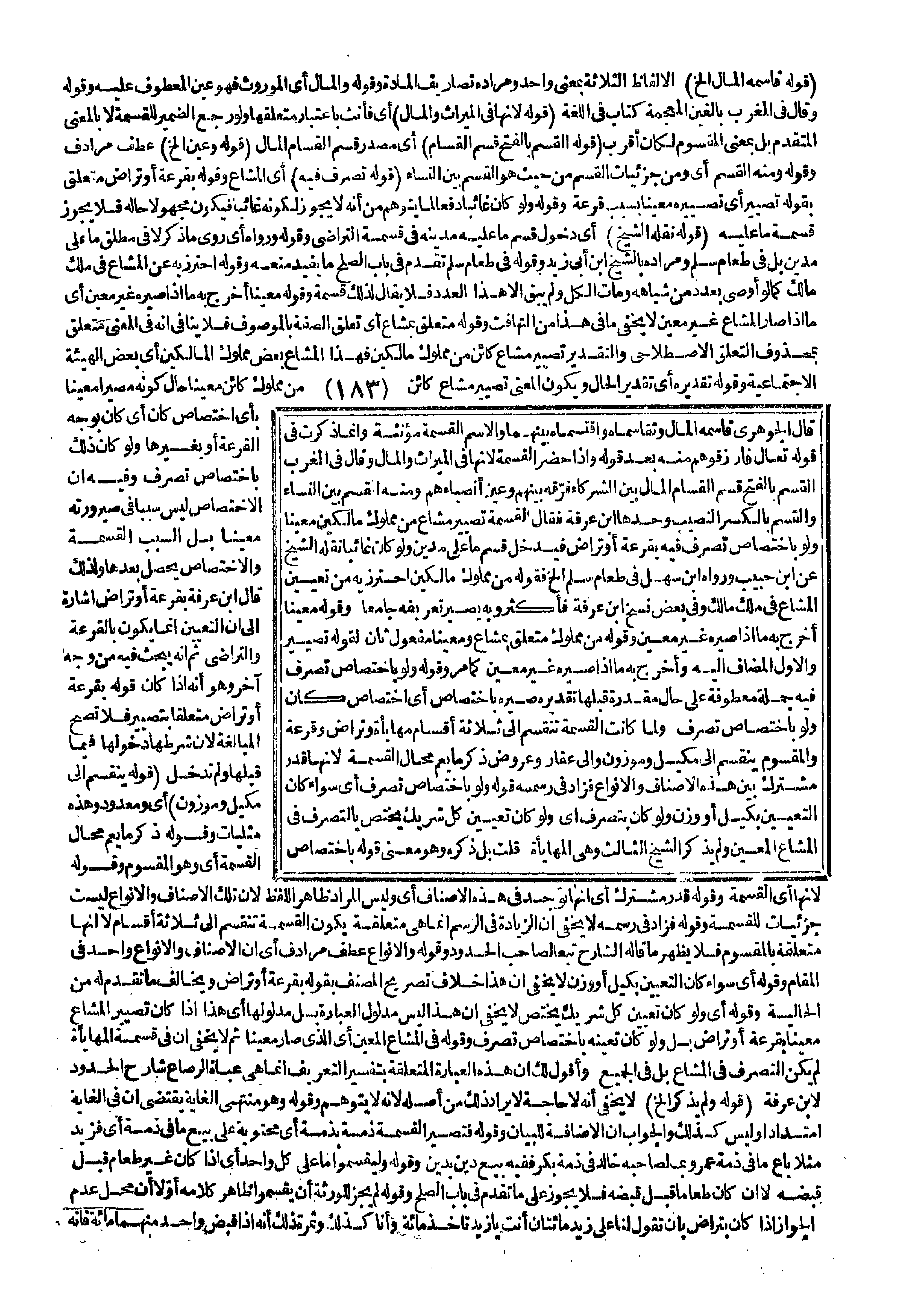 ـــــــــــــــــــــــــــــQقَوْلُهُ قَاسَمَهُ الْمَالَ إلَخْ) الْأَلْفَاظُ الثَّلَاثَةُ بِمَعْنًى وَاحِدٍ وَمُرَادُهُ تَصَارِيفُ الْمَادَّةِ وَقَوْلُهُ وَالْمَالُ أَيْ الْمَوْرُوثُ فَهُوَ عَيْنُ الْمَعْطُوفِ عَلَيْهِ وَقَوْلُهُ وَقَالَ فِي الْمُغْرِبِ بِالْغَيْنِ الْمُعْجَمَةِ كِتَابٌ فِي اللُّغَةِ (قَوْلُهُ لِأَنَّهَا فِي الْمِيرَاثِ وَالْمَالِ) أَيْ فَأَنَّثَ بِاعْتِبَارِ مُتَعَلَّقِهَا وَلَوْ رَجَعَ الضَّمِيرُ لِلْقِسْمَةِ لَا بِالْمَعْنَى الْمُتَقَدِّمِ بَلْ بِمَعْنَى الْمَقْسُومِ لَكَانَ أَقْرَبَ (قَوْلُهُ الْقَسَمُ بِالْفَتْحِ قَسْمُ الْقَسَّامِ) أَيْ مَصْدَرُ قَسَمَ الْقَسَّامُ الْمَالَ (قَوْلُهُ وَعَيَّنَ إلَخْ) عَطْفٌ مُرَادِفٌ وَقَوْلُهُ وَمِنْهُ الْقَسْمُ أَيْ وَمِنْ جُزْئِيَّاتِ الْقَسْمِ مِنْ حَيْثُ هُوَ الْقَسْمُ بَيْنَ النِّسَاءِ (قَوْلُهُ تَصَرُّفٍ فِيهِ) أَيْ الْمُشَاعِ وَقَوْلُهُ بِقُرْعَةٍ أَوْ تَرَاضٍ مُتَعَلِّقٌ بِقَوْلِهِ تَصْيِيرُ أَيْ تَصْيِيرُهُ مُعَيَّنًا بِسَبَبِ قُرْعَةٍ وَقَوْلُهُ وَلَوْ كَانَ غَائِبًا دَفْعًا لِمَا يُتَوَهَّمُ مِنْ أَنَّهُ لَا يَجُوزُ لِكَوْنِهِ غَائِبًا فَيَكُونُ مَجْهُولًا حَالُهُ فَلَا يَجُوزُ قِسْمَةُ مَا عَلَيْهِ (قَوْلُهُ نَقَلَهُ الشَّيْخُ) أَيْ دُخُولَ قَسْمِ مَا عَلَيْهِ مَدِينُهُ فِي قِسْمَةِ التَّرَاضِي وَقَوْلُهُ وَرَوَاهُ أَيْ رَوَى مَا ذُكِرَ لَا فِي مُطْلَقِ مَا عَلَى مَدِينٍ بَلْ فِي طَعَامٍ سُلِّمَ وَمُرَادُهُ بِالشَّيْخِ ابْنُ أَبِي زَيْدٍ وَقَوْلُهُ فِي طَعَامٍ سُلِّمَ تَقَدَّمَ فِي بَابِ الصُّلْحِ مَا يُفِيدُ مَنْعَهُ وَقَوْلُهُ احْتَرَزَ بِهِ عَنْ الْمُشَاعِ فِي مِلْكِ مَالِكٍ كَمَا لَوْ أَوْصَى بِعَدَدٍ مِنْ شِيَاهِهِ وَمَاتَ الْكُلُّ وَلَمْ يَبْقَ إلَّا هَذَا الْعَدَدُ فَلَا يُقَالُ لِذَلِكَ قِسْمَةً وَقَوْلُهُ مُعَيَّنًا أَخْرَجَ بِهِ مَا إذَا صَيَّرَهُ غَيْرَ مُعَيَّنٍ أَيْ مَا إذَا صَارَ الْمُشَاعُ غَيْرَ مُعَيَّنٍ لَا يَخْفَى مَا فِي هَذَا مِنْ التَّهَافُتِ وَقَوْلُهُ مُتَعَلِّقٌ بِمُشَاعٍ أَيْ تَعَلُّقَ الصُّفَّةِ بِالْمَوْصُوفِ فَلَا يُنَافِي أَنَّهُ فِي الْمَعْنَى مُتَعَلِّقٌ بِمَحْذُوفٍ التَّعَلُّقَ الِاصْطِلَاحِيَّ وَالتَّقْدِيرُ تَصْيِيرُ مُشَاعٍ كَائِنٍ مِنْ مَمْلُوكِ مَالِكِينَ فَهَذَا الْمُشَاعُ بَعْضُ مَمْلُوكِ الْمَالِكِينَ أَيْ بَعْضُ الْهَيْئَةِ الِاجْتِمَاعِيَّةِ وَقَوْلُهُ تَقْدِيرُهُ أَيْ تَقْدِيرُ الْحَالِ وَيَكُونُ الْمَعْنَى تَصْيِيرَ مُشَاعٍ كَائِنٍ مِنْ مَمْلُوكٍ كَائِنٍ مُعَيَّنًا حَالَ كَوْنِهِ مُصَيَّرًا مُعَيَّنًا بِأَيِّ اخْتِصَاصٍ كَانَ أَيْ كَانَ بِوَجْهِ الْقُرْعَةِ أَوْ بِغَيْرِهَا وَلَوْ كَانَ ذَلِكَ بِاخْتِصَاصِ تَصَرُّفٍ، وَفِيهِ أَنَّ الِاخْتِصَاصَ لَيْسَ سَبَبًا فِي صَيْرُورَتِهِ مُعَيَّنًا بَلْ السَّبَبُ الْقِسْمَةُ، وَالِاخْتِصَاصُ يَحْصُلُ بَعْدَهَا وَلِذَلِكَ قَالَ ابْنُ عَرَفَةَ بِقُرْعَةٍ أَوْ تَرَاضٍ إشَارَةً إلَى أَنَّ التَّعْيِينَ إنَّمَا يَكُونُ بِالْقُرْعَةِ وَالتَّرَاضِي، ثُمَّ إنَّهُ يَبْحَثُ فِيهِ مِنْ وَجْهٍ آخَرَ وَهُوَ أَنَّهُ إذَا كَانَ قَوْلُهُ بِقُرْعَةٍ أَوْ تَرَاضٍ مُتَعَلِّقًا بِ " تَصْيِيرُ " فَلَا تَصِحُّ الْمُبَالَغَةُ لِأَنَّ شَرْطَهَا دُخُولُهَا فِيمَا قَبْلَهَا وَلَمْ تَدْخُلْ (قَوْلُهُ يَنْقَسِمُ إلَى مَكِيلٍ وَمَوْزُونٍ) أَيْ وَمَعْدُودٍ وَهَذِهِ مِثْلِيَّاتٌ وَقَوْلُهُ ذَكَرَ مَا يَعُمُّ مَحَالَّ الْقِسْمَةِ أَيْ وَهُوَ الْمَقْسُومُ وَقَوْلُهُ لِأَنَّهَا أَيْ الْقِسْمَةَ وَقَوْلُهُ قَدْرٌ مُشْتَرَكٌ أَيْ أَنَّهَا تُوجَدُ فِي هَذِهِ الْأَصْنَافِ أَيْ وَلَيْسَ الْمُرَادُ ظَاهِرُ اللَّفْظِ لِأَن