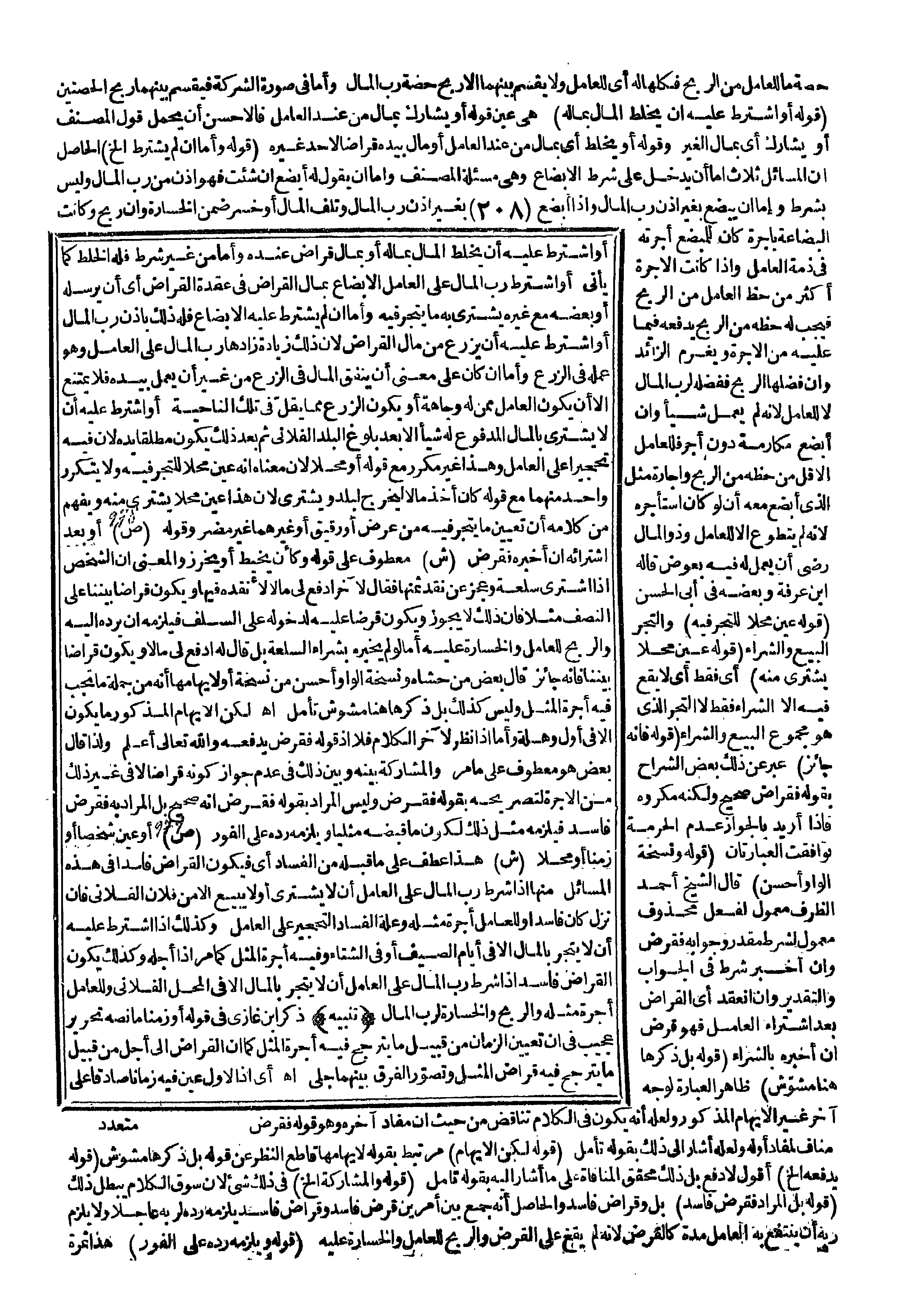 وَقَوْلُهُ (ص) أَوْ بَعْدَ اشْتِرَائِهِ إنْ أَخْبَرَهُ فَقَرْضٌ (ش) مَعْطُوفٌ عَلَى قَوْلِهِ وَكَأَنْ يَخِيطَ أَوْ يَخْرِزَ وَالْمَعْنَى أَنَّ الشَّخْصَ إذَا اشْتَرَى سِلْعَةً وَعَجَزَ عَنْ نَقْدِ ثَمَنِهَا فَقَالَ لِآخَرَ ادْفَعْ لِي مَالًا لِأَنْقُدَهُ فِيهَا وَيَكُونَ قِرَاضًا بَيْنَنَا عَلَى النِّصْفِ مَثَلًا فَإِنَّ ذَلِكَ لَا يَجُوزُ وَيَكُونُ قَرْضًا عَلَيْهِ لِدُخُولِهِ عَلَى السَّلَفِ فَيَلْزَمُهُ أَنْ يَرُدَّهُ إلَيْهِ وَالرِّبْحُ لِلْعَامِلِ وَالْخَسَارَةُ عَلَيْهِ أَمَّا لَوْ لَمْ يُخْبِرْهُ بِشِرَاءِ السِّلْعَةِ بَلْ قَالَ لَهُ ادْفَعْ لِي مَالًا وَيَكُونُ قِرَاضًا بَيْنَنَا فَإِنَّهُ جَائِزٌ قَالَ بَعْضُ مَنْ حَشَّاهُ وَنُسْخَةُ الْوَاوِ أَحْسَنُ مِنْ نُسْخَةِ أَوْ لِإِيهَامِهَا أَنَّهُ مِنْ جُمْلَةِ مَا تَجِبُ فِيهِ أُجْرَةُ الْمِثْلِ وَلَيْسَ كَذَلِكَ بَلْ ذِكْرُهَا هُنَا مُشَوِّشٌ تَأَمَّلْ اهـ. لَكِنَّ الْإِيهَامَ الْمَذْكُورَ مَا يَكُونُ إلَّا فِي أَوَّلِ وَهْلَةٍ، وَأَمَّا إذَا نُظِرَ لِآخِرِ الْكَلَامِ فَلَا إذْ قَوْلُهُ فَقَرْضٌ يَدْفَعُهُ وَاَللَّهُ تَعَالَى أَعْلَمُ. وَلِذَا قَالَ بَعْضٌ هُوَ مَعْطُوفٌ عَلَى مَا مَرَّ وَالْمُشَارَكَةُ بَيْنَهُ وَبَيْنَ ذَلِكَ فِي عَدَمِ جَوَازِ كَوْنِهِ قِرَاضًا لَا فِي غَيْرِ ذَلِكَ مِنْ الْأُجْرَةِ لِتَصْرِيحِهِ بِقَوْلِهِ فَقَرْضٌ وَلَيْسَ الْمُرَادُ بِقَوْلِهِ فَقَرْضٌ أَنَّهُ صَحِيحٌ بَلْ الْمُرَادُ بِهِ فَقَرْضٌ فَاسِدٌ فَيَلْزَمُهُ مِثْلُ ذَلِكَ لِكَوْنِ مَا قَبَضَهُ مِثْلِيًّا وَيَلْزَمُهُ رَدُّهُ عَلَى الْفَوْرِ (ص) أَوْ عَيَّنَ شَخْصًا أَوْ زَمَنًا أَوْ مَحَلًّا (ش) هَذَا عُطِفَ عَلَى مَا قَبْلَهُ مِنْ الْفَسَادِ أَيْ فَيَكُونُ الْقِرَاضُ فَاسِدًا فِي هَذِهِ الْمَسَائِلِ مِنْهَا إذَا شَرَطَ رَبُّ الْمَالِ عَلَى الْعَامِلِ أَنْ لَا يَشْتَرِيَ أَوْ لَا يَبِيعَ إلَّا مِنْ فُلَانٍ الْفُلَانِيِّ فَإِنْ نَزَلَ كَانَ فَاسِدًا وَلِلْعَامِلِ أُجْرَةُ مِثْلِهِ وَعِلَّةُ الْفَسَادِ التَّحْجِيرُ عَلَى الْعَامِلِ وَكَذَلِكَ إذَا اشْتَرَطَ عَلَيْهِ أَنْ لَا يَتَّجِرَ بِالْمَالِ إلَّا فِي أَيَّامِ الصَّيْفِ أَوْ فِي الشِّتَاءِ وَفِيهِ أُجْرَةُ الْمِثْلِ كَمَا مَرَّ إذَا أَجَّلَهُ وَكَذَلِكَ يَكُونُ الْقِرَاضُ فَاسِدًا إذَا شَرَطَ رَبُّ الْمَالِ عَلَى الْعَامِلِ أَنْ لَا يَتَّجِرَ بِالْمَالِ إلَّا فِي الْمَحَلِّ الْفُلَانِيِّ وَلِلْعَامِلِ أُجْرَةُ مِثْلِهِ وَالرِّبْحُ وَالْخَسَارَةُ لِرَبِّ الْمَالِ.
