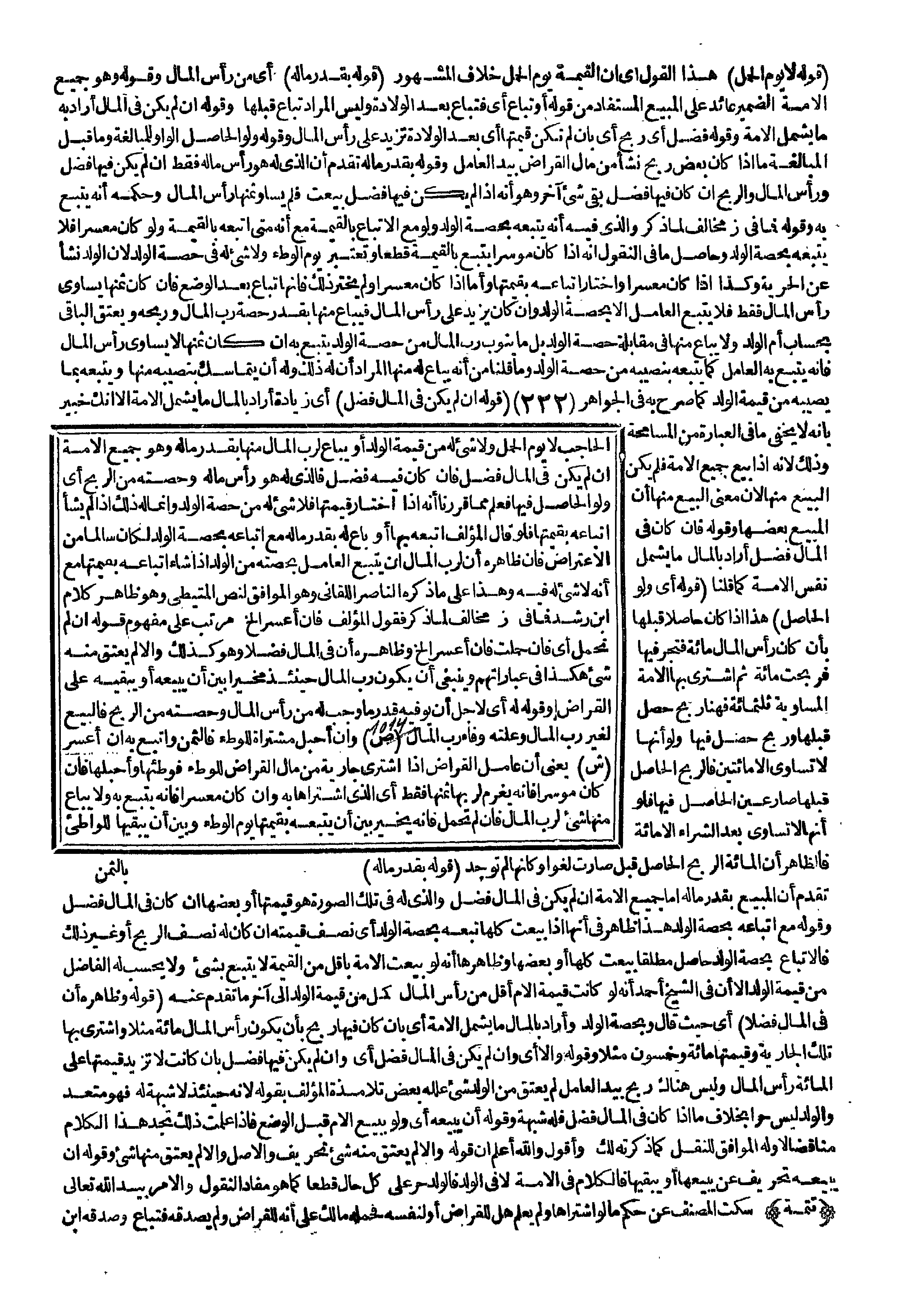 وَمَا قُلْنَا مِنْ أَنَّهُ يُبَاعُ لَهُ مِنْهَا الْمُرَادُ أَنَّ لَهُ ذَلِكَ وَلَهُ أَنْ يَتَمَاسَكَ بِنَصِيبِهِ مِنْهَا وَيَتَّبِعَهُ بِمَا يُصِيبُهُ مِنْ قِيمَةِ الْوَلَدِ كَمَا صَرَّحَ بِهِ فِي الْجَوَاهِرِ (قَوْلُهُ إنْ لَمْ يَكُنْ فِي الْمَالِ فَضْلٌ) أَيْ زِيَادَةٌ أَرَادَ بِالْمَالِ مَا يَشْمَلُ الْأَمَةَ إلَّا أَنَّكَ خَبِيرٌ بِأَنَّهُ لَا يَخْفَى مَا فِي الْعِبَارَةِ مِنْ الْمُسَامَحَةِ وَذَلِكَ لِأَنَّهُ إذَا بِيعَ جَمِيعُ الْأَمَةِ لَمْ يَكُنْ الْبَيْعُ مِنْهَا؛ لِأَنَّ مَعْنَى الْبَيْعِ مِنْهَا أَنَّ الْمَبِيعَ بَعْضُهَا، وَقَوْلُهُ فَإِنْ كَانَ فِي الْمَالِ فَضْلٌ أَرَادَ بِالْمَالِ مَا يَشْمَلُ نَفْسَ الْأَمَةِ كَمَا قُلْنَا (قَوْلُهُ أَيْ، وَلَوْ الْحَاصِلُ) هَذَا إذَا كَانَ حَاصِلًا قَبْلَهَا بِأَنْ كَانَ رَأْسُ الْمَالِ مِائَةً فَتَجَرَ فِيهَا فَرَبِحَتْ مِائَةً ثُمَّ اشْتَرَى بِهَا الْأَمَةَ الْمُسَاوِيَةَ ثَلَثَمِائَةٍ فَهُنَا رِبْحٌ حَصَلَ قَبْلَهَا وَرِبْحٌ حَصَلَ فِيهَا، وَلَوْ أَنَّهَا لَا تُسَاوِي إلَّا مِائَتَيْنِ فَالرِّبْحُ الْحَاصِلُ قَبْلَهَا صَارَ عَيْنَ الْحَاصِلِ فِيهَا فَلَوْ أَنَّهَا لَا تُسَاوِي بَعْدَ الشِّرَاءِ إلَّا مِائَةً فَالظَّاهِرُ أَنَّ الْمِائَةَ الرِّبْحَ الْحَاصِلَ قَبْلُ صَارَتْ لَغْوًا وَكَأَنَّهَا لَمْ تُوجَدْ (قَوْلُهُ بِقَدْرِ مَالَهُ) تَقَدَّمَ أَنَّ الْمَبِيعَ بِقَدْرِ مَالَهُ إمَّا جَمِيعُ الْأَمَةِ إنْ لَمْ يَكُنْ فِي الْمَالِ فَضْلٌ وَاَلَّذِي لَهُ فِي تِلْكَ الصُّورَةِ هُوَ قِيمَتُهَا أَوْ بَعْضُهَا إنْ كَانَ فِي الْمَالِ فَضْلٌ، وَقَوْلُهُ مَعَ اتِّبَاعِهِ بِحِصَّةِ الْوَلَدِ هَذَا ظَاهِرٌ فِي أَنَّهَا إذَا بِيعَتْ كُلُّهَا تَبِعَهُ بِحِصَّةِ الْوَلَدِ أَيْ نِصْفِ قِيمَتِهِ إنْ كَانَ لَهُ نِصْفُ الرِّبْحِ أَوْ غَيْرُ ذَلِكَ فَالِاتِّبَاعُ بِحِصَّةِ الْوَلَدِ حَاصِلٌ مُطْلَقًا بِيعَتْ كُلُّهَا أَوْ بَعْضُهَا وَظَاهِرُهَا أَنَّهُ لَوْ بِيعَتْ الْأَمَةُ بِأَقَلَّ مِنْ الْقِيمَةِ لَا يُتَّبَعُ بِشَيْءٍ وَلَا يُحْسَبُ لَهُ الْفَاضِلُ مِنْ قِيمَةِ الْوَلَدِ إلَّا أَنَّ فِي الشَّيْخِ أَحْمَدَ أَنَّهُ لَوْ كَانَتْ قِيمَةُ الْأُمِّ أَقَلَّ مِنْ رَأْسِ الْمَالِ كُمِّلَ مِنْ قِيمَةِ الْوَلَدِ إلَى آخِرِ مَا تَقَدَّمَ عَنْهُ