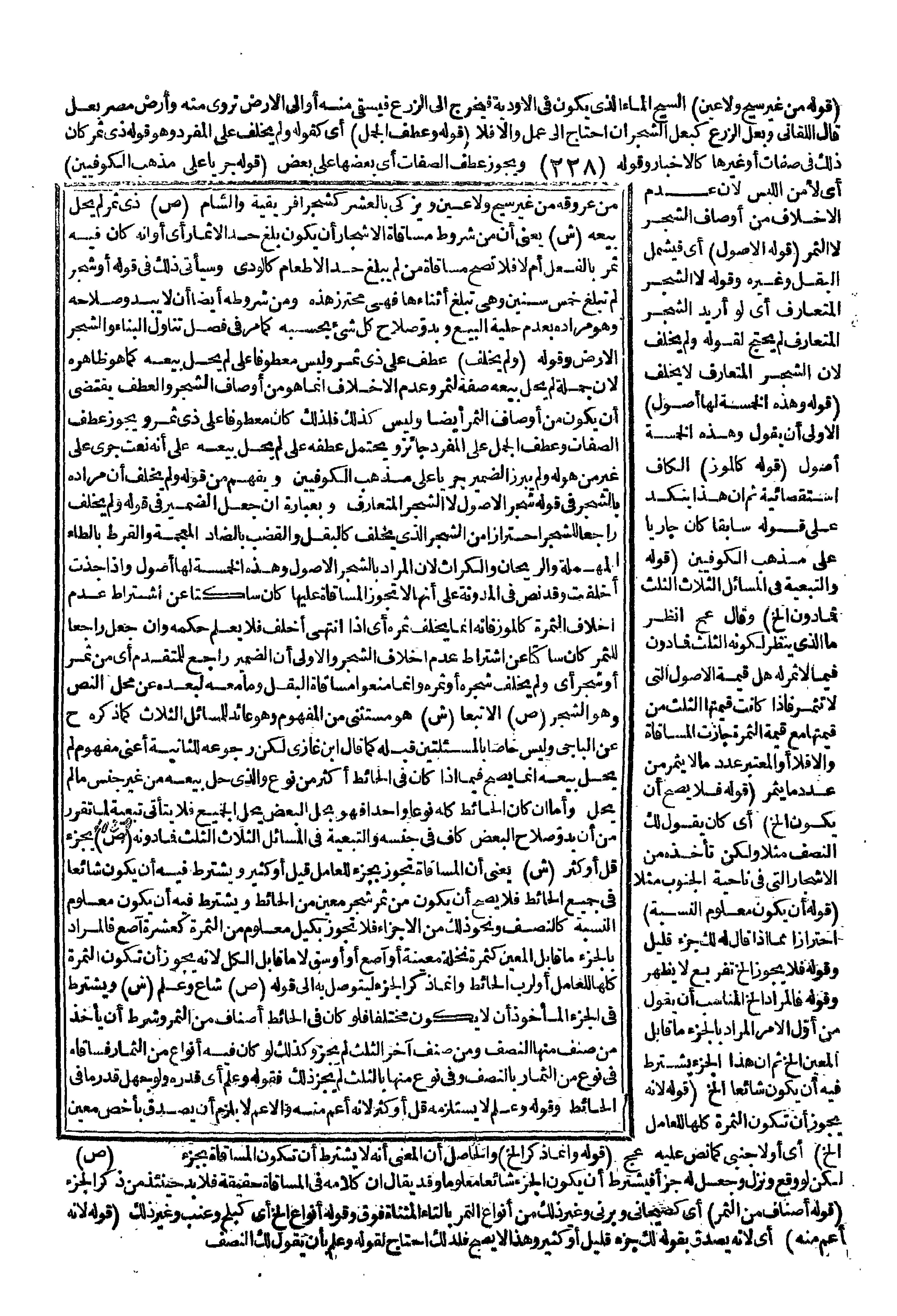 مِنْ عُرُوقِهِ مِنْ غَيْرِ سَيْحٍ وَلَا عَيْنٍ وَيُزَكَّى بِالْعُشْرِ كَشَجَرِ إفْرِيقِيَّةَ وَالشَّامِ (ص) ذِي ثَمَرٍ لَمْ يَحِلَّ بَيْعُهُ (ش) يَعْنِي أَنَّ مِنْ شُرُوطِ مُسَاقَاةِ الْأَشْجَارِ أَنْ يَكُونَ بَلَغَ حَدَّ الْإِثْمَارِ، أَيْ أَوَانَهُ كَانَ فِيهِ ثَمَرٌ بِالْفِعْلِ أَمْ لَا فَلَا تَصِحُّ مُسَاقَاةُ مَنْ لَمْ يَبْلُغْ حَدَّ الْإِطْعَامِ كَالْوَدِيِّ وَسَيَأْتِي ذَلِكَ فِي قَوْلِهِ أَوْ شَجَرٍ لَمْ تَبْلُغْ خَمْسَ سِنِينَ وَهِيَ تَبْلُغُ أَثْنَاءَهَا فَهِيَ مُحْتَرَزُ هَذِهِ وَمِنْ شُرُوطِهِ أَيْضًا أَنْ لَا يَبْدُوَ صَلَاحُهُ وَهُوَ مُرَادُهُ بِعَدَمِ حِلِّيَّةِ الْبَيْعِ وَبُدُوِّ صَلَاحِ كُلِّ شَيْءٍ بِحَسَبِهِ كَمَا مَرَّ فِي فَصْلِ تَنَاوُلِ الْبِنَاءِ وَالشَّجَرِ الْأَرْضَ