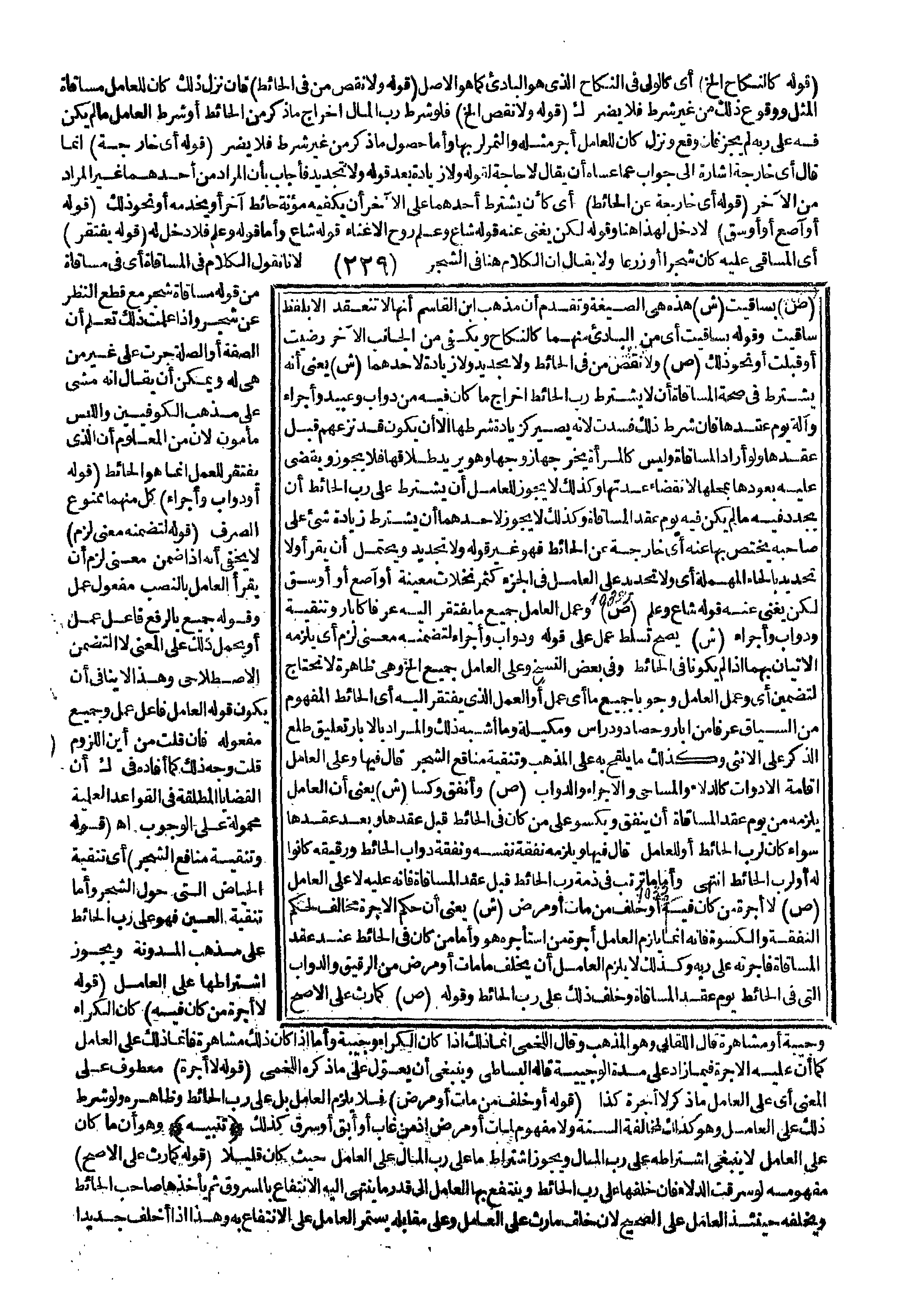 (قَوْلُهُ وَلَا نَقْصِ مَنْ فِي الْحَائِطِ) فَإِنْ نَزَلَ ذَلِكَ كَانَ لِلْعَامِلِ مُسَاقَاةُ الْمِثْلِ وَوُقُوعُ ذَلِكَ مِنْ غَيْرِ شَرْطٍ فَلَا يَضُرُّ (قَوْلُهُ وَلَا نَقْصِ إلَخْ) فَلَوْ شَرَطَ رَبُّ الْمَالِ إخْرَاجَ مَا ذُكِرَ مِنْ الْحَائِطِ أَوْ شَرَطَ الْعَامِلُ مَا لَمْ يَكُنْ فِيهِ عَلَى رَبِّهِ لَمْ يَجُزْ فَإِنْ وَقَعَ وَنَزَلَ كَانَ لِلْعَامِلِ أَجْرُ مِثْلِهِ وَالثَّمَرُ لِرَبِّهَا وَأَمَّا حُصُولُ مَا ذُكِرَ مِنْ غَيْرِ شَرْطٍ فَلَا يَضُرُّ (قَوْلُهُ أَيْ خَارِجَةً) إنَّمَا قَالَ أَيْ خَارِجَةً إشَارَةً إلَى جَوَابٍ عَمَّا عَسَاهُ أَنْ يُقَالَ لَا حَاجَةَ لِقَوْلِهِ وَلَا زِيَادَةَ بَعْدَ قَوْلِهِ وَلَا تَجْدِيدٍ فَأَجَابَ بِأَنَّ الْمُرَادَ مِنْ أَحَدِهِمَا غَيْرُ الْمُرَادِ مِنْ الْآخَرِ (قَوْلُهُ أَيْ خَارِجَةً عَنْ الْحَائِطِ) أَيْ كَأَنْ يَشْتَرِطَ أَحَدُهُمَا عَلَى الْآخَرِ أَنْ يَكْفِيَهُ مُؤْنَةَ حَائِطٍ آخَرَ أَوْ يَخْدُمَهُ أَوْ نَحْوَ ذَلِكَ (قَوْلُهُ أَوْ آصُعَ أَوْ أَوْسُقٍ) لَا دَخْلَ لِهَذَا هُنَا، وَقَوْلُهُ لَكِنْ يُغْنِي عَنْهُ قَوْلُهُ شَاعَ وَعُلِمَ رُوحُ الْإِغْنَاءِ قَوْلُهُ شَاعَ وَأَمَّا قَوْلُهُ وَعُلِمَ فَلَا دَخْلَ لَهُ (قَوْلُهُ يَفْتَقِرُ) أَيْ الْمُسَاقَى عَلَيْهِ كَانَ شَجَرًا أَوْ زَرْعًا وَلَا يُقَالُ إنَّ الْكَلَامَ هُنَا فِي الشَّجَرِ؛ لِأَنَّا نَقُولُ الْكَلَامُ فِي الْمُسَاقَاةِ أَيْ فِي مُسَاقَاةٍ مِنْ قَوْلِهِ مُسَاقَاةُ شَجَرٍ مَعَ قَطْعِ النَّظَرِ عَنْ شَجَرٍ وَإِذَا عَلِمْت ذَلِكَ تَعْلَمُ أَنَّ الصُّفَّةَ أَوْ الصِّلَةَ جَرَتْ عَلَى غَيْرِ مَنْ هِيَ لَهُ وَيُمْكِنُ أَنْ يُقَالَ إنَّهُ مَشَى عَلَى مَذْهَبِ الْكُوفِيِّينَ وَاللَّبْسُ مَأْمُونٌ؛ لِأَنَّ مِنْ الْمَعْلُومِ أَنَّ الَّذِي يَفْتَقِرُ لِلْعَمَلِ إنَّمَا هُوَ الْحَائِطُ (قَوْلُهُ أَوْ دَوَابَّ وَأُجَرَاءَ) كُلٌّ مِنْهُمَا مَمْنُوعُ الصَّرْفِ (قَوْلُهُ لِتَضَمُّنِهِ مَعْنَى لَزِمَ) لَا يَخْفَى أَنَّهُ إذَا ضُمِّنَ مَعْنَى لَزِمَ أَنْ يُقْرَأَ الْعَامِلُ بِالنَّصْبِ مَفْعُولُ عَمِلَ، وَقَوْلُهُ جَمِيعِ بِالرَّفْعِ فَاعِلُ عَمِلَ أَوْ يُحْمَلُ ذَلِكَ عَلَى الْمَعْنَى لَا التَّضَمُّنِ الِاصْطِلَاحِيِّ وَهَذَا لَا يُنَافِي أَنْ يَكُونَ قَوْلُهُ الْعَامِلُ فَاعِلَ عَمِلَ وَجَمِيعَ مَفْعُولَهُ فَإِنْ قُلْت مِنْ أَيْنَ اللُّزُومُ قُلْت وَجْهُ ذَلِكَ كَمَا أَفَادَهُ فِي ك أَنَّ الْقَضَايَا الْمُطْلَقَةَ فِي الْقَوَاعِدِ الْعِلْمِيَّةِ مَحْمُولَةٌ عَلَى الْوُجُوبِ اهـ.