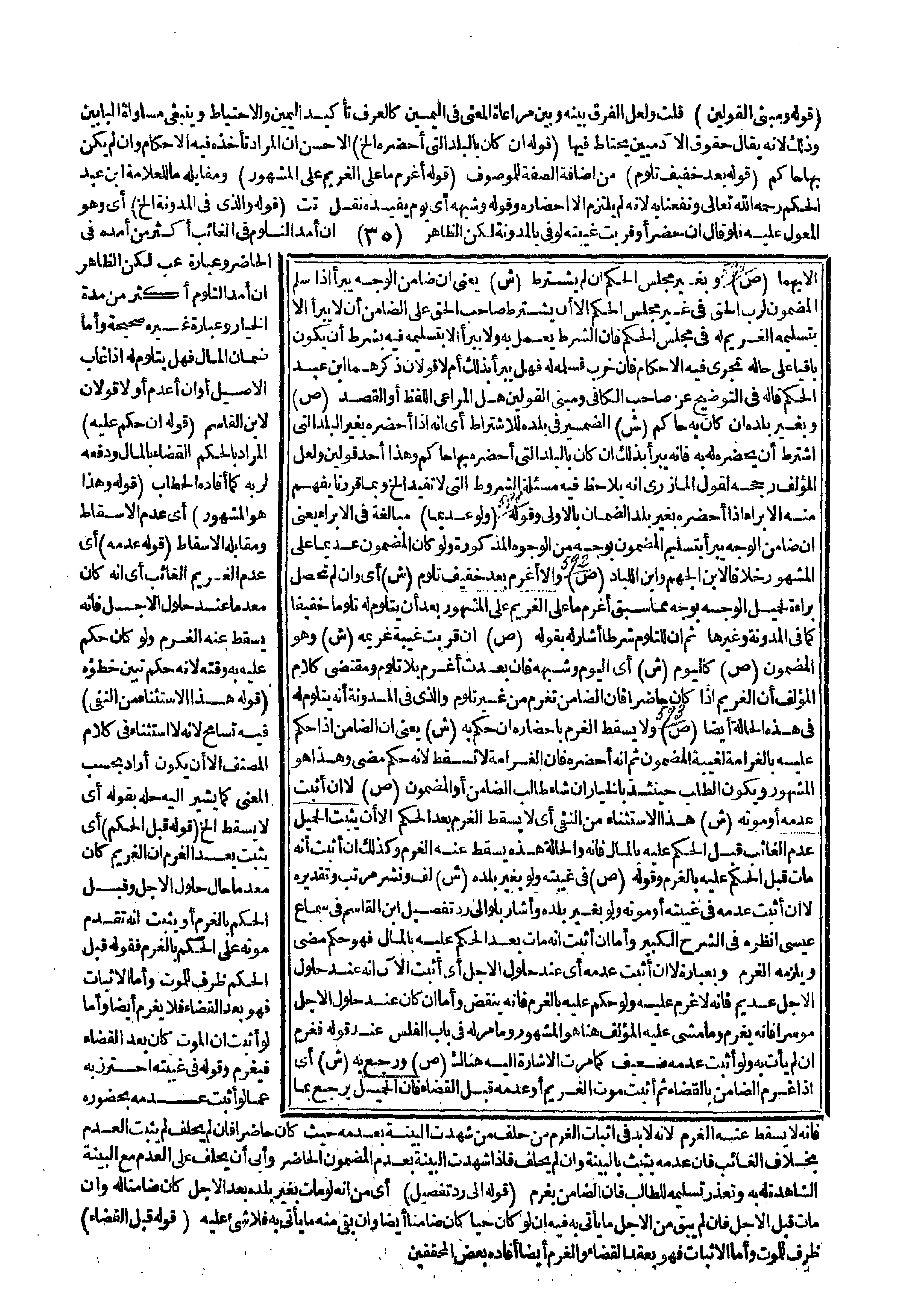 وَقَوْلُهُ (ص) فِي غَيْبَتِهِ وَلَوْ بِغَيْرِ بَلَدِهِ (ش) لَفٌّ وَنَشْرٌ مُرَتَّبٌ وَتَقْدِيرُهُ لَا إنْ أَثْبَتَ عَدَمَهُ فِي غَيْبَتِهِ أَوْ مَوْتِهِ وَلَوْ بِغَيْرِ بَلَدِهِ وَأَشَارَ بِلَوْ إلَى رَدِّ تَفْصِيلِ ابْنِ الْقَاسِمِ فِي سَمَاعِ عِيسَى اُنْظُرْهُ فِي الشَّرْحِ الْكَبِيرِ وَأَمَّا إنْ أَثْبَتَ أَنَّهُ مَاتَ بَعْدَ الْحُكْمِ عَلَيْهِ بِالْمَالِ فَهُوَ حُكْمٌ مَضَى وَيَلْزَمُهُ الْغُرْمُ وَبِعِبَارَةٍ لَا إنْ أَثْبَتَ عَدَمَهُ أَيْ عِنْدَ حُلُولِ الْأَجَلِ أَيْ أَثْبَتَ الْآنَ أَنَّهُ عِنْدَ حُلُولِ الْأَجَلِ عَدِيمٌ فَإِنَّهُ لَا غُرْمَ عَلَيْهِ وَلَوْ حُكِمَ عَلَيْهِ بِالْغُرْمِ فَإِنَّهُ يُنْقَضُ وَأَمَّا إنْ كَانَ عِنْدَ حُلُولِ الْأَجَلِ مُوسِرًا فَإِنَّهُ يَغْرَمُ وَمَا مَشَى عَلَيْهِ الْمُؤَلِّفُ هُنَا هُوَ الْمَشْهُورُ وَمَا مَرَّ لَهُ فِي بَابِ الْفَلَسِ عِنْدَ قَوْلِهِ فَغُرْمٌ إنْ لَمْ يَأْتِ بِهِ وَلَوْ أَثْبَتَ عُدْمَهُ ضَعِيفٌ كَمَا مَرَّتْ الْإِشَارَةُ إلَيْهِ هُنَاكَ