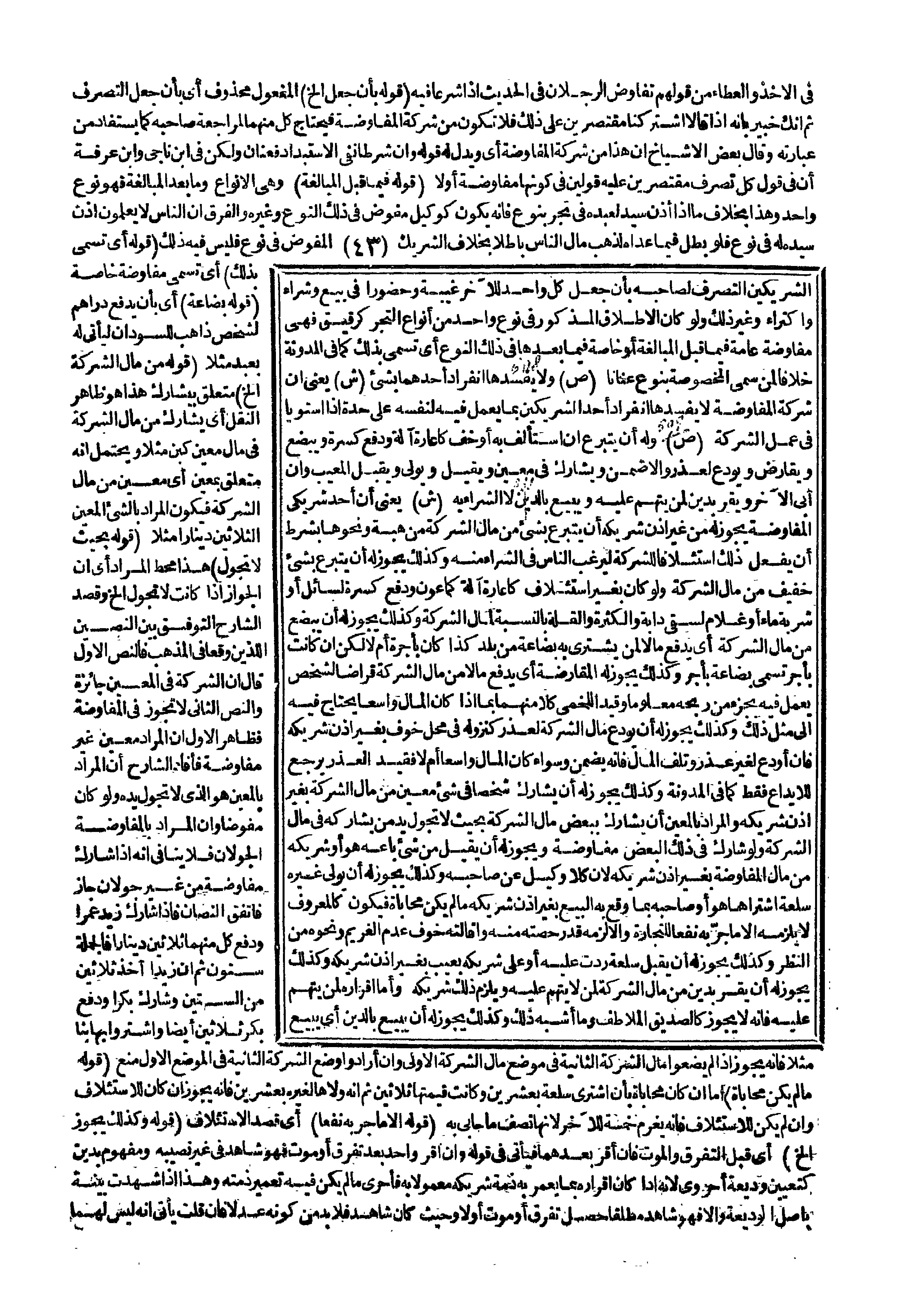 ـــــــــــــــــــــــــــــQفِي الْأَخْذِ وَالْعَطَاءِ مِنْ قَوْلِهِمْ تَفَاوَضَ الرَّجُلَانِ فِي الْحَدِيثِ إذَا شَرَعَا فِيهِ (قَوْلُهُ بِأَنْ جَعَلَ إلَخْ) الْمَفْعُولُ مَحْذُوفٌ أَيْ بِأَنْ جَعَلَ التَّصَرُّفَ ثُمَّ إنَّكَ خَبِيرٌ بِأَنَّهُ إذَا قَالَا اشْتَرَكْنَا مُقْتَصَرَيْنِ عَلَى ذَلِكَ فَلَا تَكُونُ مِنْ شَرِكَةِ الْمُفَاوَضَةِ فَيَحْتَاجُ كُلٌّ مِنْهُمَا لِمُرَاجَعَةِ صَاحِبِهِ كَمَا يُسْتَفَادُ مِنْ عِبَارَتِهِ وَقَالَ بَعْضُ الْأَشْيَاخِ إنَّ هَذَا مِنْ شَرِكَةِ الْمُفَاوَضَةِ أَيْ وَيَدُلُّ قَوْلُهُ وَإِنْ شَرَطَا نَفْيَ الِاسْتِبْدَادِ فَعِنَانٌ وَلَكِنْ فِي ابْنِ نَاجِي وَابْنِ عَرَفَةَ أَنَّ فِي قَوْلِ كُلِّ تَصَرُّفٍ مُقْتَصِرِينَ عَلَيْهِ قَوْلَيْنِ فِي كَوْنِهَا مُفَاوَضَةً أَوْ لَا (قَوْلُهُ فِيمَا قَبْلَ الْمُبَالَغَةِ) وَهِيَ الْأَنْوَاعُ وَمَا بَعْدَ الْمُبَالَغَةِ فَهُوَ نَوْعٌ وَاحِدٌ وَهَذَا بِخِلَافِ مَا إذَا أَذِنَ سَيِّدٌ لِعَبْدِهِ فِي تَجْرٍ بِنَوْعٍ فَإِنَّهُ يَكُونُ كَوَكِيلٍ مُفَوَّضٍ فِي ذَلِكَ النَّوْعِ وَغَيْرِهِ وَالْفَرْقُ أَنَّ النَّاسَ لَا يَعْلَمُونَ إذْنَ سَيِّدِهِ لَهُ فِي نَوْعٍ فَلَوْ بَطَلَ فِيمَا عَدَاهُ لَذَهَبَ مَالُ النَّاسِ بَاطِلًا بِخِلَافِ الشَّرِيكِ الْمُفَوِّضِ فِي نَوْعٍ فَلَيْسَ فِيهِ ذَلِكَ (قَوْلُهُ أَيْ تُسَمَّى بِذَلِكَ) أَيْ تُسَمَّى مُفَاوَضَةً خَاصَّةً.