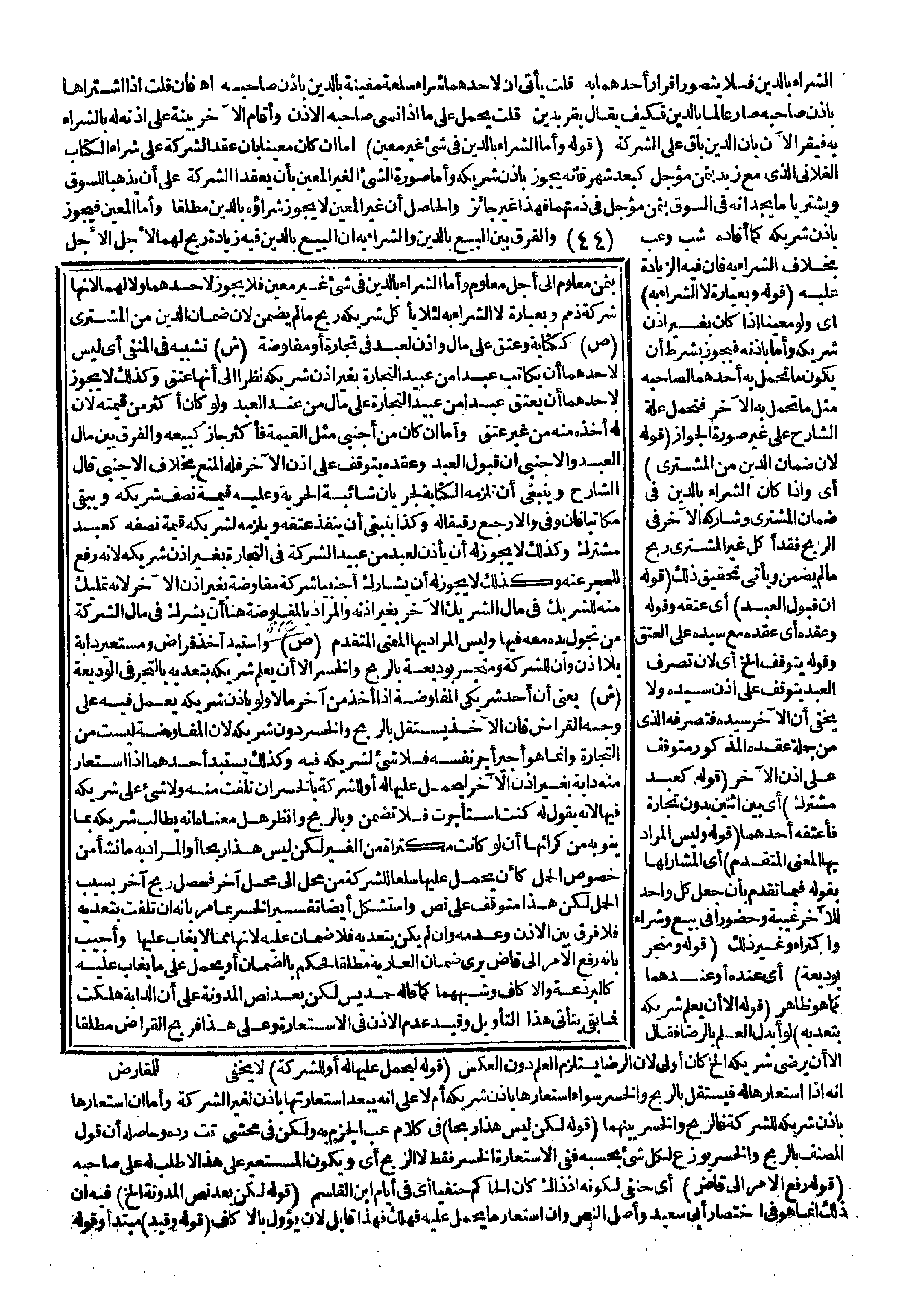 وَالْفَرْقُ بَيْنَ مَالِ الْعَبْدِ وَالْأَجْنَبِيِّ أَنَّ قَبُولَ الْعَبْدِ وَعَقْدِهِ يَتَوَقَّفُ عَلَى إذْنِ الْآخَرِ فَلَهُ الْمَنْعُ بِخِلَافِ الْأَجْنَبِيِّ قَالَ الشَّارِحُ وَيَنْبَغِي أَنْ تَلْزَمَهُ الْكِتَابَةُ لِجَرَيَانِ شَائِبَةِ الْحُرِّيَّةِ وَعَلَيْهِ قِيمَةُ نِصْفِ شَرِيكِهِ وَيَبْقَى مُكَاتَبًا فَإِنْ وَفَّى وَإِلَّا رَجَعَ رَقِيقًا لَهُ وَكَذَا يَنْبَغِي أَنْ يَنْفُذَ عِتْقُهُ وَيَلْزَمُهُ لِشَرِيكِهِ قِيمَةُ نِصْفِهِ كَعَبْدٍ مُشْتَرَكٍ وَكَذَلِكَ لَا يَجُوزُ لَهُ أَنْ يَأْذَنَ لِعَبْدٍ مِنْ عَبِيدِ الشَّرِكَةِ فِي التِّجَارَةِ بِغَيْرِ إذْنِ شَرِيكِهِ لِأَنَّهُ رَفْعٌ لِلْحَجْرِ عَنْهُ وَكَذَلِكَ لَا يَجُوزُ لَهُ أَنْ يُشَارِكَ أَجْنَبِيًّا شَرِكَةَ مُفَاوَضَةٍ بِغَيْرِ إذْنِ الْآخَرِ لِأَنَّهُ تَمْلِيكٌ مِنْهُ لِلشَّرِيكِ فِي مَالِ الشَّرِيكِ الْآخَرِ بِغَيْرِ إذْنِهِ وَالْمُرَادُ بِالْمُفَاوَضَةِ هُنَا أَنْ يُشْرِكَ فِي مَالِ الشَّرِكَةِ مَنْ تَجُولُ يَدُهُ مَعَهُ فِيهَا وَلَيْسَ الْمُرَادُ بِهَا الْمَعْنَى الْمُتَقَدِّمَ.