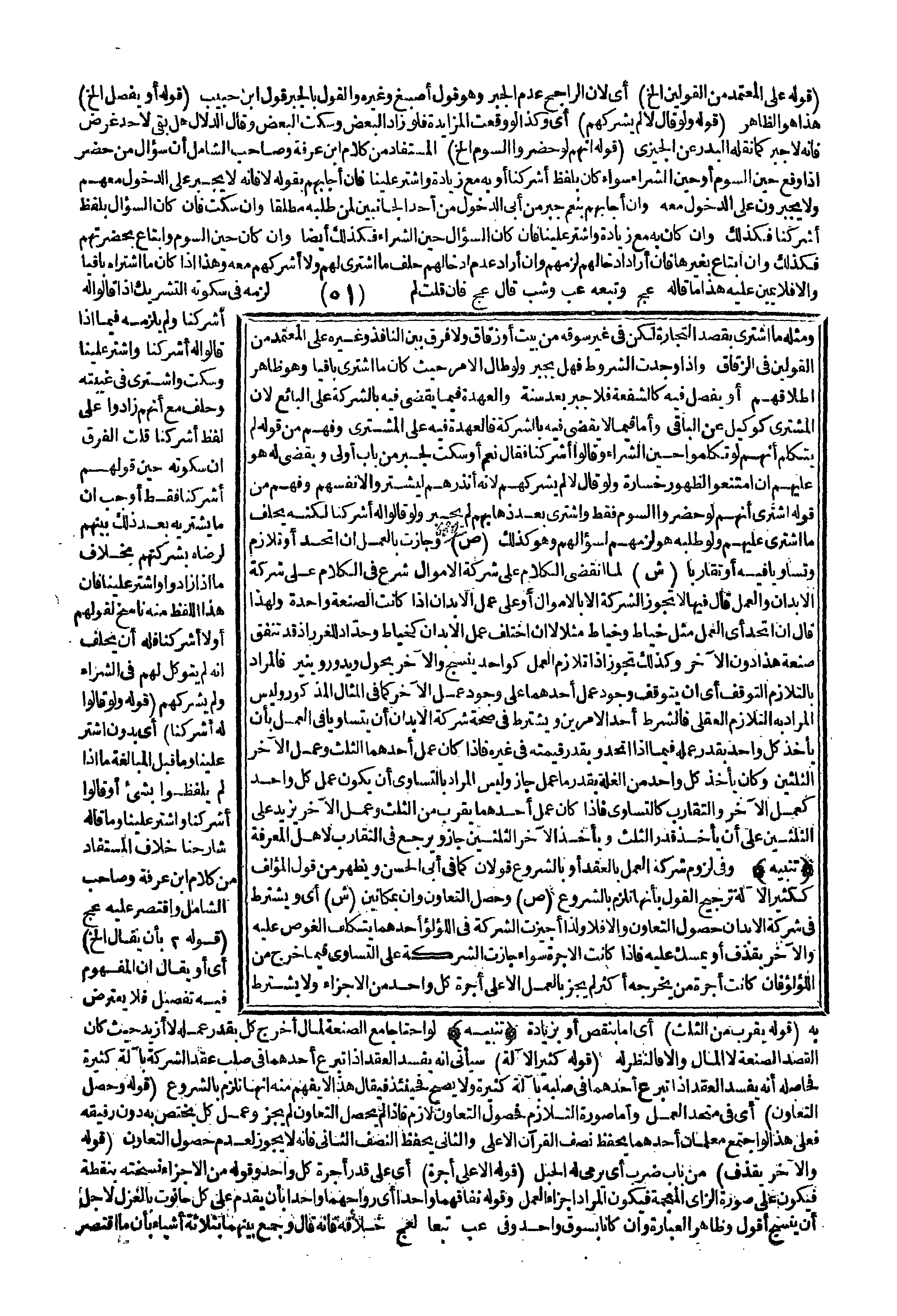 وَمِثْلُهُ مَا اُشْتُرِيَ بِقَصْدِ التِّجَارَةِ لَكِنْ فِي غَيْرِ سُوقِهِ مِنْ بَيْتٍ أَوْ زُقَاقٍ وَلَا فَرْقَ بَيْنَ النَّافِذِ وَغَيْرِهِ عَلَى الْمُعْتَمَدِ مِنْ الْقَوْلَيْنِ فِي الزُّقَاقِ وَإِذَا وُجِدَتْ الشُّرُوطُ فَهَلْ يُجْبَرُ وَلَوْ طَالَ الْأَمْرُ حَيْثُ كَانَ مَا اُشْتُرِيَ بَاقِيًا وَهُوَ ظَاهِرُ إطْلَاقِهِمْ أَوْ يَفْصِلُ فِيهِ كَالشُّفْعَةِ فَلَا جَبْرَ بَعْدَ سَنَةٍ وَالْعُهْدَةُ فِيمَا يَقْضِي فِيهِ بِالشَّرِكَةِ عَلَى الْبَائِعِ لِأَنَّ الْمُشْتَرِيَ كَوَكِيلٍ عَنْ الْبَاقِي وَأَمَّا فِيمَا لَا يَقْضِي فِيهِ بِالشَّرِكَةِ فَالْعُهْدَةُ فِيهِ عَلَى الْمُشْتَرِي وَفُهِمَ مِنْ قَوْلِهِ لَمْ يَتَكَلَّمْ أَنَّهُمْ لَوْ تَكَلَّمُوا حِينَ الشِّرَاءِ وَقَالُوا أَشْرِكْنَا فَقَالَ نَعَمْ أَوْ سَكَتَ لَجُبِرَ مِنْ بَابِ أَوْلَى وَيَقْضِي لَهُ هُوَ عَلَيْهِمْ إنْ امْتَنَعُوا لِظُهُورِ خَسَارَةٍ وَلَوْ قَالَ لَا لَمْ يُشْرِكْهُمْ لِأَنَّهُ أَنْذَرَهُمْ لِيَشْتَرُوا لِأَنْفُسِهِمْ وَفُهِمَ مِنْ قَوْلِهِ اُشْتُرِيَ أَنَّهُمْ لَوْ حَضَرُوا السَّوْمَ فَقَطْ وَاشْتَرَى بَعْدَ ذَهَابِهِمْ لَمْ يُجْبَرْ وَلَوْ قَالُوا لَهُ أَشْرِكْنَا لَكِنَّهُ يَحْلِفُ مَا اشْتَرَى عَلَيْهِمْ وَلَوْ طَلَبَهُ هُوَ لَزِمَهُمْ لِسُؤَالِهِمْ وَهُوَ كَذَلِكَ