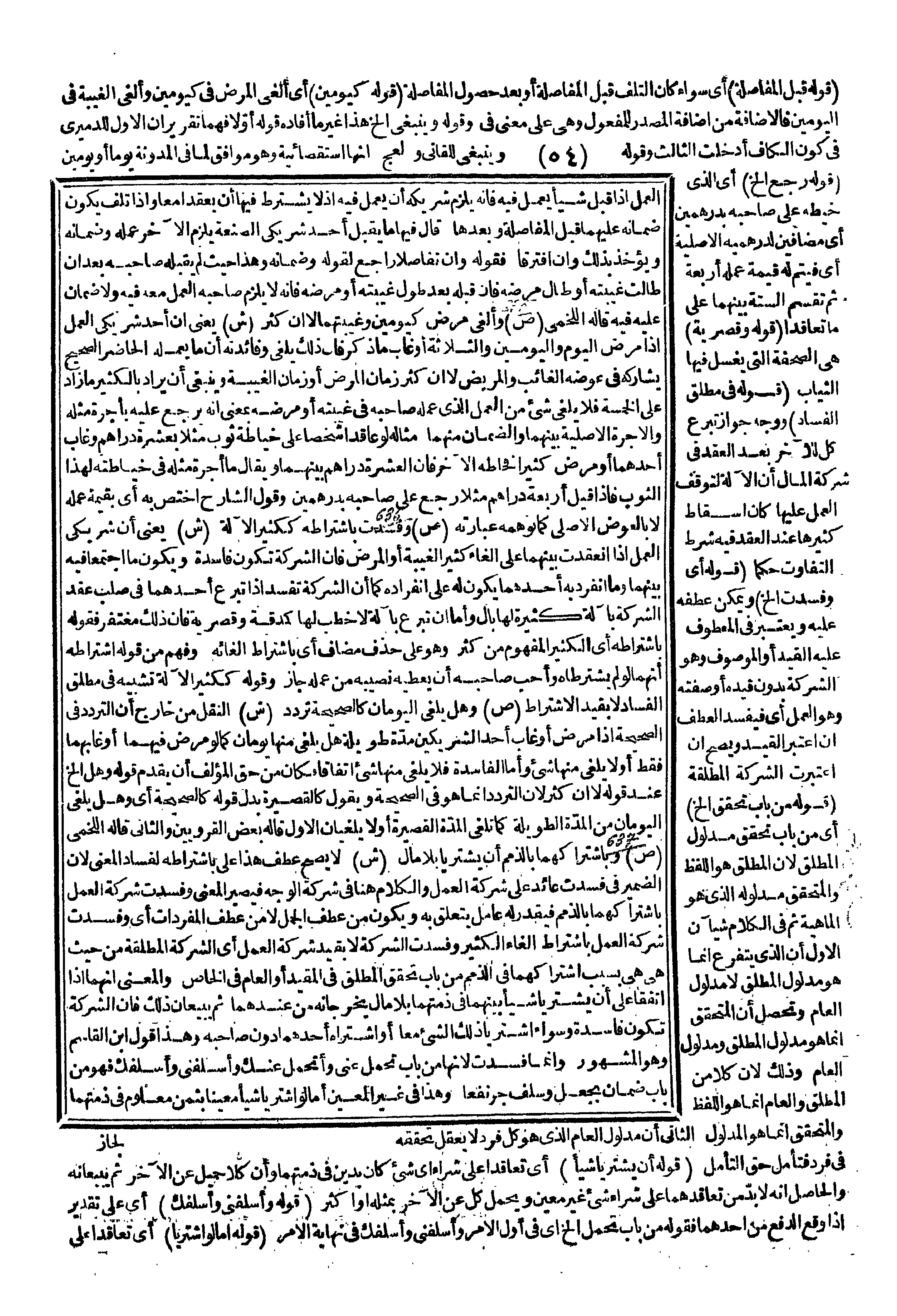 (قَوْلُهُ أَيْ وَفَسَدَتْ إلَخْ) وَيُمْكِنُ عَطْفُهُ عَلَيْهِ وَيُعْتَبَرُ فِي الْمَعْطُوفِ عَلَيْهِ الْقَيْدُ أَوْ الْمَوْصُوفُ وَهُوَ الشَّرِكَةُ بِدُونِ قَيْدِهِ أَوْ صِفَتِهِ وَهُوَ الْعَمَلُ أَيْ فَيَفْسُدُ الْعَطْفُ إنْ اُعْتُبِرَ الْقَيْدُ وَيَصِحُّ إنْ اُعْتُبِرَتْ الشَّرِكَةُ الْمُطْلَقَةُ (قَوْلُهُ مِنْ بَابِ تَحَقُّقِ إلَخْ) أَيْ مِنْ بَابِ تَحَقُّقِ مَدْلُولِ الْمُطْلَقِ لِأَنَّ الْمُطْلَقَ هُوَ اللَّفْظُ وَالْمُتَحَقِّقَ مَدْلُولُهُ الَّذِي هُوَ الْمَاهِيَّةُ ثُمَّ فِي الْكَلَامِ شَيْئَانِ الْأَوَّلُ أَنَّ الَّذِي يَتَفَرَّعُ إنَّمَا هُوَ مَدْلُولُ الْمُطْلَقِ لَا مَدْلُولُ الْعَامِّ وَتَحَصَّلَ أَنَّ الْمُتَحَقِّقَ إنَّمَا هُوَ مَدْلُولُ الْمُطْلَقِ وَمَدْلُولُ الْعَامِّ وَذَلِكَ لِأَنَّ كُلًّا مِنْ الْمُطْلَقِ وَالْعَامِّ إنَّمَا هُوَ اللَّفْظُ وَالْمُتَحَقِّقُ إنَّمَا هُوَ الْمَدْلُولُ الثَّانِي أَنَّ مَدْلُولَ الْعَامِّ الَّذِي هُوَ كُلُّ فَرْدٍ لَا يُعْقَلُ تَحَقُّقُهُ فِي فَرْدٍ فَتَأَمَّلْ حَقَّ التَّأَمُّلِ (قَوْلُهُ أَنْ يَشْتَرِيَا شَيْئًا) أَيْ تَعَاقَدَا عَلَى شِرَاءِ أَيِّ شَيْءٍ كَانَ بِدَيْنٍ فِي ذِمَّتِهِمَا وَأَنَّ كُلًّا حَمِيلٌ عَنْ الْآخَرِ ثُمَّ يَبِيعَانِهِ وَالْحَاصِلُ أَنَّهُ لَا بُدَّ مِنْ تَعَاقُدِهِمَا عَلَى شِرَاءِ شَيْءٍ غَيْرِ مُعَيَّنٍ وَيَحْمِلُ كُلٌّ عَنْ الْآخَرِ بِمِثْلِهِ أَوْ أَكْثَرَ.