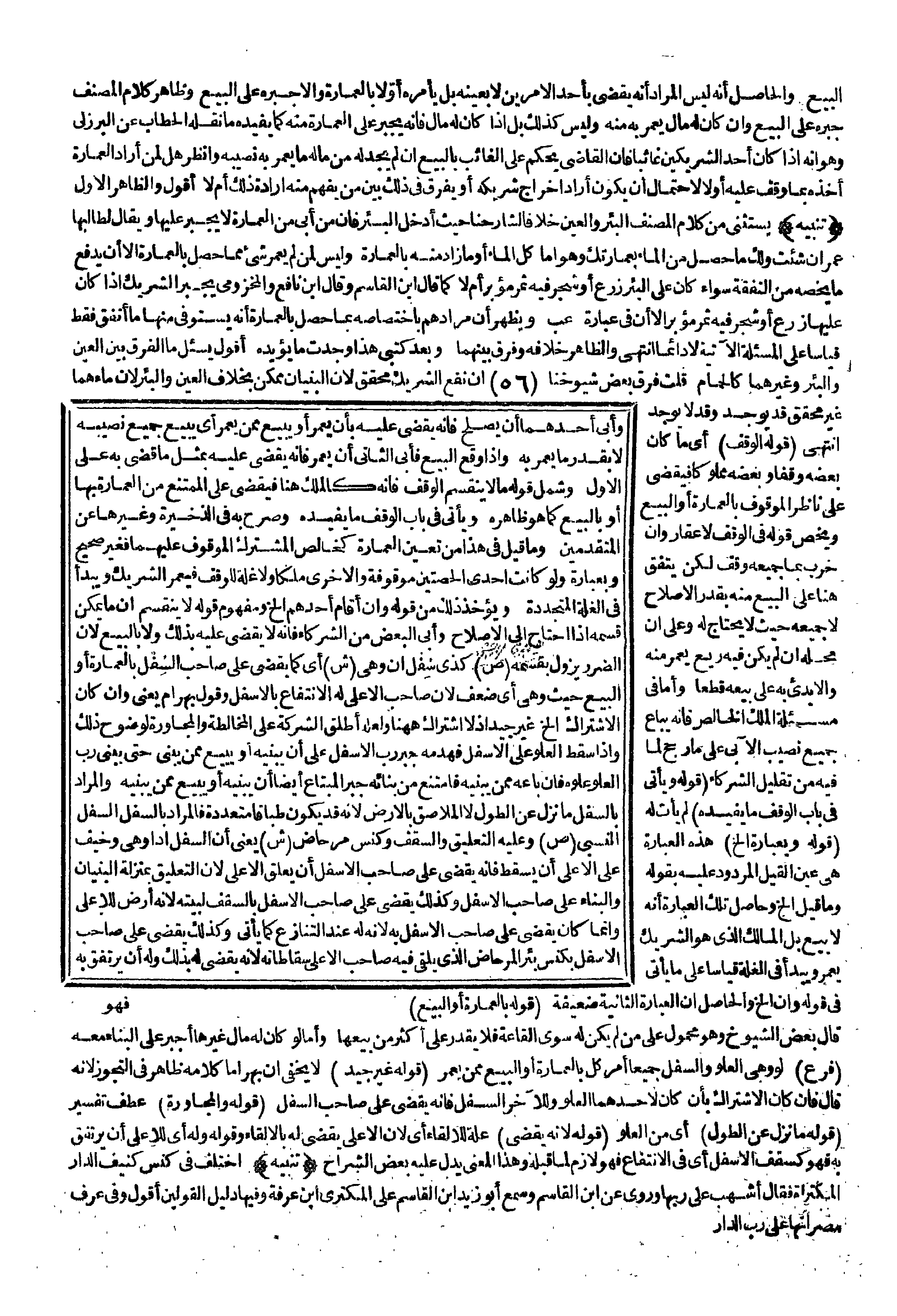 (تَنْبِيهٌ) : يُسْتَثْنَى مِنْ كَلَامِ الْمُصَنِّفِ الْبِئْرُ وَالْعَيْنُ خِلَافًا لِشَارِحِنَا حَيْثُ أَدْخَلَ الْبِئْرَ فَإِنَّ مَنْ أَبَى مِنْ الْعِمَارَةِ لَا يُجْبَرُ عَلَيْهَا وَيُقَالُ لِطَالِبِهَا عَمِّرْ إنْ شِئْت وَلَك مَا حَصَلَ مِنْ الْمَاءِ بِعِمَارَتِك وَهُوَ إمَّا كُلُّ الْمَاءِ أَوْ مَا زَادَ مِنْهُ بِالْعِمَارَةِ وَلَيْسَ لِمَنْ لَمْ يُعَمِّرْ شَيْءٌ مِمَّا حَصَلَ بِالْعِمَارَةِ إلَّا أَنْ يَدْفَعَ مَا يَخُصُّهُ مِنْ النَّفَقَةِ سَوَاءٌ كَانَ عَلَى الْبِئْرِ زَرْعٌ أَوْ شَجَرٌ فِيهِ ثَمَرٌ مُؤَبَّرٌ أَمْ لَا كَمَا قَالَ ابْنُ الْقَاسِمِ وَقَالَ ابْنُ نَافِعٍ وَالْمَخْزُومِيُّ يُجْبَرُ الشَّرِيكُ إذَا كَانَ عَلَيْهَا زَرْعٌ أَوْ شَجَرٌ فِيهِ ثَمَرٌ مُؤَبَّرٌ إلَّا أَنَّ فِي عِبَارَةِ عب وَيَظْهَرُ أَنَّ مُرَادَهُمْ بِاخْتِصَاصِهِ بِمَا حَصَلَ بِالْعِمَارَةِ أَنَّهُ يُسْتَوْفَى مِنْهَا مَا أَنْفَقَ فَقَطْ قِيَاسًا عَلَى الْمَسْأَلَةِ الْآتِيَةِ لَا دَائِمًا انْتَهَى وَالظَّاهِرُ خِلَافُهُ وَفَرَّقَ بَيْنَهُمَا وَبَعْدَ كَتْبِي هَذَا وَجَدْت مَا يُؤَيِّدُهُ أَقُولُ يُسْأَلُ مَا الْفَرْقُ بَيْنَ الْعَيْنِ وَالْبِئْرِ وَغَيْرِهِمَا كَالْحَمَّامِ قُلْت فَرَّقَ بَعْضُ شُيُوخِنَا أَنَّ نَفْعَ الشَّرِيكِ مُحَقَّقٌ لِأَنَّ الْبُنْيَانَ مُمْكِنٌ بِخِلَافِ الْعَيْنِ وَالْبِئْرِ لِأَنَّ مَاءَهُمَا غَيْرُ مُحَقَّقٍ قَدْ يُوجَدُ وَقَدْ لَا يُوجَدُ انْتَهَى (قَوْلُهُ الْوَقْفَ) أَيْ مَا كَانَ بَعْضُهُ وَقْفًا وَبَعْضُهُ مَمْلُوكًا فَيُقْضَى عَلَى نَاظِرِ الْمَوْقُوفِ بِالْعِمَارَةِ أَوْ الْبَيْعِ وَيَخُصُّ قَوْلُهُ فِي الْوَقْفِ لَا عَقَارٌ وَإِنْ خَرِبَ بِمَا جَمِيعُهُ وَقْفٌ لَكِنْ يَتَّفِقُ هُنَا عَلَى الْبَيْعِ مِنْهُ بِقَدْرِ الْإِصْلَاحِ لَا جَمِيعِهِ حَيْثُ لَا يَحْتَاجُ لَهُ وَعَلَى أَنَّ مَحَلَّهُ إنْ لَمْ يَكُنْ فِيهِ رِيعٌ يَعْمُرُ مِنْهُ وَإِلَّا بُدِئَ بِهِ عَلَى يْعِهِ قَطْعًا وَأَمَّا فِي مَسْأَلَةِ الْمِلْكِ الْخَالِصِ فَإِنَّهُ يُبَاعُ جَمِيعُ نَصِيبِ الْآبِي عَلَى مَا رُجِّحَ لِمَا فِيهِ مِنْ تَقْلِيلِ الشُّرَكَاءِ.