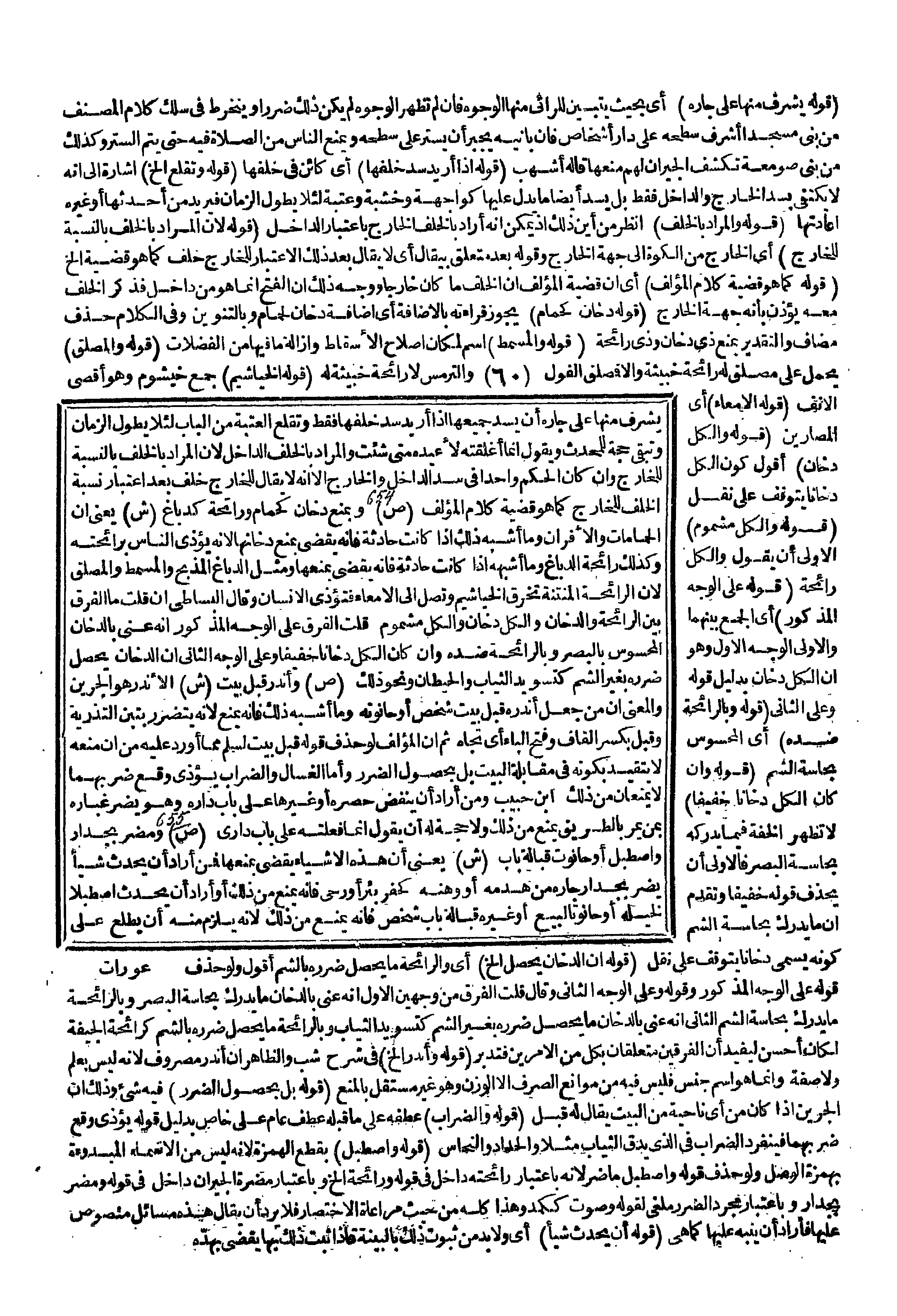 (قَوْلُهُ دُخَانٍ كَحَمَّامٍ) يَجُوزُ قِرَاءَتُهُ بِالْإِضَافَةِ أَيْ إضَافَةِ دُخَانٍ لِحَمَّامٍ وَبِالتَّنْوِينِ وَفِي الْكَلَامِ حَذْفُ مُضَافٍ وَالتَّقْدِيرُ بِمَنْعِ ذِي دُخَانٍ وَذِي رَائِحَةٍ (قَوْلُهُ وَالْمَسْمَطُ) اسْمٌ لِمَكَانِ إصْلَاحِ الْإِسْقَاطِ وَإِزَالَةِ مَا فِيهَا مِنْ الْفَضَلَاتِ (قَوْلُهُ وَالْمَصْلَقُ) يُحْمَلُ عَلَى مَصْلَقٍ لَهُ رَائِحَةٌ خَبِيثَةٌ وَإِلَّا فَمَصْلَقُ الْفُولِ وَالتُّرْمُسِ لَا رَائِحَةَ خَبِيثَةٌ لَهُ (قَوْلُهُ الْخَيَاشِيمَ) جَمْعُ خَيْشُومٍ وَهُوَ أَقْصَى الْأَنْفِ (قَوْلُهُ الْأَمْعَاءِ) أَيْ الْمَصَارِينِ (قَوْلُهُ وَالْكُلُّ دُخَانٌ) أَقُولُ كَوْنُ الْكُلِّ دُخَانًا يَتَوَقَّفُ عَلَى نَقْلٍ (قَوْلُهُ وَالْكُلُّ مَشْمُومٌ) الْأَوْلَى أَنْ يَقُولَ وَالْكُلُّ رَائِحَةٌ (قَوْلُهُ عَلَى الْوَجْهِ الْمَذْكُورِ) أَيْ الْجَمْعِ بَيْنَهُمَا وَالْأَوْلَى الْوَجْهُ الْأَوَّلُ وَهُوَ أَنَّ الْكُلَّ دُخَانٌ بِدَلِيلِ قَوْلِهِ وَعَلَى الثَّانِي (قَوْلُهُ وَبِالرَّائِحَةِ ضِدَّهُ) أَيْ الْمَحْسُوسَ بِحَاسَّةِ الشَّمِّ (قَوْلُهُ وَإِنْ كَانَ الْكُلُّ دُخَانًا خَفِيفًا) لَا تَظْهَرُ الْخِفَّةُ فِيمَا يُدْرِكُهُ بِحَاسَّةِ الْبَصَرِ فَالْأَوْلَى أَنْ يَحْذِفَ قَوْلَهُ خَفِيفًا وَتَقَدَّمَ أَنَّ مَا يُدْرَكُ بِحَاسَّةِ الشَّمِّ كَوْنُهُ يُسَمَّى دُخَانًا يَتَوَقَّفُ عَلَى نَقْلٍ (قَوْلُهُ أَنَّ الدُّخَانَ يَحْصُلُ إلَخْ) أَيْ وَالرَّائِحَةُ مَا يَحْصُلُ ضَرَرُهُ بِالشَّمِّ أَقُولُ وَلَوْ حَذَفَ قَوْلَهُ عَلَى الْوَجْهِ الْمَذْكُورِ وَقَوْلُهُ وَعَلَى الْوَجْهِ الثَّانِي وَقَالَ قُلْت الْفَرْقُ مِنْ وَجْهَيْنِ الْأَوَّلِ عَنَى بِالدُّخَانِ مَا يُدْرَكُ بِحَاسَّةِ الْبَصَرِ وَبِالرَّائِحَةِ مَا يُدْرَكُ بِحَاسَّةِ الشَّمِّ الثَّانِي أَنَّهُ عَنَى بِالدُّخَانِ مَا يَحْصُلُ ضَرَرُهُ بِغَيْرِ الشَّمِّ كَتَسْوِيدِ الثِّيَابِ بِالرَّائِحَةِ مَا يَحْصُلُ ضَرَرُهُ بِالشَّمِّ كَرَائِحَةِ الْجِيفَةِ لَكَانَ أَحْسَنَ لِيُفِيدَ أَنَّ الْفَرْقَيْنِ مُتَعَلِّقَانِ بِكُلٍّ مِنْ الْأَمْرَيْنِ فَتَدَبَّرْ.