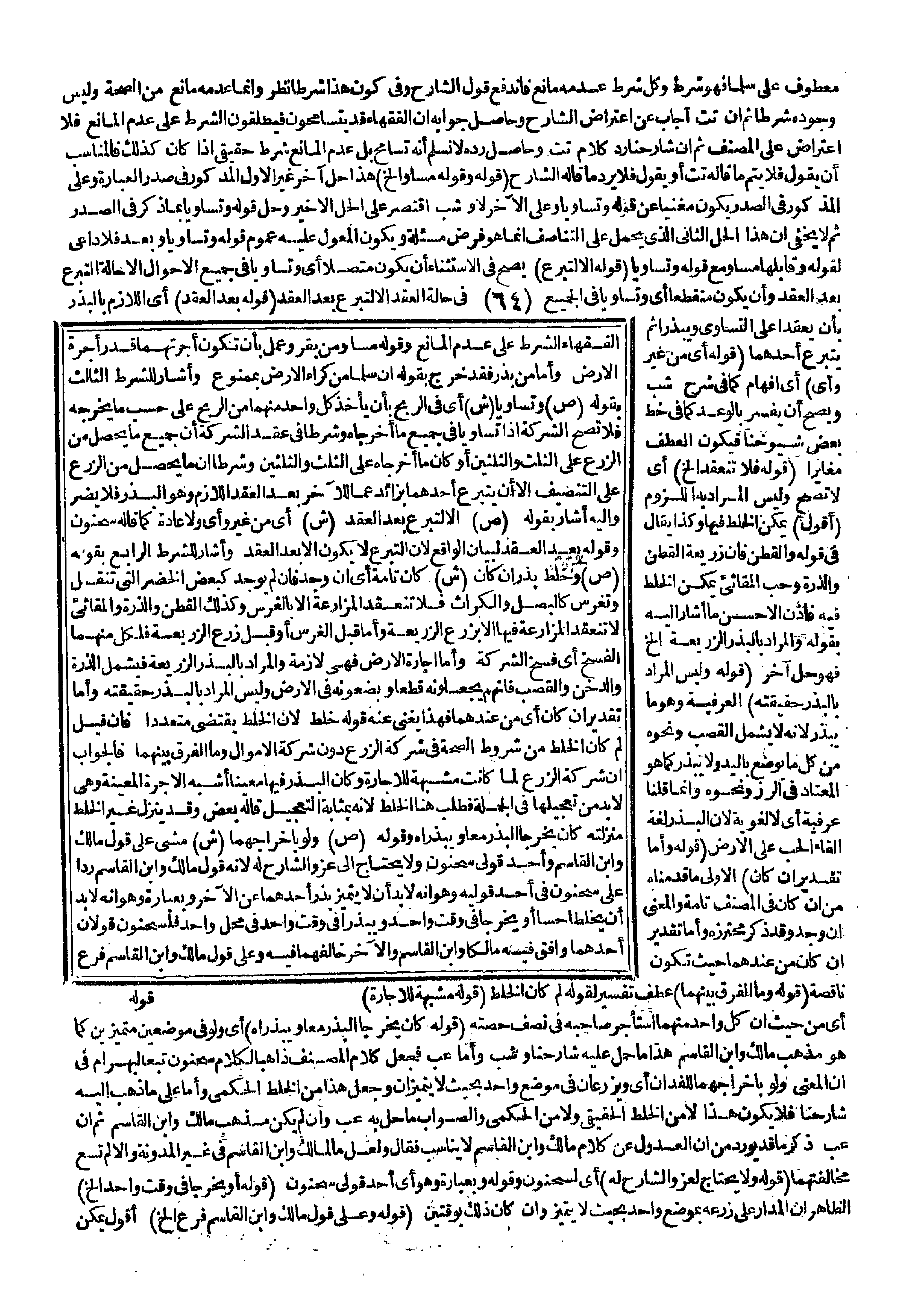 الْفُقَهَاءُ الشَّرْطَ عَلَى عَدَمِ الْمَانِعِ وَقَوْلُهُ مُسَاوٍ وَمِنْ بَقَرٍ وَعَمَلٍ بِأَنْ تَكُونَ أُجْرَتُهُمَا قَدْرَ أُجْرَةِ الْأَرْضِ وَأَمَّا مَنْ بَذَرَ فَقَدْ خَرَجَ بِقَوْلِهِ إنْ سَلِمَا مِنْ كِرَاءِ الْأَرْضِ بِمَمْنُوعٍ