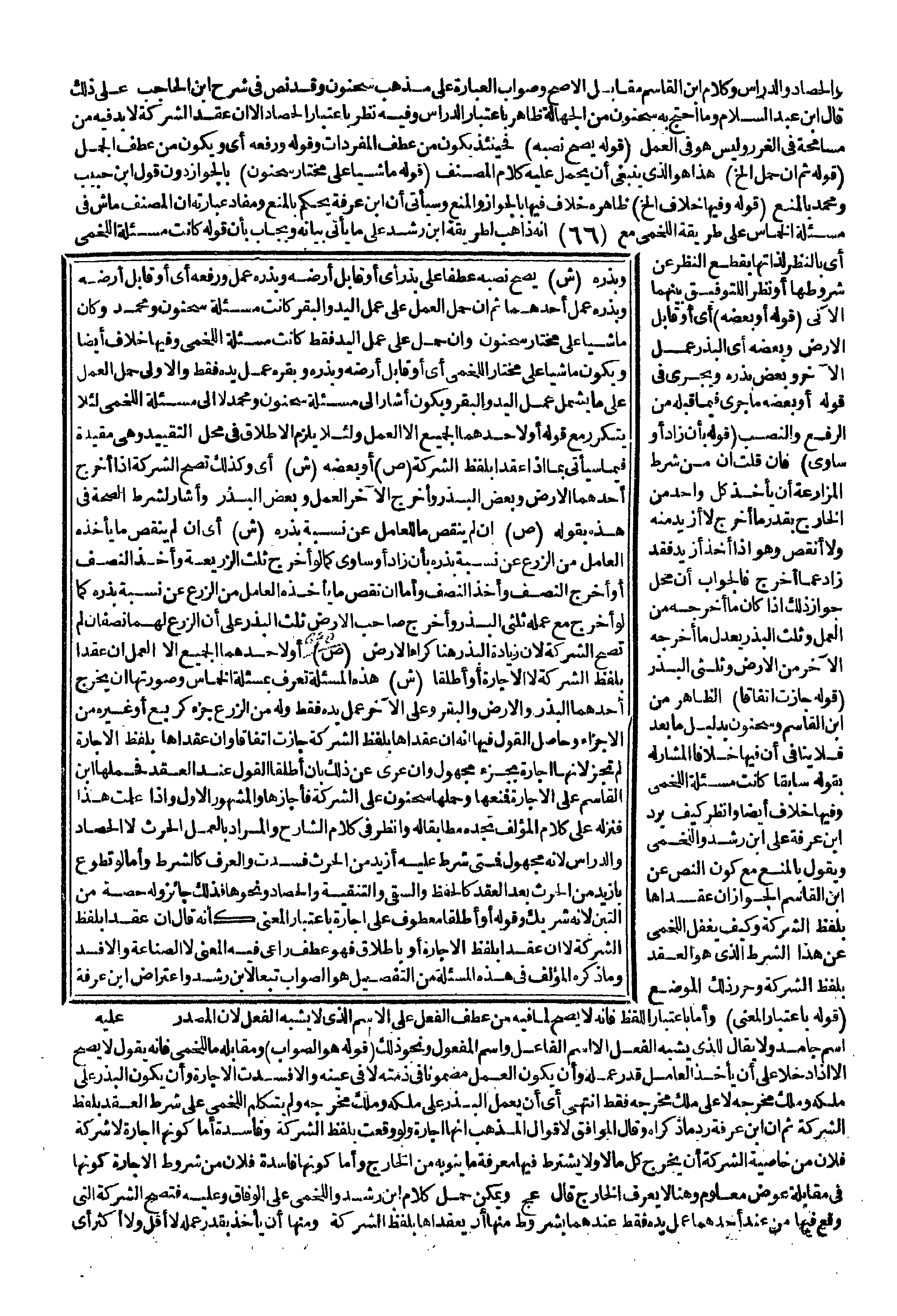 ـــــــــــــــــــــــــــــQوَالْحَصَادُ وَالدِّرَاسُ وَكَلَامُ ابْنِ الْقَاسِمِ مُقَابِلُ الْأَصَحِّ وَصَوَابُ الْعِبَارَةِ عَلَى مَذْهَبِ سَحْنُونَ وَقَدْ نَصَّ فِي شَرْحِ ابْنِ الْحَاجِبِ عَلَى ذَلِكَ قَالَ ابْنُ عَبْدِ السَّلَامِ وَمَا احْتَجَّ بِهِ سَحْنُونَ مِنْ الْجَهَالَةِ ظَاهِرٌ بِاعْتِبَارِ الدِّرَاسِ وَفِيهِ نَظَرٌ بِاعْتِبَارِ الْحَصَادِ إلَّا أَنَّ عَقْدَ الشَّرِكَةِ لَا بُدَّ فِيهِ مِنْ مُسَامَحَةٍ فِي الْغَرَرِ وَلَيْسَ هُوَ فِي الْعَمَلِ