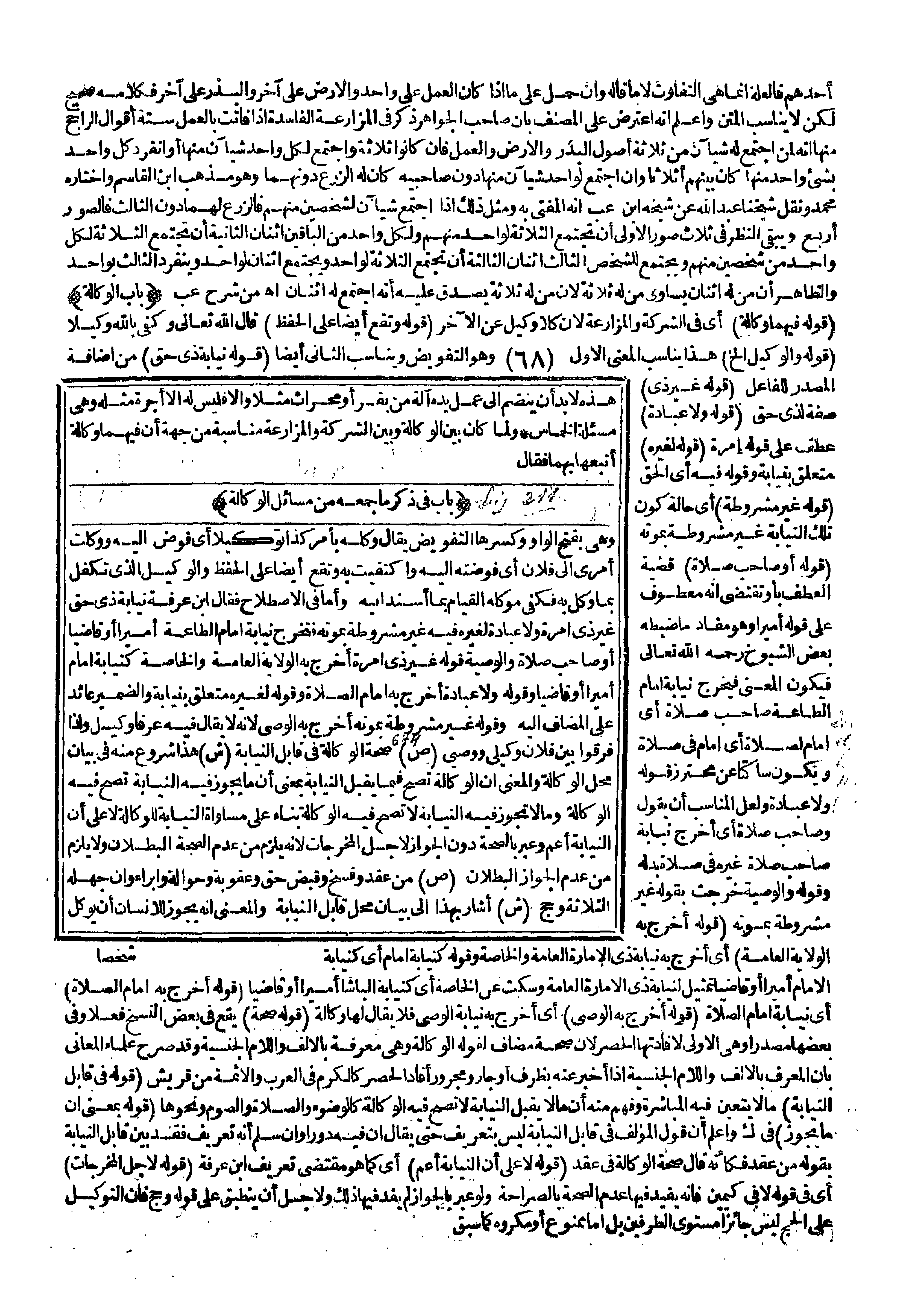 (قَوْلُهُ فِيهِمَا وَكَالَةٌ) أَيْ فِي الشَّرِكَةِ وَالْمُزَارَعَةِ لِأَنَّ كُلًّا وَكِيلٌ عَنْ الْآخِرِ (قَوْلُهُ وَتَقَعُ أَيْضًا عَلَى الْحِفْظِ) قَالَ اللَّهُ تَعَالَى {وَكَفَى بِاللَّهِ وَكِيلا} [النساء: 81] (قَوْلُهُ وَالْوَكِيلُ إلَخْ) هَذَا يُنَاسِبُ الْمَعْنَى الْأَوَّلَ وَهُوَ التَّفْوِيضُ وَيُنَاسِبُ الثَّانِيَ أَيْضًا (قَوْلُهُ نِيَابَةُ ذِي حَقٍّ) مِنْ إضَافَةِ الْمَصْدَرِ لِلْفَاعِلِ (قَوْلُهُ غَيْرُ ذِي) صِفَةٌ لِذِي حَقٍّ (قَوْلُهُ وَلَا عِبَادَةٍ) عُطِفَ عَلَى قَوْلِهِ إمْرَةٍ (قَوْلُهُ لِغَيْرِهِ) مُتَعَلِّقٌ (بِنِيَابَةِ) وَقَوْلُهُ فِيهِ أَيْ الْحَقُّ (قَوْلُهُ غَيْرُ مَشْرُوطَةٍ) أَيْ حَالَةَ كَوْنِ تِلْكَ النِّيَابَةِ غَيْرَ مَشْرُوطَةٍ بِمَوْتِهِ (قَوْلُهُ أَوْ صَاحِبَ صَلَاةٍ) قَضِيَّةُ الْعَطْفِ بِأَوْ تَقْتَضِي أَنَّهُ مَعْطُوفٌ عَلَى قَوْلِهِ أَمِيرًا وَهُوَ مُفَادُ مَا ضَبَطَهُ بَعْضُ الشُّيُوخِ - رَحِمَهُ اللَّهُ تَعَالَى - فَيَكُونُ الْمَعْنَى فَيَخْرُجُ نِيَابَةُ إمَامِ الطَّاعَةِ صَاحِبُ صَلَاةٍ أَيْ إمَامٌ لِصَلَاةٍ أَيْ إمَامٌ فِي صَلَاةٍ وَيَكُونُ سَاكِتًا مُحْتَرَزُ قَوْلِهِ وَلَا عِبَادَةٍ وَلَعَلَّ الْمُنَاسِبَ أَنْ يَقُولَ وَصَاحِبُ صَلَاةٍ أَيْ أَخْرَجَ نِيَابَةَ صَاحِبِ صَلَاةِ غَيْرِهِ فِي صَلَاةِ بَدَلِهِ وَقَوْله وَالْوَصِيَّةُ خَرَجَتْ بِقَوْلِهِ غَيْرِ مَشْرُوطَةٍ بِمَوْتِهِ.