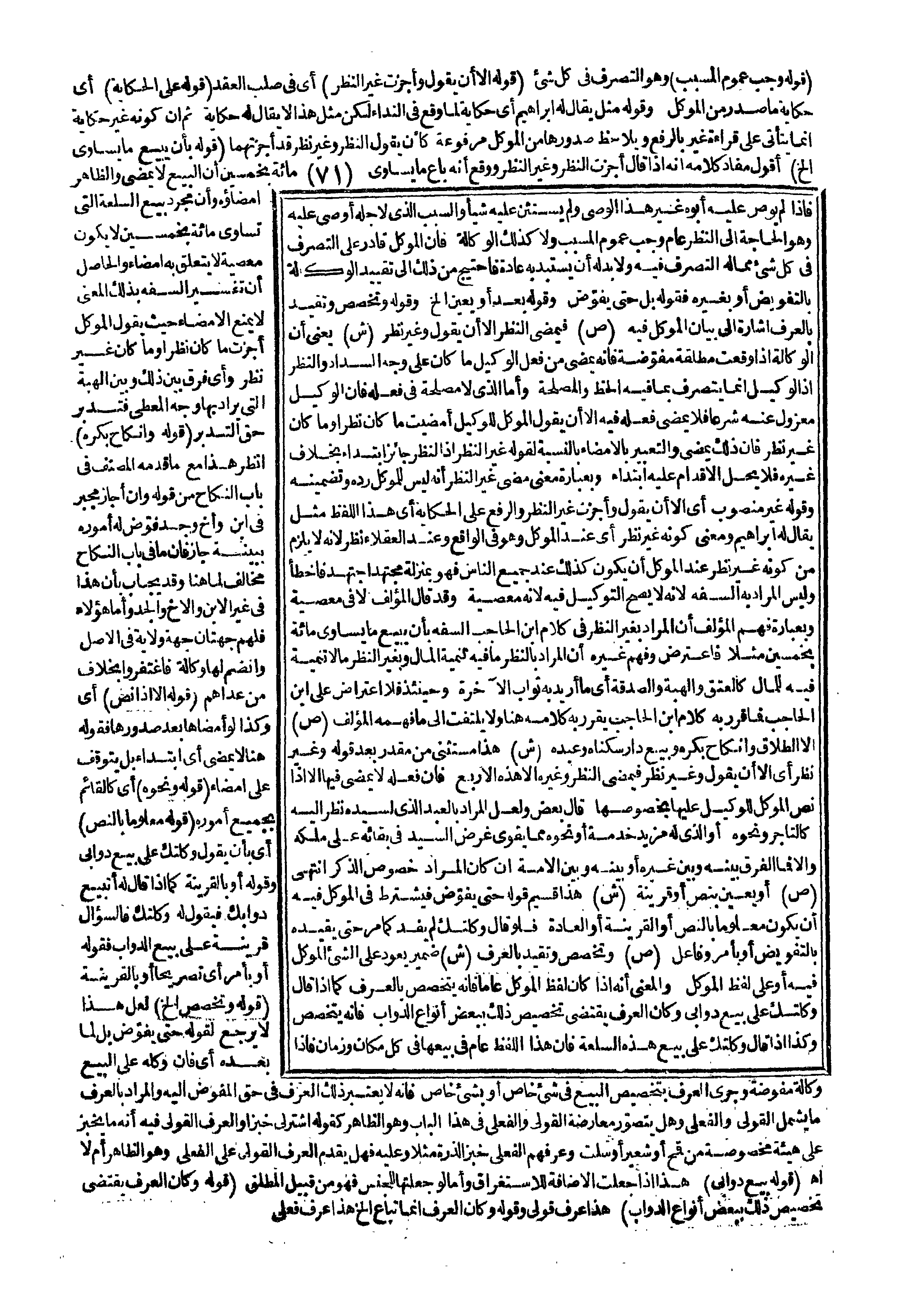 فَإِذَا لَمْ يُوصِ عَلَيْهِ أَبُوهُ غَيْرَ هَذَا الْوَصِيَّ وَلَمْ يَسْتَثْنِ عَلَيْهِ شَيْئًا وَالسَّبَبُ الَّذِي لِأَجْلِهِ أَوْصَى عَلَيْهِ وَهُوَ الْحَاجَةُ إلَى النَّظَرِ عَامٌّ وَجَبَ عُمُومُ الْمُسَبَّبِ وَلَا كَذَلِكَ الْوَكَالَةُ فَإِنَّ الْمُوَكِّلَ قَادِرٌ عَلَى التَّصَرُّفِ فِي كُلِّ شَيْءٍ مِمَّا لَهُ التَّصَرُّفُ فِيهِ وَلَا بُدَّ لَهُ أَنْ يَسْتَبِدَّ بِهِ عَادَةً فَاحْتِيجَ مِنْ ذَلِكَ إلَى تَقْيِيدِ الْوَكَالَةِ بِالتَّفْوِيضِ أَوْ بِغَيْرِهِ فَقَوْلُهُ بَلْ حَتَّى يُفَوَّضَ وَقَوْلُهُ بَعْدَ أَوْ يُعَيَّنَ إلَخْ وَقَوْلُهُ وَتَخَصَّصَ وَتَقَيَّدَ بِالْعُرْفِ إشَارَةٌ إلَى بَيَانِ الْمُوَكَّلِ فِيهِ.