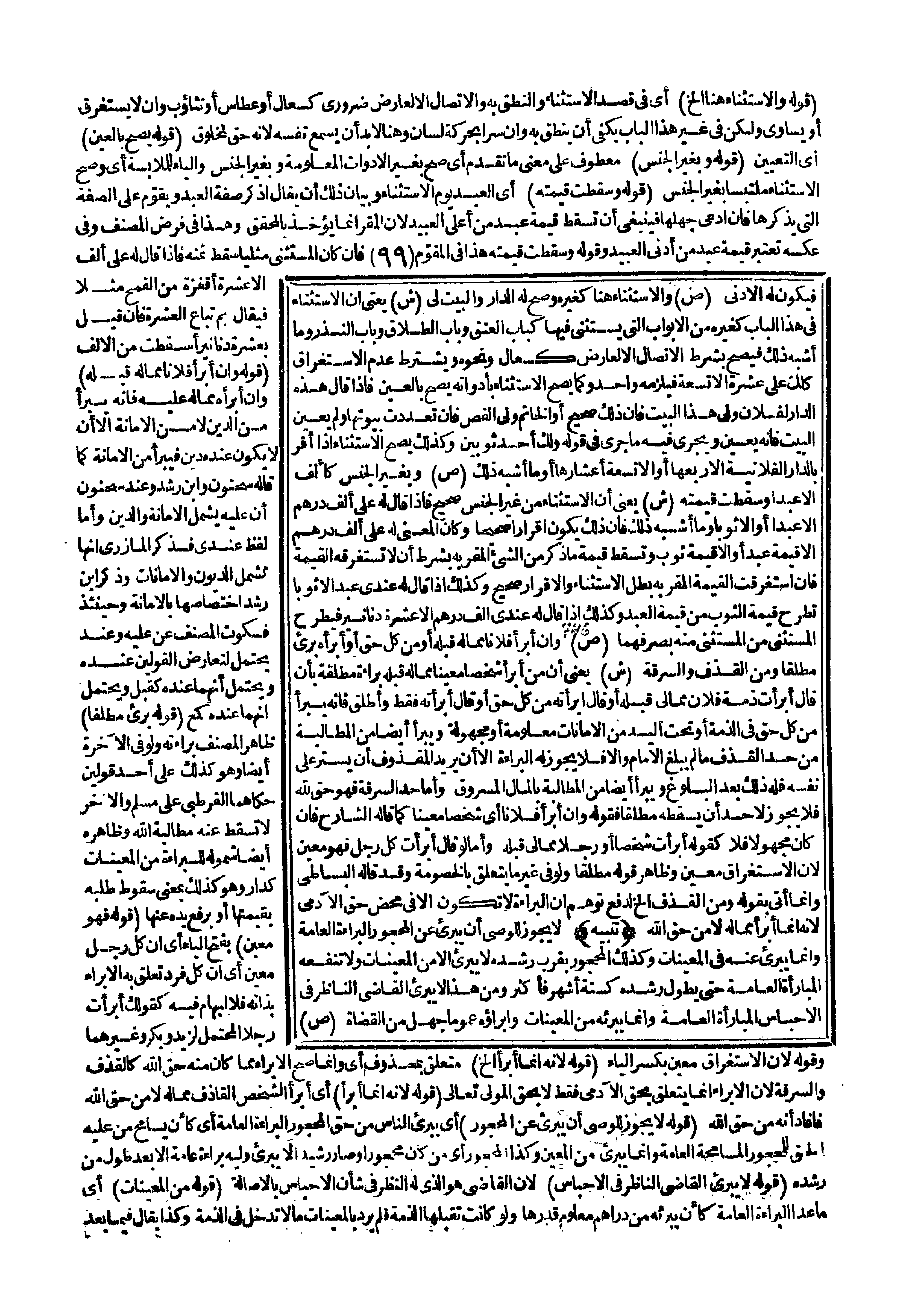 ـــــــــــــــــــــــــــــQقَوْلُهُ الِاسْتِثْنَاءُ هُنَا إلَخْ) أَيْ فِي قَصْدِ الِاسْتِثْنَاءِ وَالنُّطْقِ بِهِ وَالِاتِّصَالِ إلَّا لِعَارِضٍ ضَرُورِيٍّ كَسُعَالٍ أَوْ عُطَاسٍ أَوْ تَثَاؤُبٍ وَأَنْ لَا يَسْتَغْرِقَ أَوْ يُسَاوِيَ وَلَكِنْ فِي غَيْرِ هَذَا الْبَابِ يَكْفِي أَنْ يَنْطِقَ بِهِ وَإِنْ سِرًّا بِحَرَكَةِ لِسَانٍ وَهُنَا لَا بُدَّ أَنْ يُسْمِعَ نَفْسَهُ لِأَنَّهُ حَقٌّ لِمَخْلُوقٍ (قَوْلُهُ يَصِحُّ بِالْعَيْنِ) أَيْ التَّعْيِينِ (قَوْلُهُ وَبِغَيْرِ الْجِنْسِ) مَعْطُوفٌ عَلَى مَعْنًى مَا تَقَدَّمَ أَيْ صَحَّ بِغَيْرِ الْأَدَوَاتِ الْمَعْلُومَةِ وَبِغَيْرِ الْجِنْسِ وَالْبَاءِ لِلْمُلَابَسَةِ أَيْ وَصَحَّ الِاسْتِثْنَاءُ مُتَلَبِّسًا بِغَيْرِ الْجِنْسِ (قَوْلُهُ وَسَقَطَتْ قِيمَتُهُ) أَيْ الْعَبْدِ يَوْمَ الِاسْتِثْنَاءِ وَيُبَانُ ذَلِكَ أَنْ يُقَالَ اُذْكُرْ صِفَةَ الْعَبْدِ وَيُقَوَّمُ عَلَى الصُّفَّةِ الَّتِي يَذْكُرُهَا فَإِنْ ادَّعَى جَهْلَهَا فَيَنْبَغِي أَنْ تَسْقُطَ قِيمَةَ عَبْدٍ مِنْ أَعْلَى الْعَبِيدِ لِأَنَّ الْمُقِرَّ إنَّمَا يُؤْخَذُ بِالْمُحَقَّقِ وَهَذَا فِي فَرْضِ الْمُصَنِّفِ وَفِي عَكْسِهِ تُعْتَبَرُ قِيمَةُ عَبْدٍ مِنْ أَدْنَى الْعَبِيدِ وَقَوْلُهُ وَسَقَطَتْ قِيمَتُهُ هَذَا فِي الْمُقَوَّمِ فَإِنْ كَانَ الْمُسْتَثْنَى مِثْلِيًّا سَقَطَ ثَمَنُهُ فَإِذَا قَالَ لَهُ عَلَيَّ أَلْفٌ إلَّا عَشَرَةَ أَقْفِزَةٍ مِنْ الْقَمْحِ مَثَلًا فَيُقَالُ بِمَ تُبَاعُ الْعَشَرَةُ فَإِنْ قِيلَ بِعَشَرَةِ دَنَانِيرَ أُسْقِطَتْ مِنْ الْأَلْفِ
