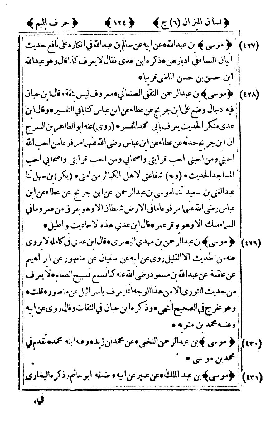 [427] "موسى" بن عبد الله عن أبيه عن سالم بن عبد الله في إنكاره على نافع حديث اتيان النساء في أدبارهن ذكره ابن عدى فقال لا يعرف كذا قال هو عبد الله بن حسن بن حسن الماضي قريبا.