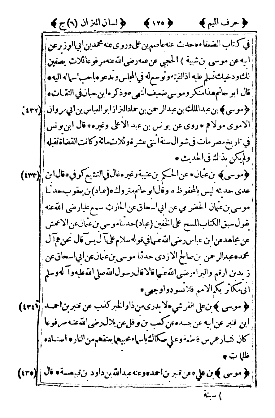[433] "موسى" بن عثمان عن الحكم بن عتيبة وغيره عال في التشيع كوفى قال ابن عدى حديثه ليس بالمحفوظ وقال أبو حاتم متروك عباد بن يعقوب حدثنا موسى بن عثمان الحضرمي عن أبي إسحاق عن الحارث سمع عليا رضى الله عنه يقول سبق الكتاب المسح على الخفين عباد حدثنا موسى بن عثمان عن الأعمش عن مجاهد عن ابن عباس رضى الله عنهما في قوله سلام على آل يس قال نحن هم آل محمد عبد الرحمن بن صالح الأزدي حدثنا موسى بن عثمان عن أبي إسحاق عن زيد بن أرقم والبراء رضى الله عنهما قالا قال رسول الله صلى الله عليه وآله وسلم انى مكاثر بكم الأمم فلا تسودوا وجهي.