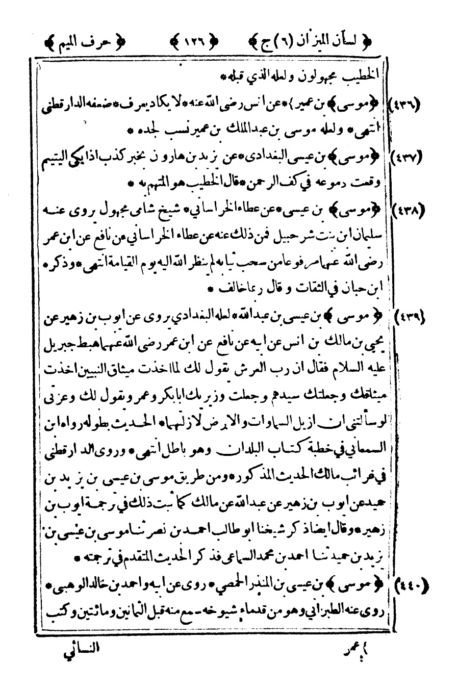 [439] "موسى" بن عيسى بن عبد الله لعله البغدادي يروى عن أيوب بن زهير عن يحيى بن مالك بن أنس عن أبيه عن نافع عن ابن عمر رضى الله عنهما هبط جبريل عليه السلام فقال ان رب العرش يقول لك لما أخذت ميثاق النبيين أخذت ميثاقك وجعلتك سيدهم وجعلت وزيريك أبا بكر وعمر ويقول لك وعزتى لو سألتنى ان ازيل السماوات والأرض لازلتهما الحديث بطوله رواه بن السمعاني في خطبة كتاب البلدان وهو باطل انتهى وروى الدارقطني في غرائب مالك الحديث المذكور ومن طريق موسى بن عيسى بن يزيد بن زهير وقال أيضا ذكر شيخنا أبو طالب أحمد بن نصر ثنا موسى بن عيسى بن يزيد بن حميد ثنا أحمد بن محمد السماعى فذكر الحديث المتقدم في ترجمته.