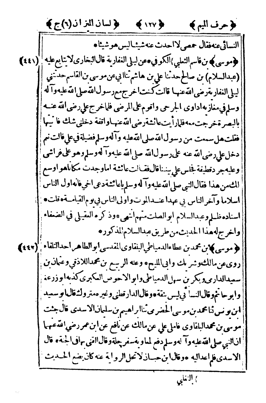 [441] "موسى" بن قاسم الثعلبي1 الكوفى عن ليلى الغفارية قال البخاري لا يتابع عليه عبد السلام بن صالح حدثنا علي بن هاشم ثنا أبي عن موسى بن القاسم حدثتني ليلى الغفارية رضى الله عنها قالت كنت اخرج مع رسول الله صلى الله عليه وآله وسلم في مغازيه اداوى الجرحى واقوم على المرضى فلما خرج علي رضى الله عنه بالبصرة خرجت معه فلما رأيت عائشة رضى الله عنها واقفة دخلنى شك فاتيتها فقلت هل سمعت من رسول الله صلى الله عليه وآله وسلم فضيلة في علي قالت نعم دخل علي رضى الله عنه على رسول الله صلى الله عليه وآله وسلم وهو على فراشى وعليه جرد قطيفة فجلس علي بيننا قال فقالت عائشة اما وجدت مكانا هو أوسع لك من هذا فقال النبي صلى الله عليه وآله وسلم يا عائشة دعى اخى فإنه أول الناس اسلاما وآخر الناس بي عهدا عند الموت واولى الناس بي يوم القيامة قلت إسناده ظلم وعبد السلام أبو الصلت متهم انتهى وذكره العقيلي في الضعفاء واخرج له هذا الحديث من طريق عبد السلام المذكور.