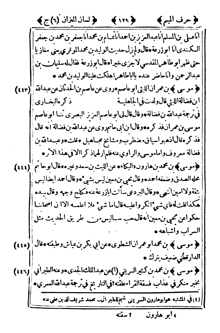 [443] "موسى" بن عمران الليثي أبو عاصم روى عن عاصم بن الحدثان عن عبد الله بن فضالة الليثي قال ولدت في الجاهلية ذكره البخاري في ترجمة عبد الله بن فضالة وقال: قال لي أبو عاصم العزيز البصري ثنا أبو عاصم موسى بن عمران فذكره وقال ابن أبي حاتم روى عن عبد الله بن فضالة انه قال فذكره قال اذهبوا سياق مضطرب ومشايخ مجاهيل قلت وعبد الله بن فضالة معروف واما موسى والراوي عنه فلم ار لهما ذكرا الا في هذا الأثر.
