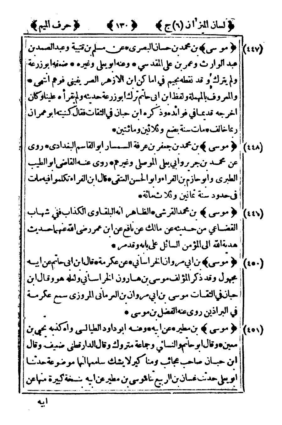 [448] "موسى" بن محمد بن جعفر بن عرفة السمسار أبو القاسم البغدادي روى عن محمد بن جرير وأبي يعلى الموصلي وغيرهم روى عنه القاضى أبو الطيب الطبري وأبو حازم بن الفراء وأبو الحسن العتقى قال ابن الفراء تكلموا فيه مات في حدود سنة ثمانين وثلاث مائة.