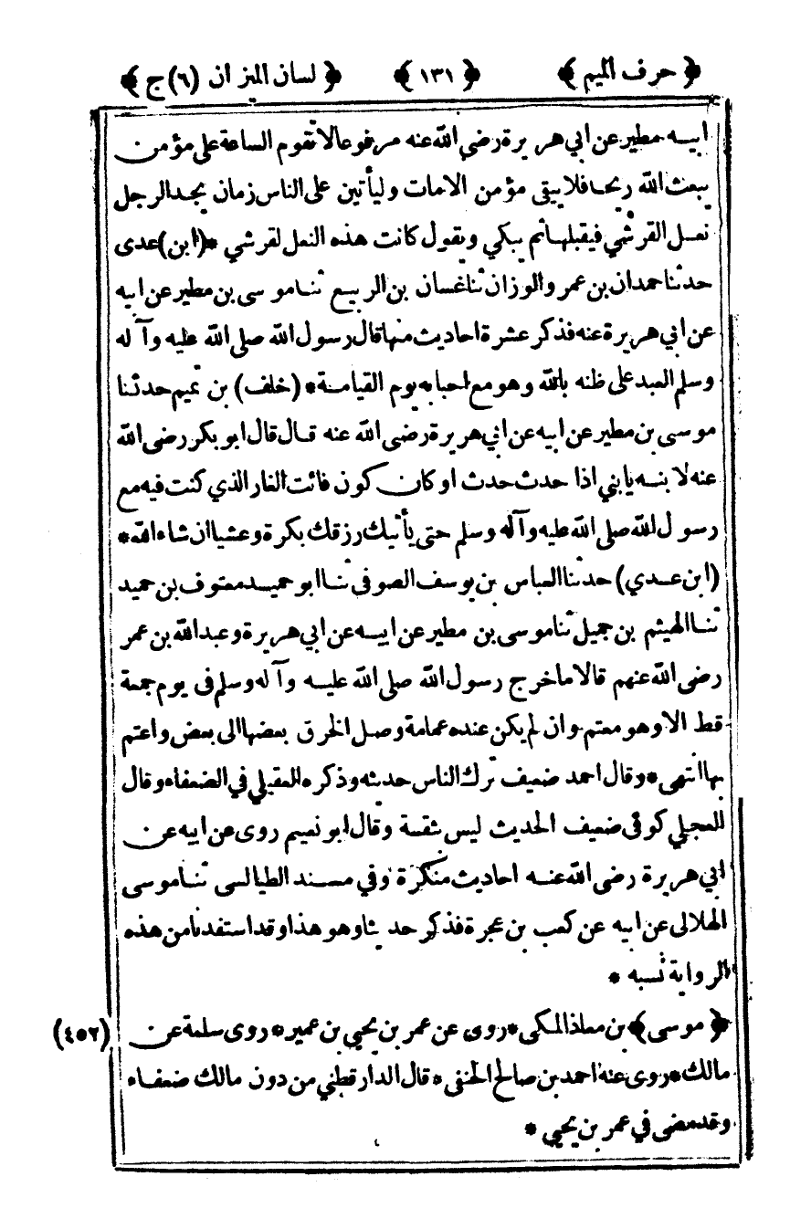 أبيه مطير عن أبي هريرة رضى الله عنه مرفوعا لا تقوم الساعة على مؤمن يبعث الله ريحا فلا يبقى مؤمن الا مات وليأتين على الناس زمان يجد الرجل نعل القرشي فيقبلها ثم يبكى ويقول كانت هذه النعل لقرشى بن عدى حدثنا حمد أن ابن عمرو الوزان ثنا غس أن ابن الربيع ثنا موسى بن مطير عن أبيه عن أبي هريرة عنه فذكر عشرة أحاديث منها قال رسول الله صلى الله عليه وآله وسلم العبد على ظنه بالله وهو مع احبابه يوم القيامة خلف بن تميم حدثنا موسى بن مطير عن أبيه عن أبي هريرة رضى الله عنه قال: قال أبو بكر رضى الله عنه لابنه يا بنى إذا حدث حدث أو كان كون فائت الغار الذي كنت فيه مع رسول الله صلى الله عليه وآله وسلم حتى يأتيك رزقك بكرة وعشيا ان شاء الله بن عدى حدثنا العباس بن يوسف الصوفي ثنا أبو حميد معتوف بن حميد ثنا الهيثم بن جميل ثنا موسى بن مطير عن أبيه عن أبي هريرة وعبد الله بن عمر رضى الله عنهم قالا ما خرج رسول الله صلى الله عليه وآله وسلم في يوم جمعة قط الا وهو معتم وان لم يكن عنده عمامة وصل الخرق بعضها الى بعض واعتم بها انتهى وقال أحمد ضعيف ترك الناس حديثه وذكره العقيلي في الضعفاء وقال العجلي كوفى ضعيف الحديث ليس بثقة وقال أبو نعيم روى عن أبيه عن أبي هريرة رضى الله عنه أحاديث منكرة وفي مسند الطيالسي ثنا موسى الهلالي عن أبيه عن كعب بن عجرة فذكر حديثا وهو هذا وقد استفدنا من هذه الرواية نسبه.