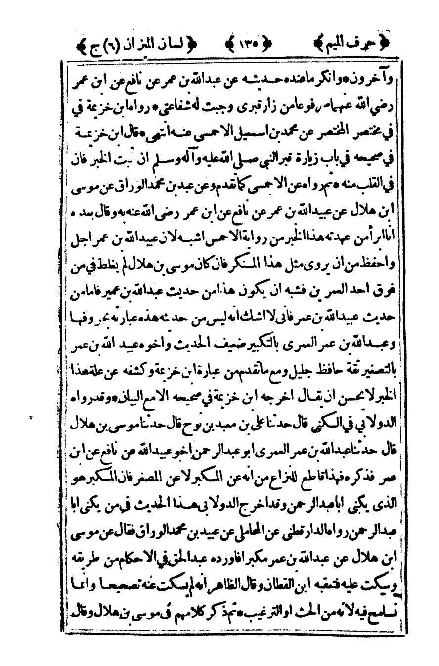 وآخرون وأنكر ما عنده حديثه عن عبد الله بن عمر عن نافع عن ابن عمر رضى الله عنهما مرفوعا من زار قبرى وجبت له شفاعتي رواه بن خزيمة في مختصر المختصر عن محمد بن إسماعيل الأحمسي عنه انتهى قال ابن خزيمة في صحيحه في باب زيارة قبر النبي صلى الله عليه وآله وسلم ان ثبت الخبر فان في القلب منه ثم رواه عن الأحمسي كما تقدم وعن عبد بن محمد الوراق عن موسى بن هلال عن عبيد الله بن عمر عن نافع عن ابن عمر رضى الله عنه به وقال بعد انا ابرأ من عهدته هذا الخبر من رواية الاحمس اشبه لان عبيد الله بن عمر أجل واحفظ من ان يروى مثل هذا المنكر فان كان موسى بن هلال لم يغلط في من فوق أحد العمرين فشبه ان يكون هذا من حديث عبد الله بن عمير فاما من حديث عبيد الله بن عمر فانى لا اشك انه ليس من حديثه هذه عبارته بحروفها وعبد الله بن عمر العمرى بالتكبير ضعيف الحديث وأخوه عبيد الله بن عمر بالتصغير ثقة حافظ جليل ومع ما تقدم من عبارة بن خزيمة وكشفه عن علة هذا الخبر لا يحسن ان يقال أخرجه ابن خزيمة في صحيحه الا مع البيان وقد رواه الدولابي في الكنى قال حدثنا علي بن معبد بن نوح قال حدثنا موسى بن هلال قال حدثنا عبد الله بن عمر العمرى أبو عبد الرحمن أخو عبيد الله عن نافع عن ابن عمر فذكره فهذا قاطع للنزاع من انه عن المكبر لا عن المصغر فان المكبر هو الذي يكنى أبا عبد الرحمن وقد اخرج الدولابي هذا الحديث في من يكنى أبا عبد الرحمن رواه الدارقطني عن المحاملي عن عبيد بن محمد الوراق فقال عن موسى بن هلال عن عبد الله بن عمر مكبرا فاورده عبد الحق في الاحكام من طريقه وسكت عليه فتعقبه بن القطان وقال الظاهر انه لم يسكت عنه تصحيحا وانما تسامح فيه لأنه من الحث أو الترغيب ثم ذكر كلامهم في موسى بن هلال وقال