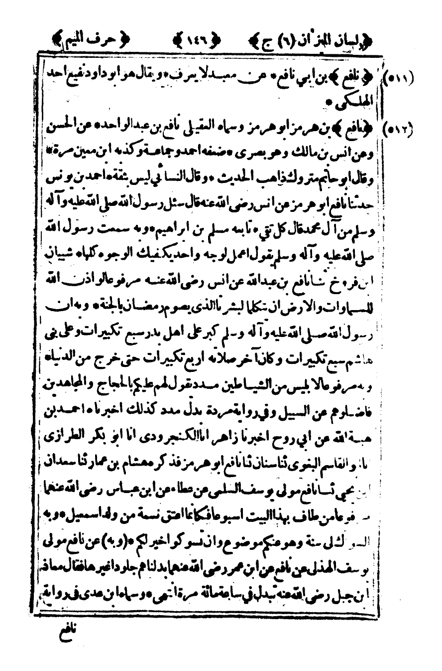 [512] " نافع" بن هرمز أبو هرمز وسماه العقيلي نافع بن عبد الواحد عن الحسن وعن أنس بن مالك وهو بصري ضعفه أحمد وجماعة وكذبه بن معين مرة وقال أبو حاتم متروك ذاهب الحديث وقال النسائي ليس بثقة أحمد بن يونس حدثنا نافع أبو هرمز عن أنس رضى الله عنه قال سئل رسول الله صلى الله عليه وآله وسلم من آل محمد قال كل تقي تابعه مسلم بن إبراهيم وبه سمعت رسول الله صلى الله عليه وآله وسلم يقول اعمل لوجه واحد يكفيك الوجوه كلها شيب أن ابن فروخ ثنا نافع بن عبد الله عن أنس رضى الله عنه مرفوعا لو أذن الله للسماوات والأرض أن يتكلما لبشرتا الذي يصوم رمضان بالجنة وبه أن رسول الله صلى الله عليه وآله وسلم كبر على أهل بدر سبع تكبيرات وعلى بني هاشم سبع تكبيرات وكان آخر صلاته أربع تكبيرات حتى خرج من الدنيا وبه مرفوعا لإبليس من الشياطين مدد يقول لهم عليكم بالحجاج والمجاهدين فاضلوهم عن السبيل وفي رواية مردة بدل مدد كذلك أخبرناه أحمد بن هبة الله عن أبي روح أخبرنا زاهر أنا الكنجرودي أنا أبو بكر الطرازي أنا أبو القاسم البغوي ثنا سنان ثنا نافع أبو هرمز فذكره هشام بن عمار ثنا سعد أن ابن يحيى ثنا نافع مولى يوسف السلمي عن عطاء عن ابن عباس رضى الله عنهما مرفوعا من طاف بهذا البيت اسبوعا فكأنما اعتق نسمة من ولد إسماعيل وبه السواك لي سنة وهو عنكم موضوع وإن تسوكوا خير لكم وبه عن نافع مولى يوسف الهذلي عن نافع عن ابن عمر رضى الله عنهما بدلناهم جلودا غيرها فقال معاذ بن جبل رضى الله عنه تبدل في ساعة مائة مرة انتهى وسماه بن عدي في رواية