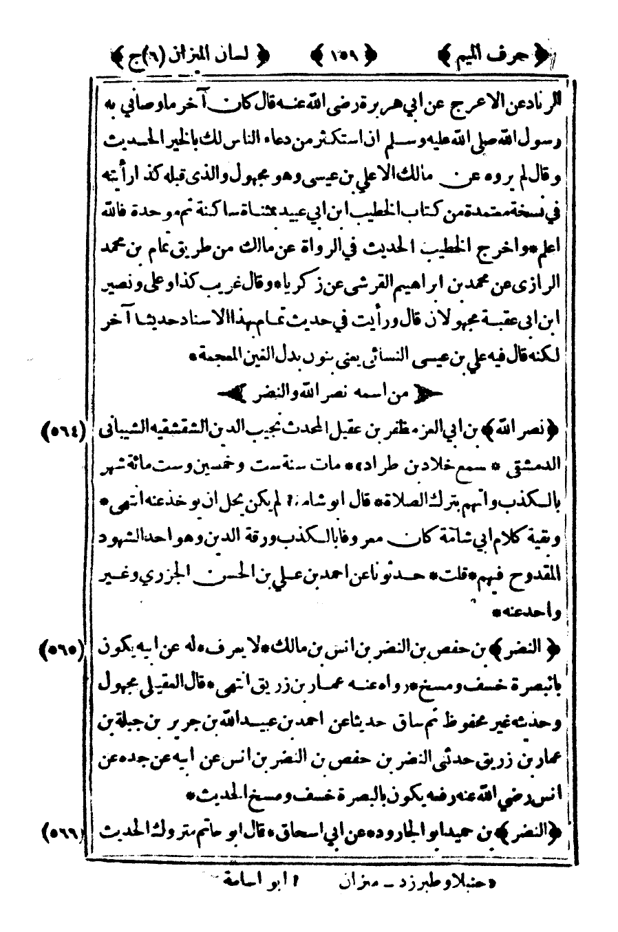 [565] "النضر" بن حفص بن النصر بنأنس بن مالك لا يعرف له عن أبيه يكون بالبصرة خسف ومسخ رواه عنه عمار بن زريق انتهى قال العقيلي مجهول وحديثه غير محفوظ ثم ساق حديثا عن أحمد بن عبيد الله بن جرير بن جبلة بن عمار بن بن زريق حدثني النضر بن حفص بن النضر بن أنس عن أبيه عن جده عن أنس رضى الله عنه رفعه يكون بالبصرة خسف ومسخ الحديث.