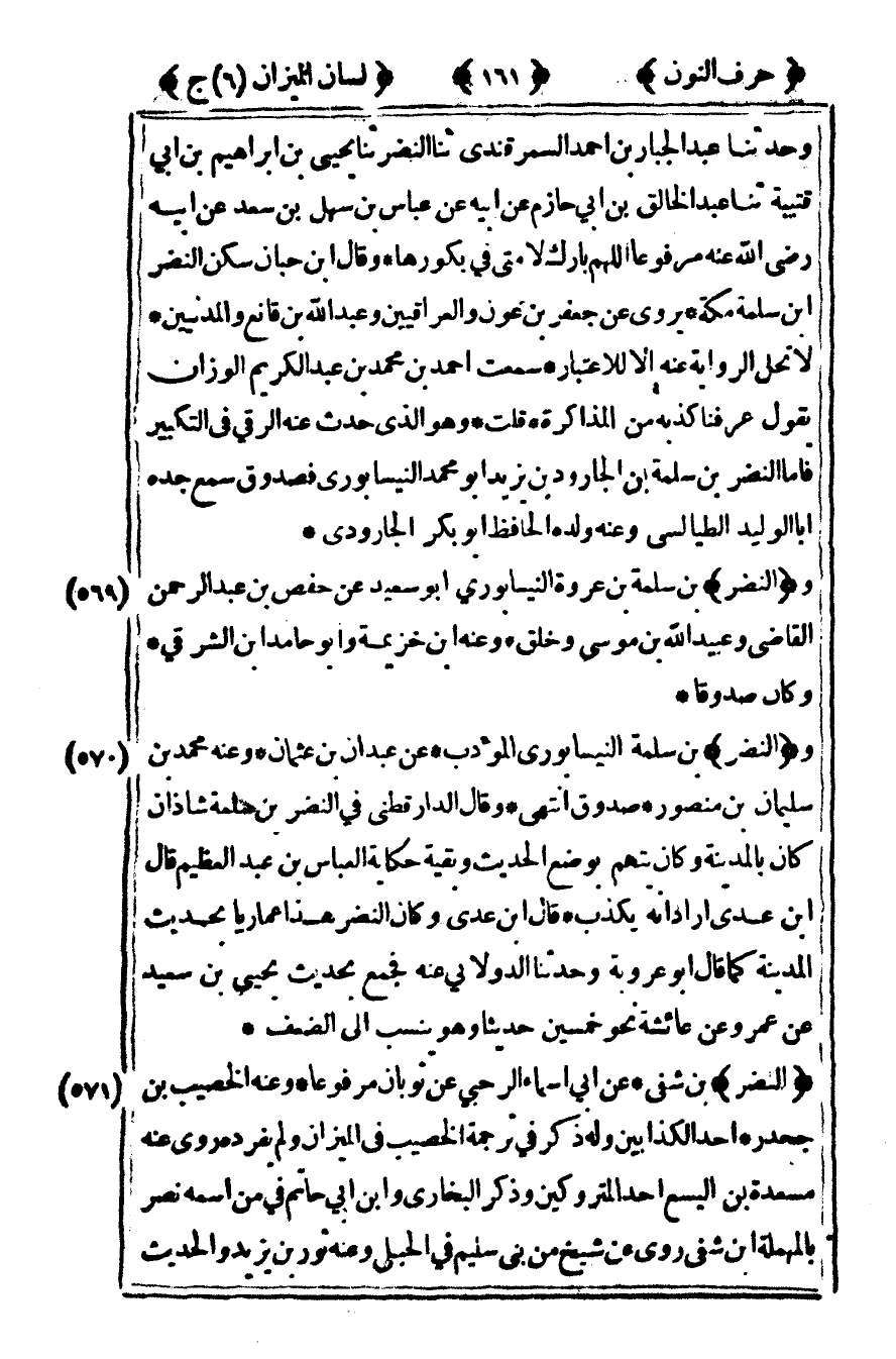 [570] "والنضر" بن سلمة النيسابوري المؤدب عن عبد أن ابن عثمان وعنه محمد بن سليم أن ابن منصور صدوق انتهى وقال الدارقطني في النضر بن سلمة شاذان كان بالمدينة وكان يتهم بوضع الحديث وبقية حكاية العباس بن عبد العظيم قال ابن عدي أراد أنه يكذب قال ابن عدي وكان النضر هذا عماريا بحديث المدينة كما قال أبو عروبة وحدثنا الدولابي عنه فجمع بحديث يحيى بن سعيد عن عمرو عن عائشة نحو خمسين حديثا وهو ينسب إلى الضعف.