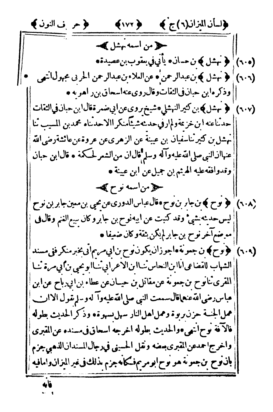 [608] "نوح" بن جابر بن نوح قال عباس الدوري عن يحيى بن معين جابر بن نوح ليس حديثه بشيء وقد كتبت عن أبيه نوح بن جابر وكان بيع الغنم وقال في موضع آخر نوح بن جابر لم يكن بثقة وكان ضعيفا.
