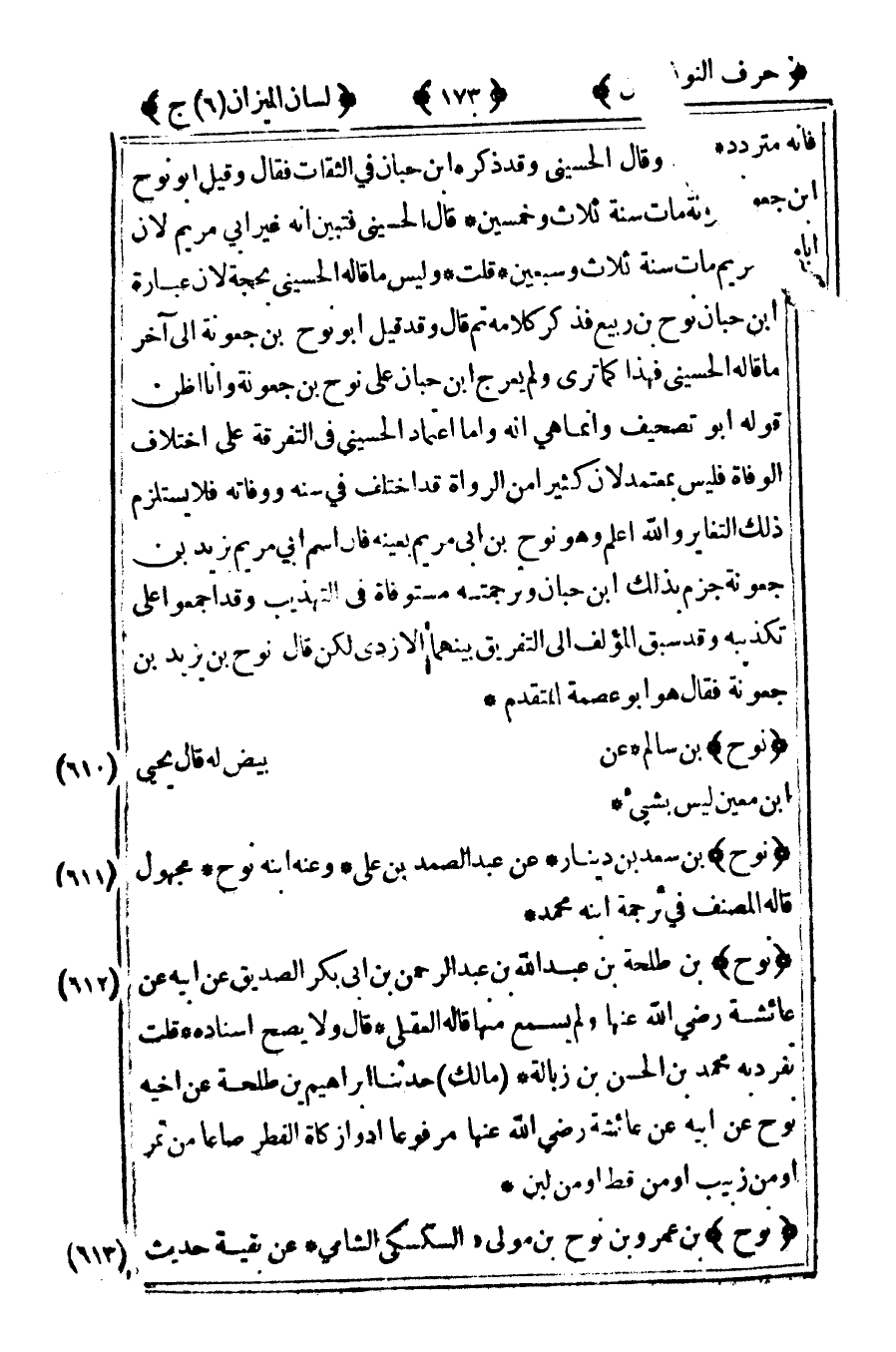 [611] "نوح" بن سعد بن دينار عن عبد الصمد بن علي وعنه ابنه نوح مجهول قال المصنف في ترجمة ابنه محمد.