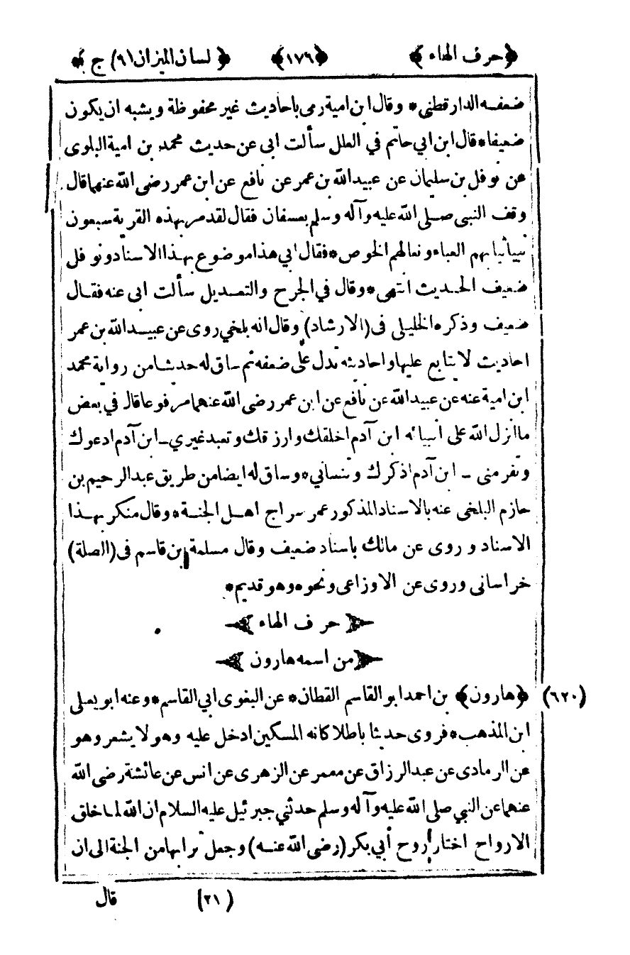 [627] "هارون" بن حيان الرقي عن محمد بن المنكدر قال الدارقطني ليس بالقوي وقال الحاكم كان يضع الحديث وقال البخاري في حديثه نظر حدث عنه علي بن جميل الرقي انتهى وذكره العقيلي في الضعفاء فقال أبو الصفر العقيلي وذكره الساجي في الضعفاء.
