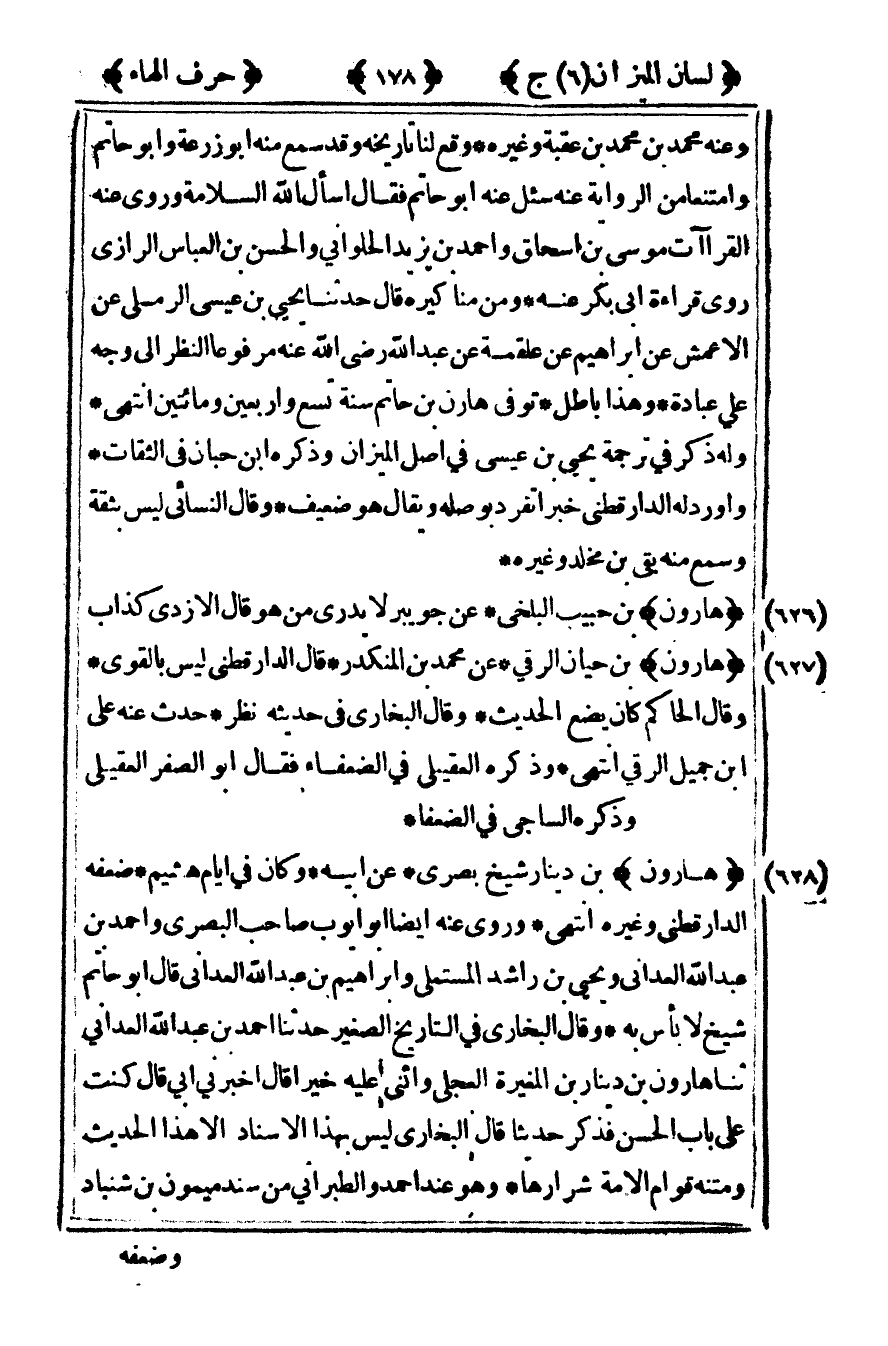 [637] "هارون" بن عيسى الهاشمي عن قال الدارقطني ليس بالقوي.