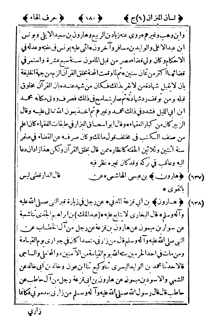 [644] "هارون" بن هارون الأزدي أبو العلاء عن عبد الله بن زياد بن سمعان عن مجاهد عن ابن عباس رضى الله عنهما رفعه هلاك أمتي والقدرية والرواية من ثبت وعنه بقية أخرجه العقيلي في الضعفاء ثم ساقه من رواية محمد بن شعيب عن هارون بن هارون عن مجاهد بدون ذكر عبد الله بن زياد وقال رواية بقية