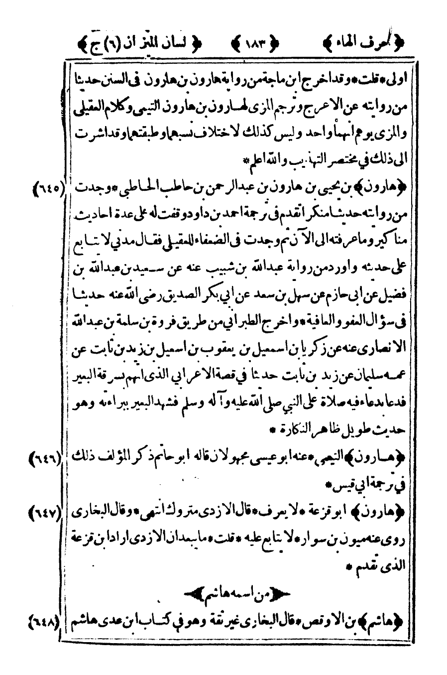 [655] "هاشم" بن محمد الربعي عن حماد بن زيد قال العقيلي لا يتابع على حديثه يعني في سنده لا متنه وذكره ابن حبان في الثقات فقال روى عنه يحيى بن عثمان ابن صالح وأهل مصر ربما أخطأ.