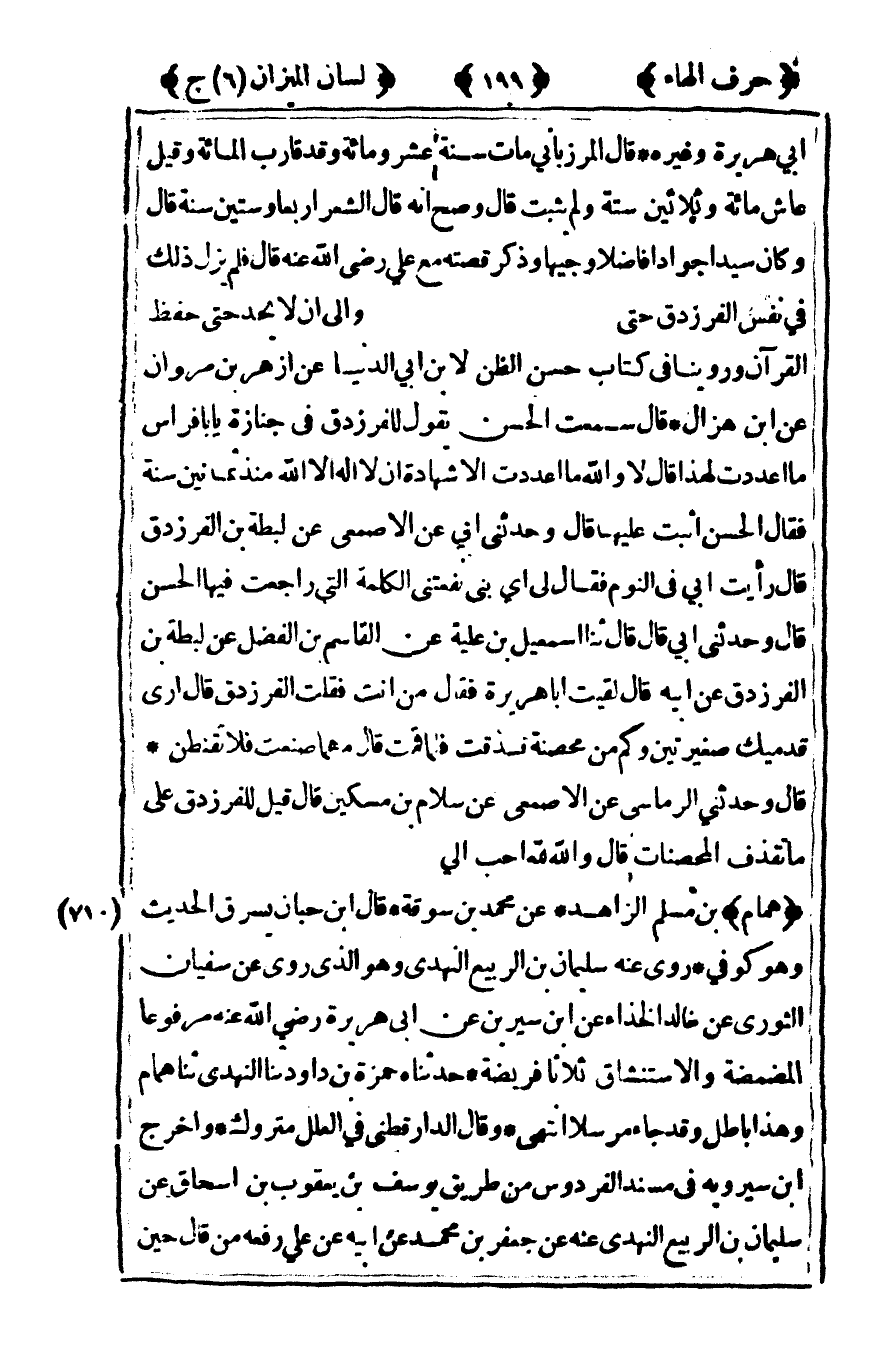 [710] "همام" بن مسلم الزاهد عن محمد بن سوقة قال ابن حبان يسرق الحديث وهو كوفي روى عنه سليم أن ابن الربيع النهدي وهو الذي روى عن سفيان الثوري عن خالد الحذاء عن ابن سيرين عن أبي هريرة رضى الله عنه مرفوعا المضمضة والاستنشاق ثلاثا فريضة حدثناه حمزة بن داود ثنا النهدي ثن همام وهذا باطل وقد جاء مرسلا انتهى وقال الدارقطني في العلل متروك وأخرج بن سيرويه في مسند الفردوس من طريق يونس بن يعقوب بن إسحاق عن سليم أن ابن الربيع النهدي عنه عن جعفر بن محمد عن أبيه عن علي رفعه من قال حين