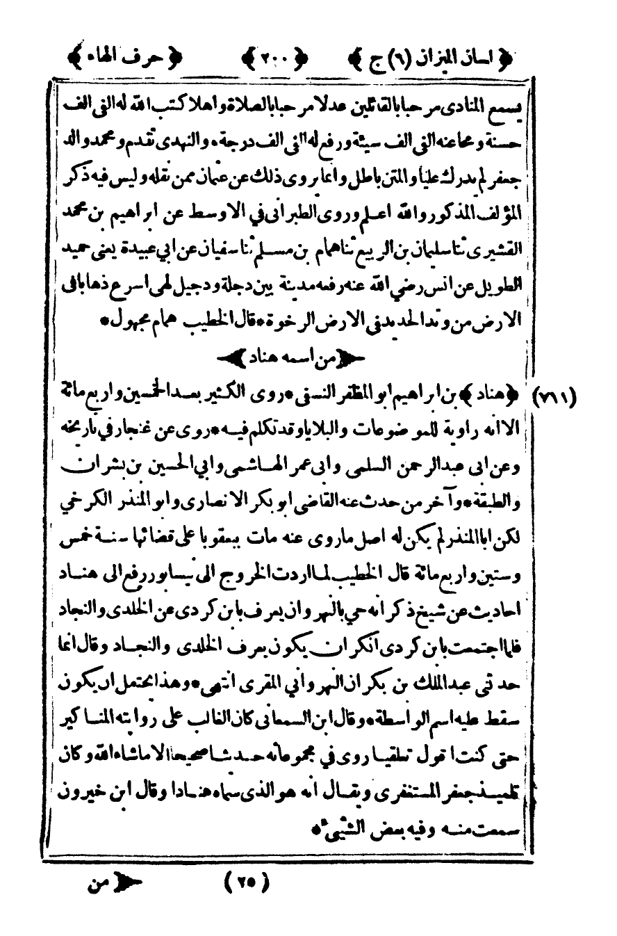 [711] "هناد" بن إبراهيم أبوالمظفر النسفي روى الكثير بعد الخمسين وأربع مائة إلا أنه راوية للموضوعات والبلايا وقد تكلم فيه روى عن غنجار في تاريخه وعن أبي عبد الرحمن السلمي وأبي عمر الهاشمي وأبي الحسين بن بشران والطبقة وآخر من حدث عنه القاضي أبو بكر الأنصاري وأبو المنذر الكرخي لكن أبا المنذر لم يكن له أصل ما روى عنه مات ببعقوبا على قضائها سنة خمس وستين وأربع مائة قال الخطيب لما أردت الخروج إلى نيسابور رفع إلى هناد أحاديث عن شيخ ذكر أنه حي بالنهروان يعرف بابن كردي عن الخلدي والنجاد فلما اجتمعت بابن كردي أنكر أن يكون يعرف الخلدي والنجاد وقال إنما حدثني عبد الملك بن بكر ان النهرواني المقري انتهى وهذا يحتمل أن يكون سقط عليه اسم الواسطة وقال ابن السمعاني كان الغالب على روايته المناكير حتى كنت أقول تعليقا روى في مجموعاته حديثا صحيحا إلا ما شاء الله وكان تلميذ جعفر المستغفري ويقال أنه هو الذي سماه هنادا وقال ابن خيرون سمعت منه وفيه بعض الشيء.