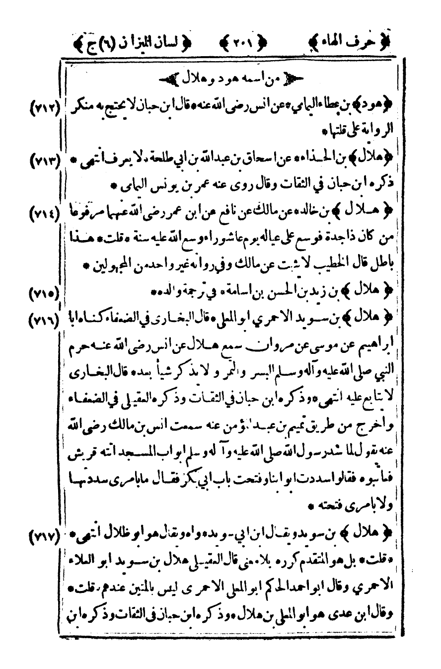[716] "هلال" بن سويد الأحمري أبوالمعلى قال البخاري في الضعفاء كناه أبا إبراهيم عن موسى عن مروان سمع هلال عن أنس رضى الله عنه حرم النبي صلى الله عليه وآله وسلم البسر والتمر ولا يذكر شيئا بعد قال البخاري لا يتابع عليه انتهى وذكره ابن حبان في الثقات وذكره العقيلي في الضعفاء وأخرج من طريق تميم بن عبد المؤمن عنه سمعت أنس بن مالك رضى الله عنه يقول لما سد رسول الله صلى الله عليه وآله وسلم أبواب المسجد أتته قريش فعاتبوه فقالوا سددت أبوابنا وفتحت باب أبي بكر فقال ما بأمري سددتها ولا بأمري فتحته.