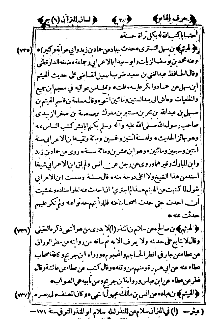 [735] "الهيثم" بن سهل التستري حدث ببغداد عن حماد بن زيد وأبي عوانة وكثير1 وعنه محمد بن يوسف الزيات وأبو سعيد بن الأعرابي وجماعة ضعفه الدارقطني وقال الحافظ عبد الغني بن سعيد ضرب إسماعيل القاضي على حديث الهيثم بن سهل عن حماد وأنكر عليه قلت وقع لنا من عواليه في معجم بن جميع والخلعيات وعاش إلى بعد الستين ومائتين انتهى وقال مسلمة بن قاسم الهيثم بن سهل بن عبد الله بن بحر بن مستنير بن مدرك بن صعصعة بن صخر الزبيدي صاحب رسول الله صلى الله عليه وآله وسلم يكنى أبا بشر كتب الناس عنه وهو جائز الحديث ولد سنة اثنتين وخمسين ومائة ولقيه بن الأعرابي سنة اثنتين وسبعين ومائتين وهو ابن عشرين ومائة سنة روى عن حماد بن زيد وابن المبارك وغيرهما وروى عن رجل عن أنس ولم يلق بن الأعرابي شيخا أسند من هذا الشيخ ولا أعلى درجة منه قال مسلمة وسمعت ابن الأعرابي يقول لما كتبت عن الهيثم هذا لم أجتريء أن أحدث عنه لعلو إسناده وخشيت أن أحدث حتى حدث أصحابنا عنه فلما رأيتهم حدثوا عنه ولم ينكر عليهم حدثت عنه.
