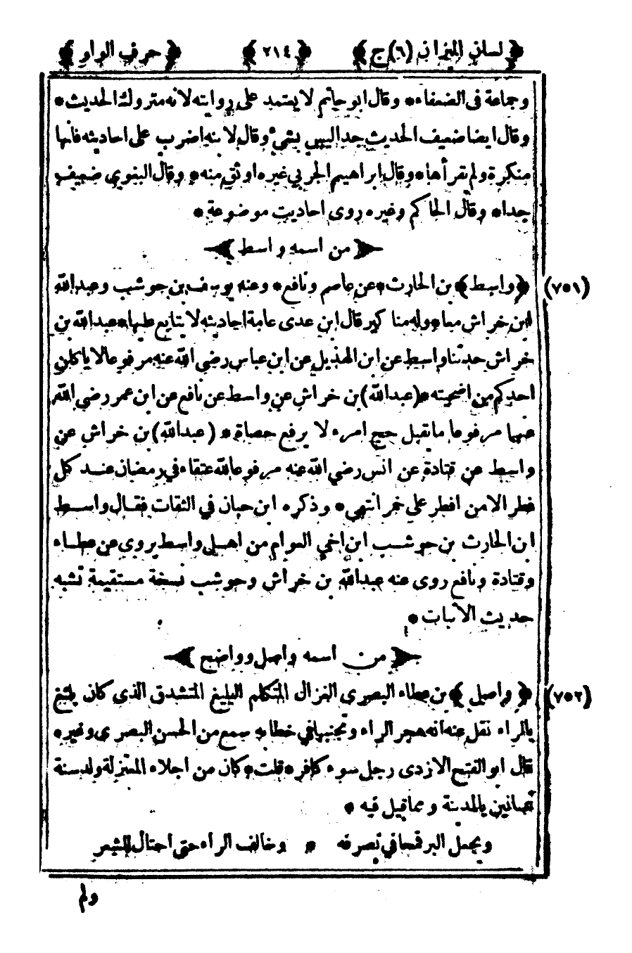 [751] "واسط" بن الحارث عن عاصم ونافع وعنه يوسف بن حوشب وعبد الله بن خراش معا وله مناكير قال ابن عدي عامة أحاديثه لا يتابع عليها عبد الله بن خراش حدثنا واسط عن ابن الهذيل عن ابن عباس رضى الله عنه مرفوعا لا يأكلن أحدكم من أضحيته عبد الله بن خراش عن واسط عن نافع عن ابن عمر رضى الله عنهما مرفوعا ما يقبل حج امرء لا يرفع حصاة عبد الله بن خراش عن واسط عن قتادة عن أنس رضى الله عنه مرفوعا لله عتقاء في رمضان عند كل فطر إلا من أفطر على خمر انتهى وذكره ابن حبان في الثقات فقال واسط بن الحارث بن حوشب بن أخي العوام من أهل واسط يروي عن عطاء وقتادة ونافع روى عنه عبد الله بن خراش وحوشب نسخة مستقيمة تشبه حديث الإثبات.