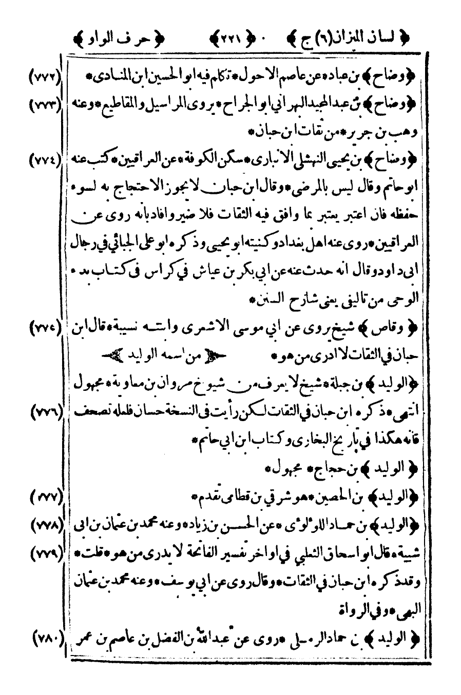 [779] "الوليد" بن حماد اللؤلؤي عن الحسن بن زياد وعنه محمد بن عثمان ابن أبي شيبة قال أبو إسحاق الثعلبي في أواخر تفسير الفاتحة لا يدري من هو قلت وقد ذكره ابن حبان في الثقات وقال روى عن أبي يوسف وعنه محمد بن عثمان البهي وفي الرواة.