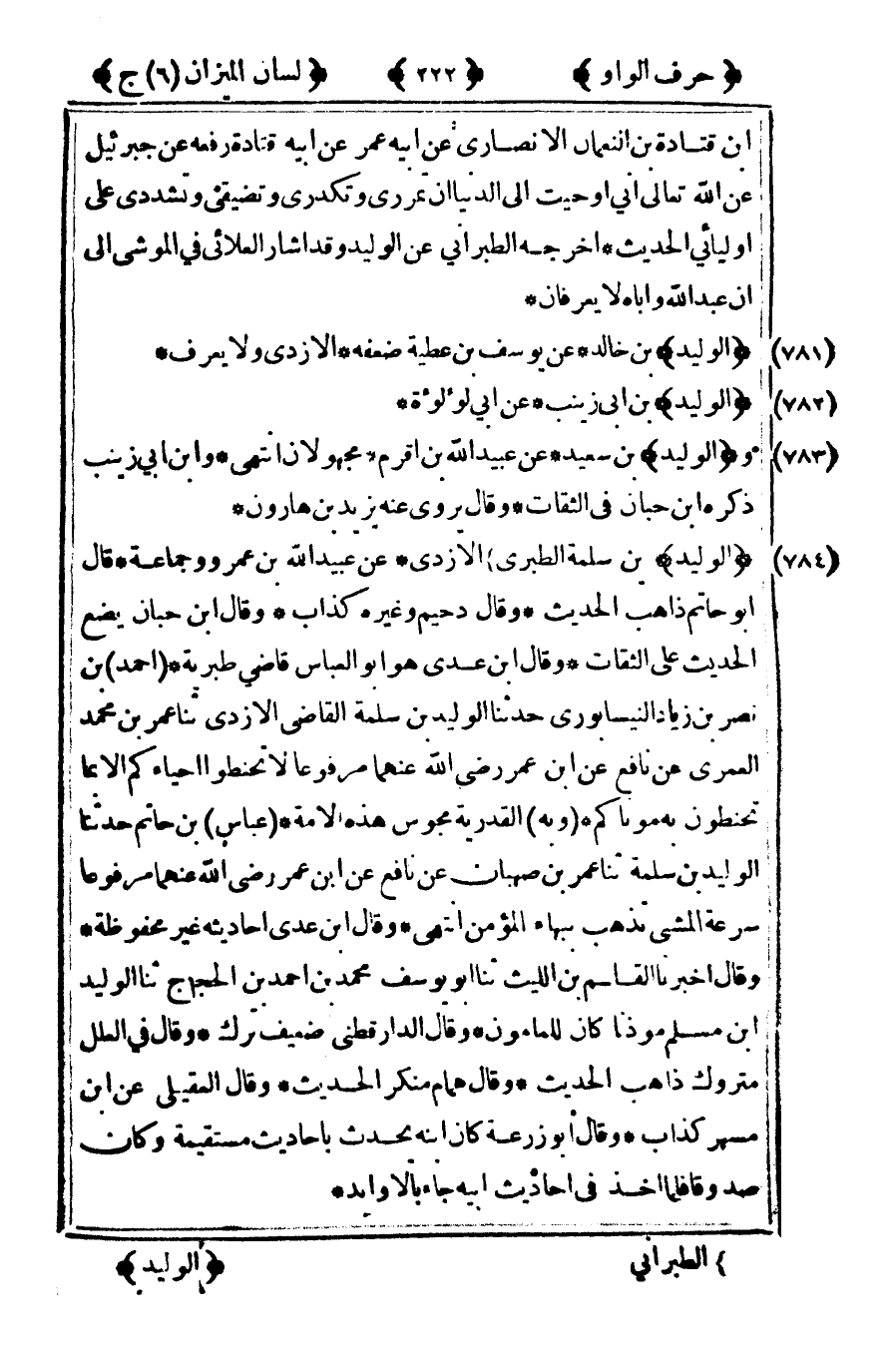 [784] "الوليد" بن سلمة الطبري1 الأزدي عن عبيد الله بن عمرو وجماعة قال أبو حاتم ذاهب الحديث وقال دحيم وغيره كذاب وقال ابن حبان يضع الحديث على الثقات وقال ابن عدي هو ابن العباس قاضي طبرية أحمد بن نصر بن زياد النيسابوري حدثنا الوليد بن سلمة القاضي الأزدي ثنا عمر بن محمد العمري عن نافع عن ابن عمر رضى الله عنهما مرفوعا لا تحنطوا أحياءكم إلا بما تحنطون به موتاكم وبه القدرية مجوس هذه الأمة عباس بن حاتم حدثنا الوليد بن سلمة ثنا عمر بن صهبان عن نافع عن ابن عمر رضى الله عنهما مرفوعا سرعة المشي تذهب ببهاء المؤمن انتهى وقال ابن عدي أحاديثه غير محفوظة وقال أخبرنا القاسم بن الليث ثنا أبو يوسف محمد بن أحمد بن الحجاج ثنا الوليد بن مسلم موذنا كان للمأمون وقال الدارقطني ضعيف ترك وقال في العلل متروك ذاهب الحديث وقال همام منكر الحديث وقال العقيلي عن ابن مسهر كذاب وقال أبو زرعة كان ابنه يحدث بأحاديث مستقيمة وكان صدوقا فلما أخذ في أحاديث أبيه جاءنا بالأوابد.