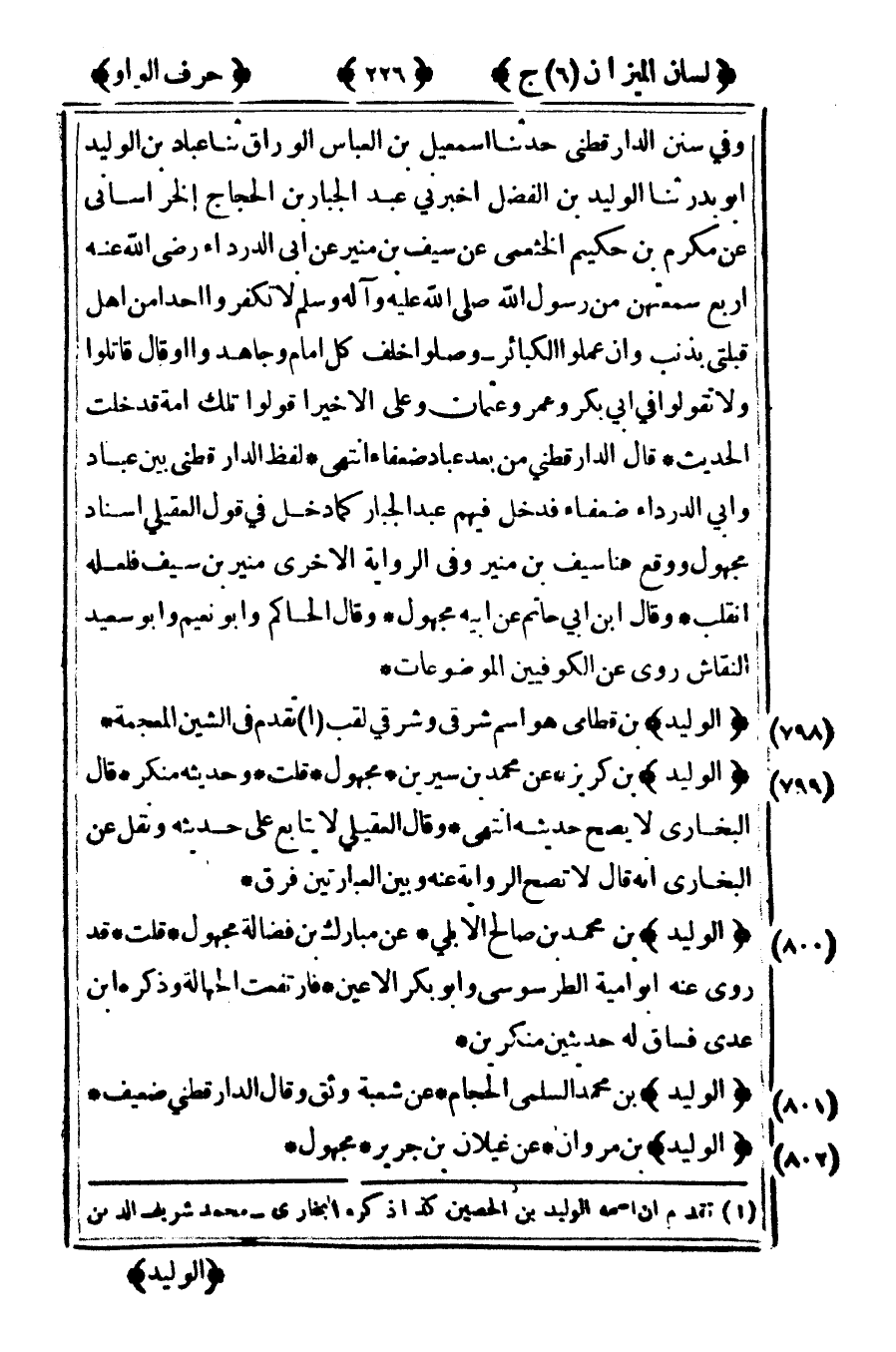 [800] "الوليد" بن محمد بن صالح الأبلي عن مبارك بن فضالة مجهول قلت قد روى عنه أبو أمية الطرسوسي وأبو بكر الأين فارتفعت الجهالة وذكره ابن عدي فساق له حديثين منكرين.