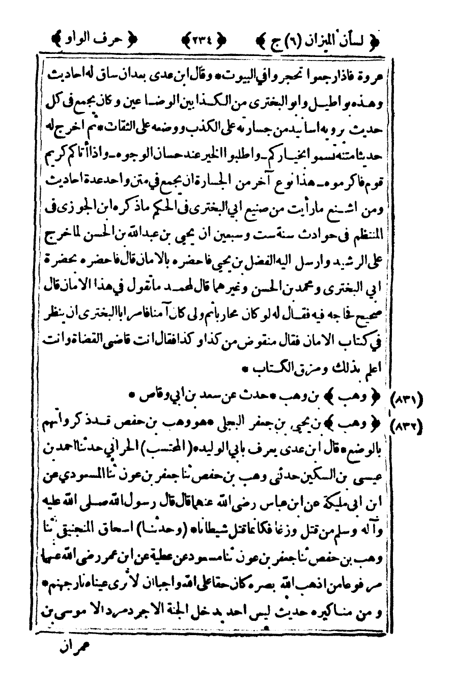 [832] "وهب" بن يحيى بن جعفر البجلي هو وهب بن حفص قد ذكر واتهم بالوضع قال ابن عدي يعرف بأبي الوليد المحتسب الحراني حدثنا أحمد بن عيسى بن السكين حدثني وهب بن حفص ثنا جعفر بن عون ثنا المسعودي عن ابن أبي مليكة عن ابن عباس رضى الله عنهما قال: قال رسول الله صلى الله عليه وآله وسلم من قتل وزغا فكأنما قتل شيطانا وحدثنا إسحاق المنجنيقي ثنا وهب بن حفص ثنا جعفر بن عون ثنا مسعود عن عطية عن ابن عمر رضى الله عنهما مرفوعا من اذهب الله بصره كان حقا على الله واجبا أن لا ترى عيناه نار جهنم ومن مناكيره حديث ليس أحد يدخل الجنة إلا جرد مرد إلا موسى بن