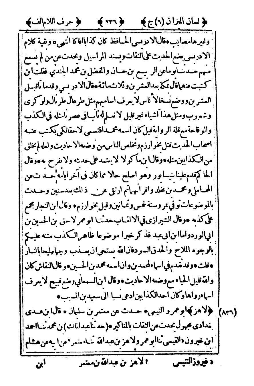 [836] "لاهز" أبو عمرو التيمي حدث عن معتمر بن سليمان قال ابن عدي بغدادي مجهول يحدث عن الثقات بالمناكير حدثنا عبد الملك بن محمد ثنا أحمد بن خيرون1 القيسي ثنا أبو عمرو ولاهز بن عبد الله ثنا معتمر2 عن أبيه عن هشام