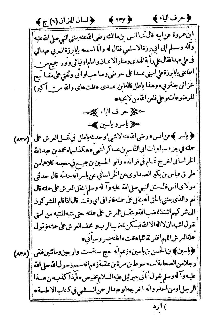 [837] " ياسر" عن أنس رضى الله عنه لا شيء وحديثه باطل في ثقل العرش على حملته في جزء سباعيات أبي القاسم بن عساكر انتهى هكذا سماه محمد بن عبد الله الخراساني أخرج تمام في فوائده وأبو الحسين بن جميع في معجمه كلاهما من طريق عباس بن بكير الصيداوي عن الخراساني عن ياسر أنه حدثه قال حدثني مولاي أنس قال سئل النبي صلى الله عليه وآله وسلم أيثقل العرش على حملته قال "نعم والذي بعثني بالحق أنه يثقل على حملته" قالوا في أي وقت قال "إذا قام المشركون إلى شركهم اشتد غضب الله ويثقل العرش على حملته حتى ينتبه المنتبه من أمتي يقول أشهد أن لا إله إلا الله فيسكن غضب الرب ويخف العرش على حملته فيقول حملة العرش اللهم اغفر لقائلها قلت أظنه يسر وسيأتي".