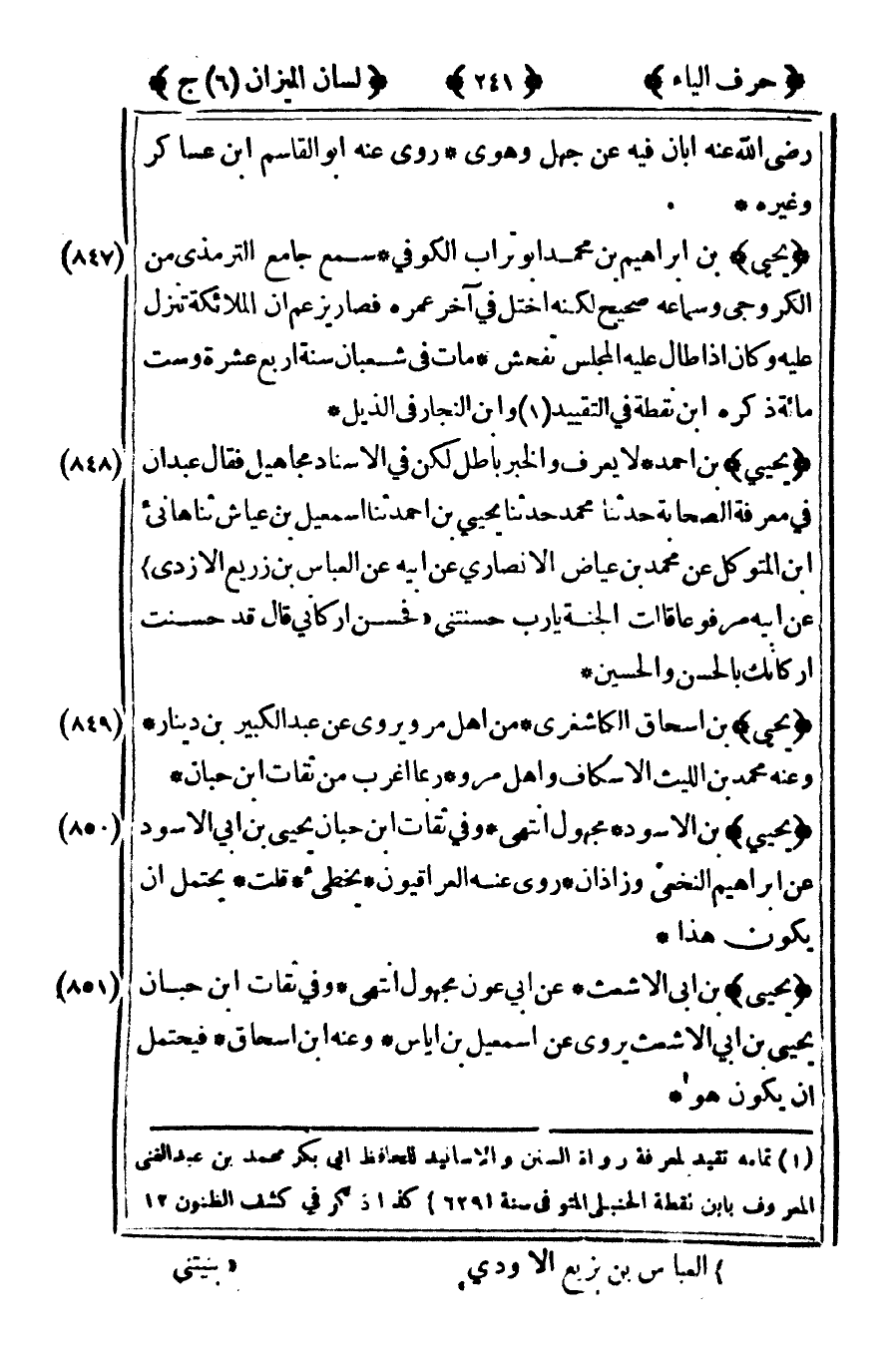 [847] "يحيى" بن إبراهيم بن محمد أبو تراب الكوفي سمع جامع الترمذي من الكروجي وسماعه صحيح لكنه اختل في آخر عمره فصار يزعم أن الملائكة تنزل عليه وكان إذا طال عليه المجلس تفحش مات في شعبان سنة أربع عشرة وست مائة ذكره ابن نقطة في التقييد1 وابن النجار في الذيل.